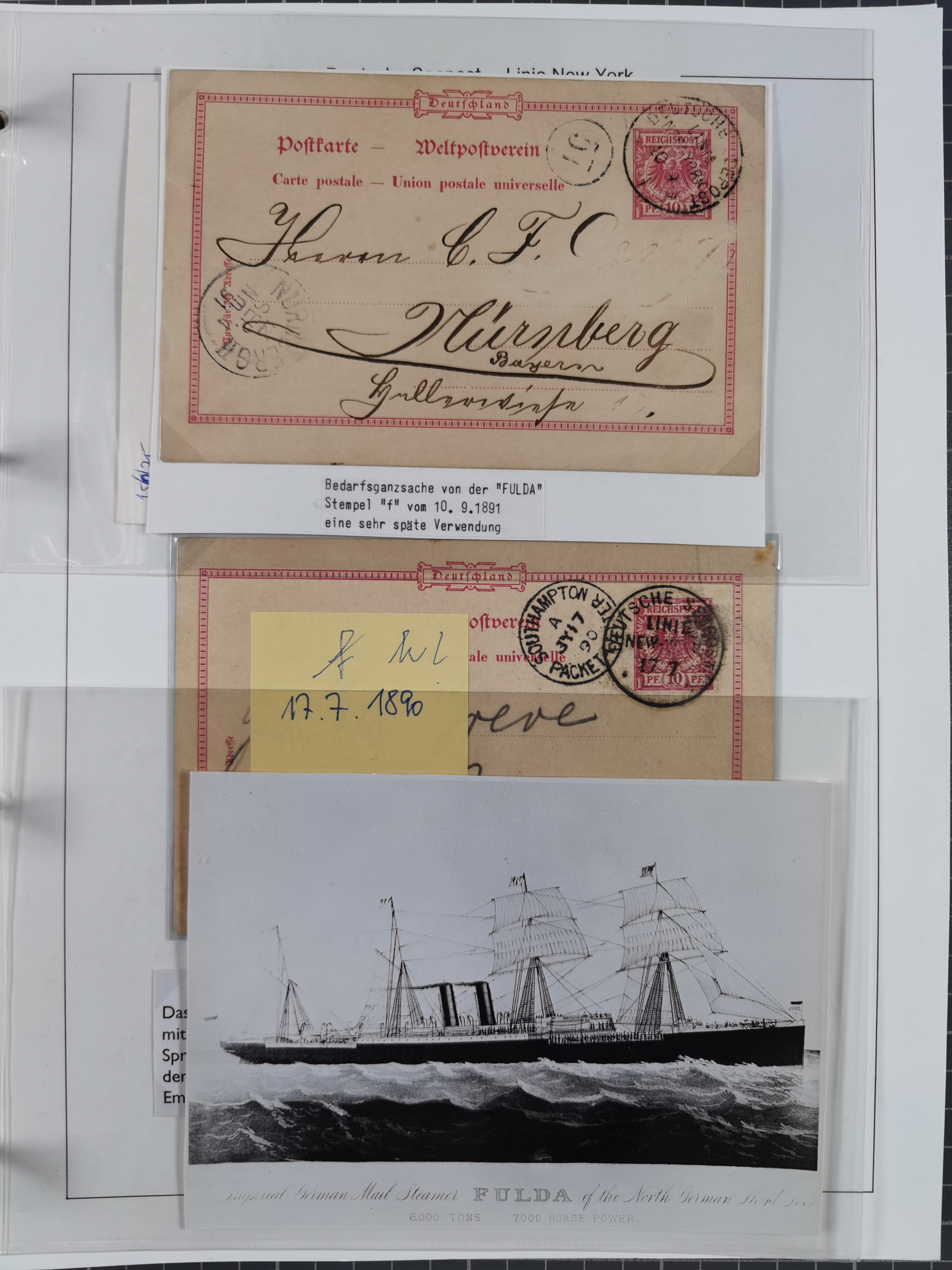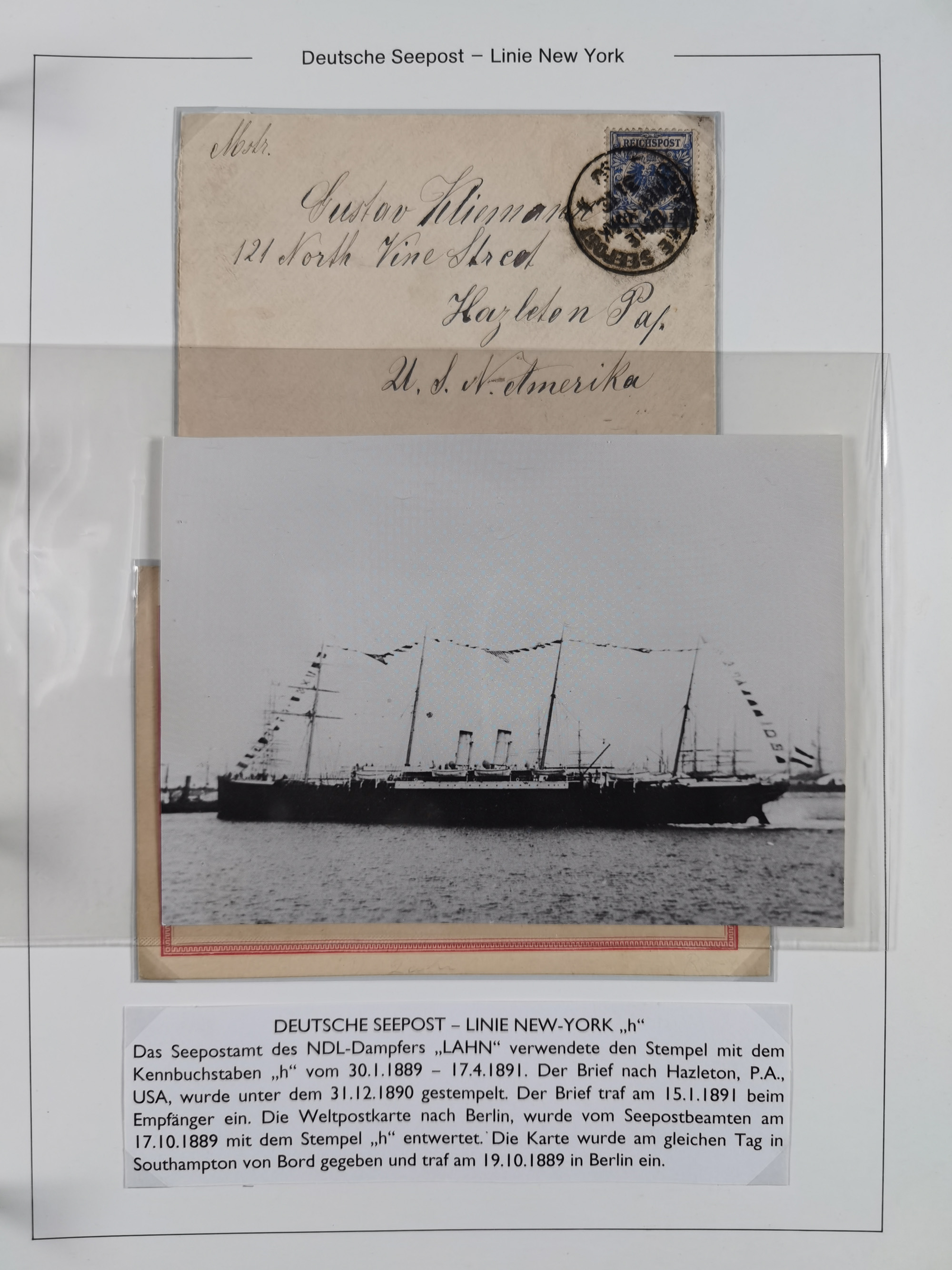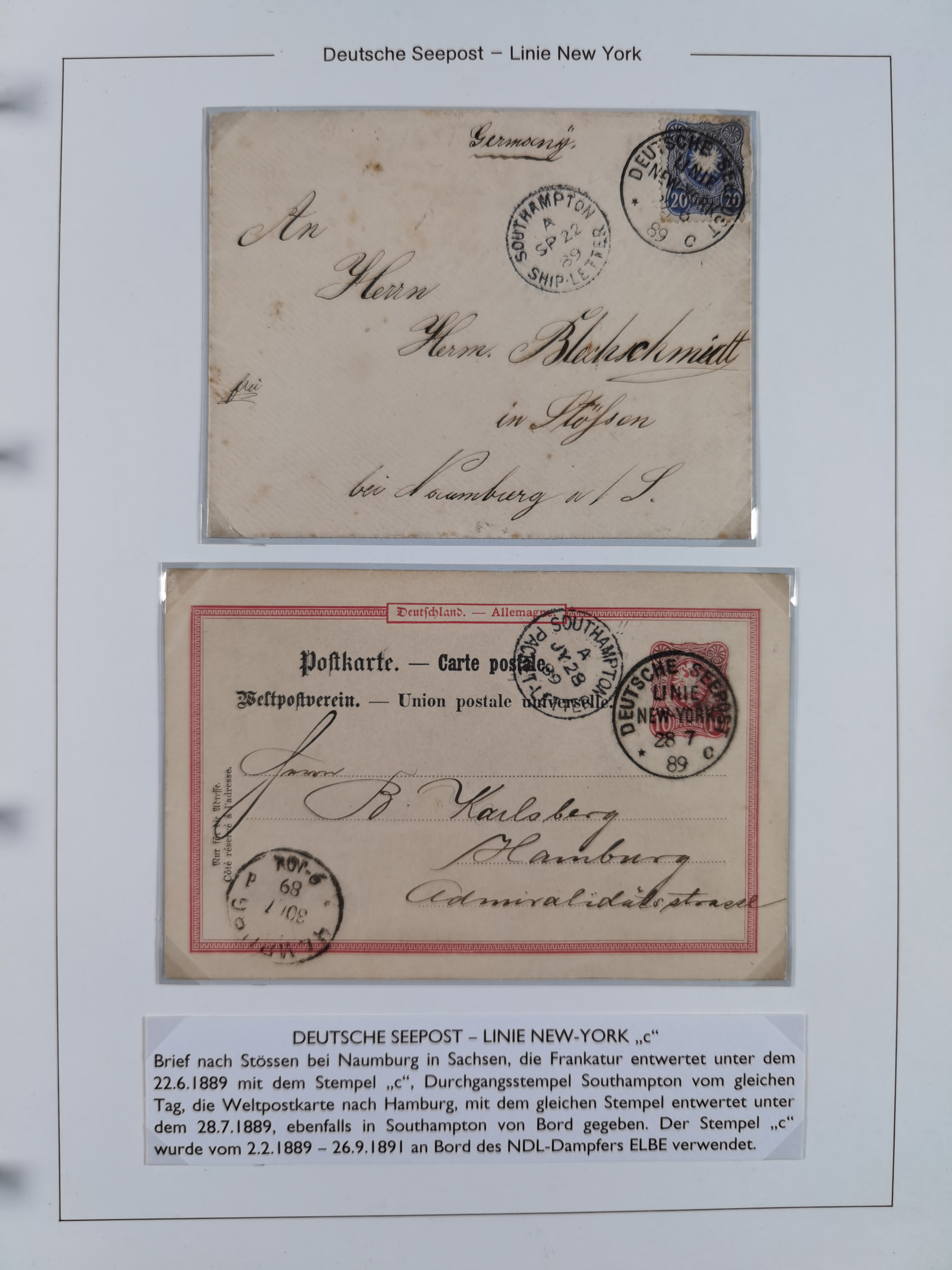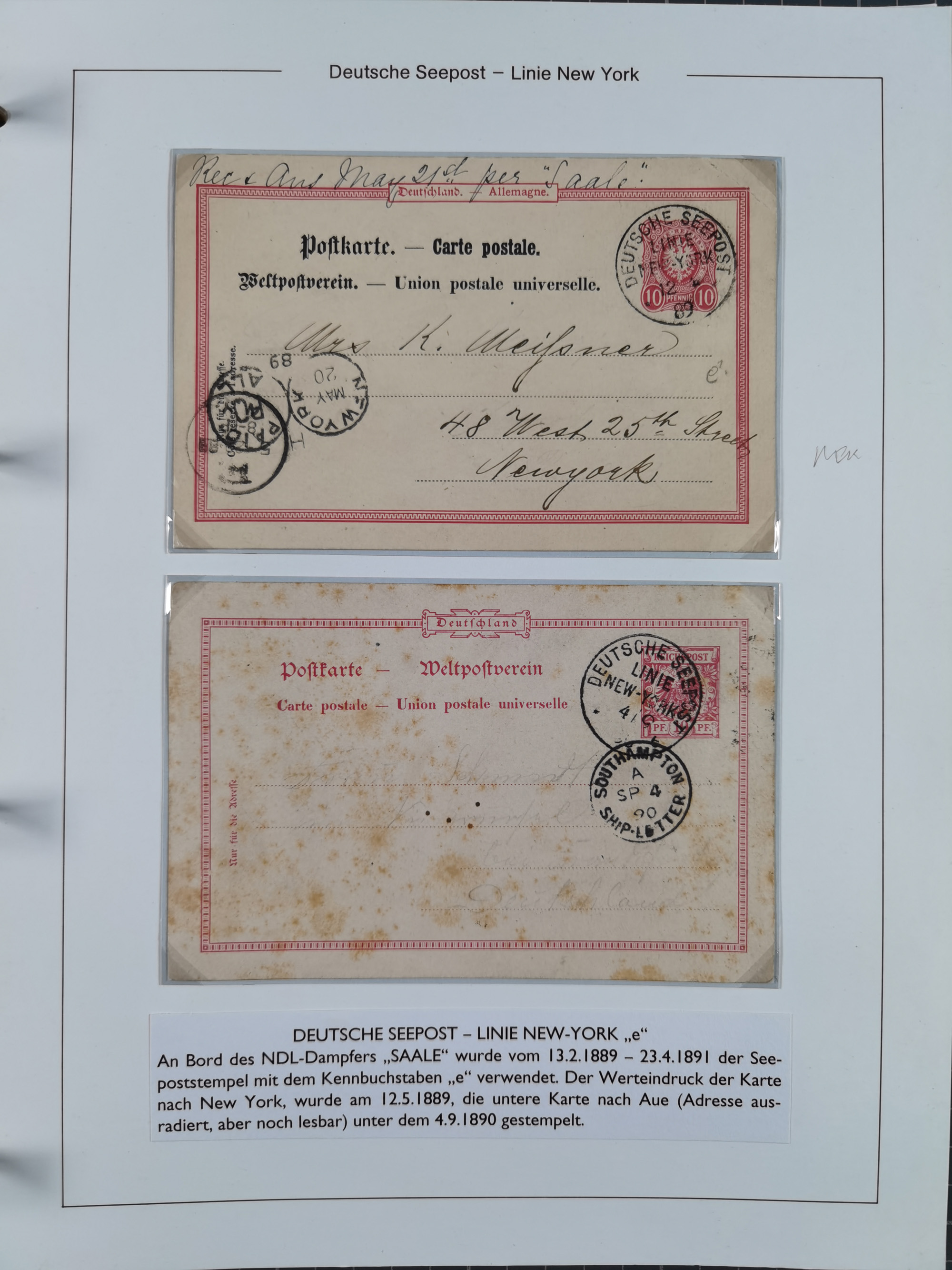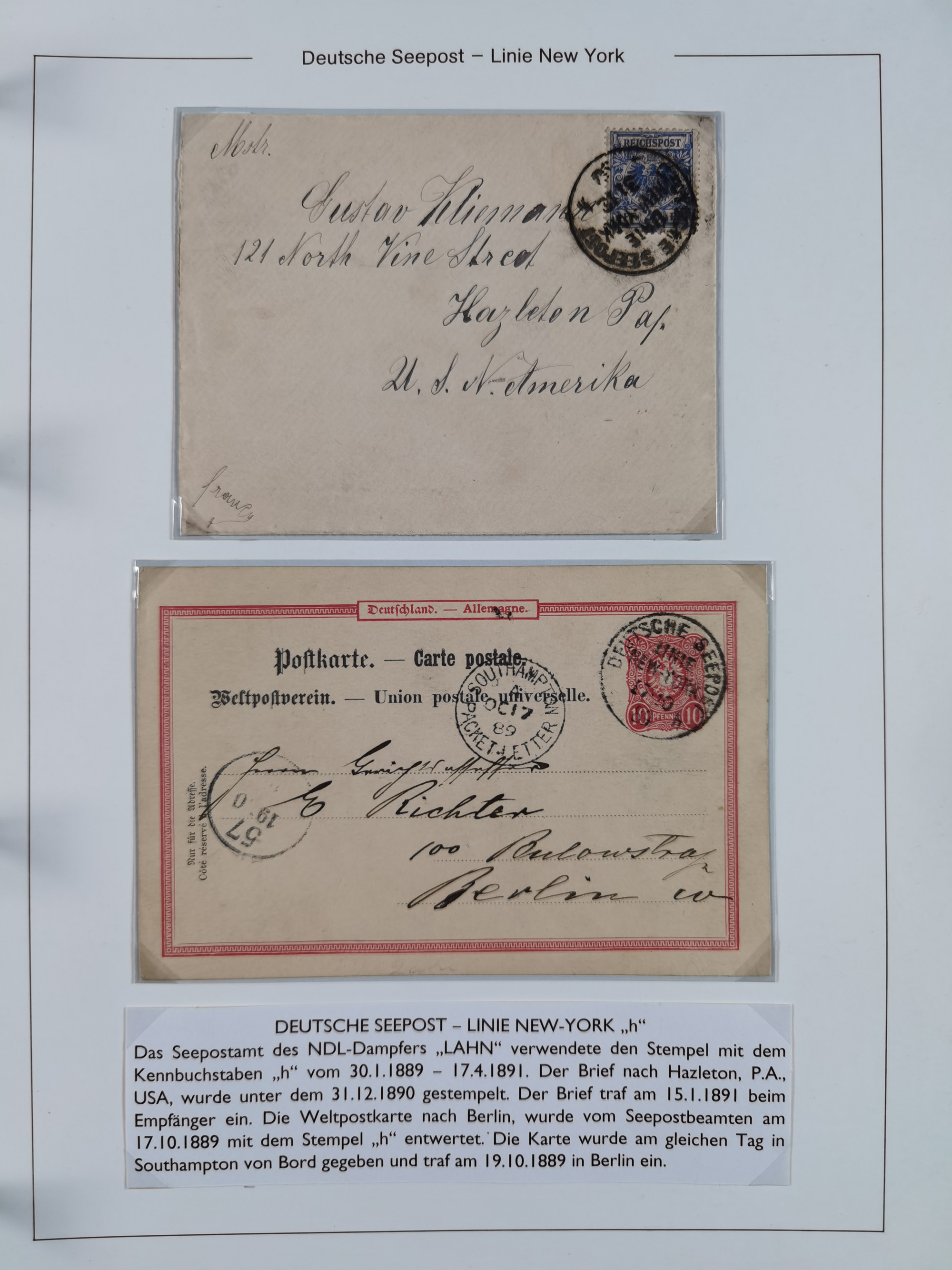 1889/91, Sammlung “DSP LINIE NEW YorK” mit Unterscheidungsbuchstaben “a” bis “l” mit 36 Briefen und GSK mit durchgehend klaren Abschlägen, oft mit Beschreibung der verschiedenen Dampfer. Meist in guter Erhaltung, in dieser Art recht selten, ex Steinmeyer