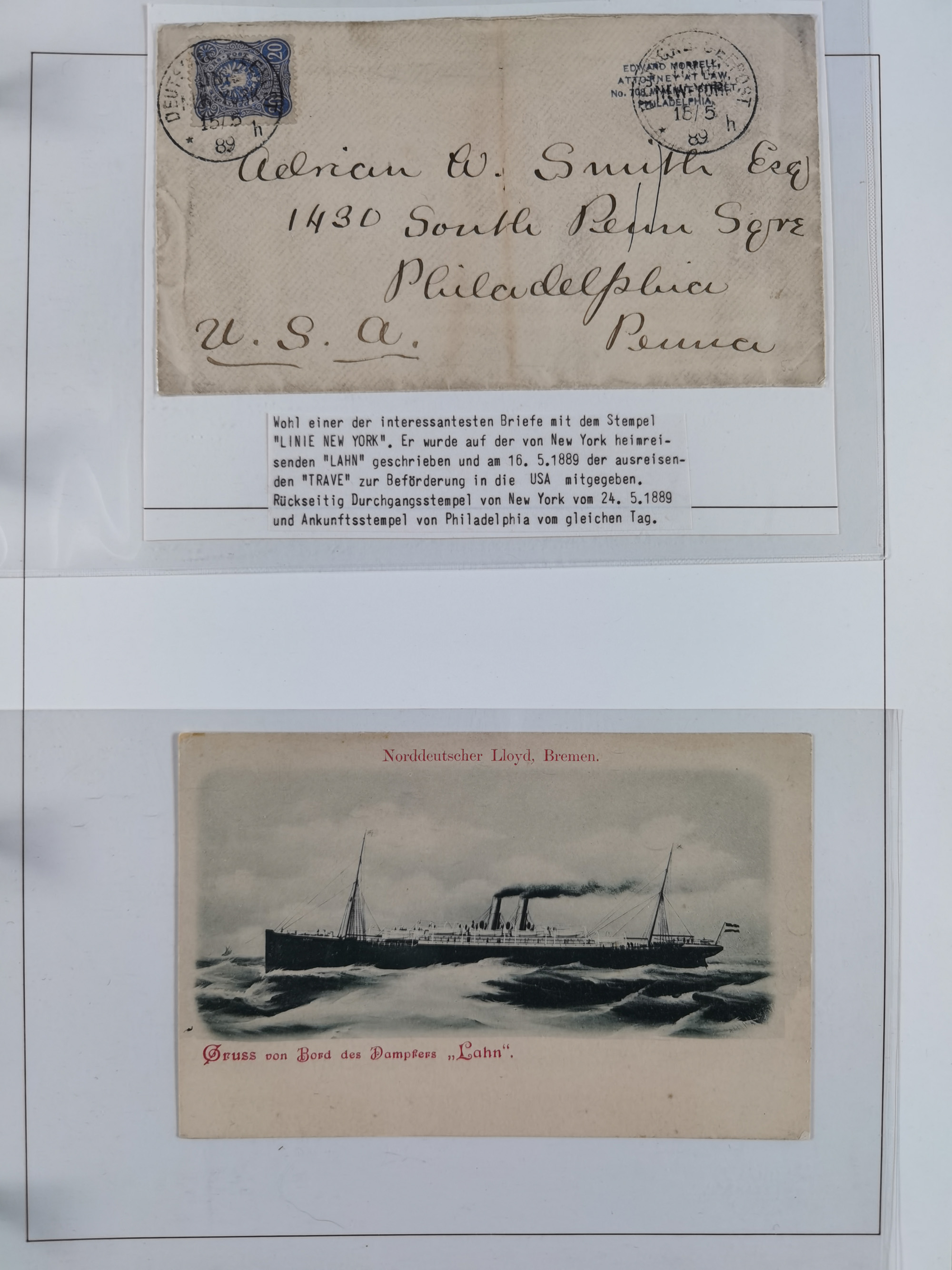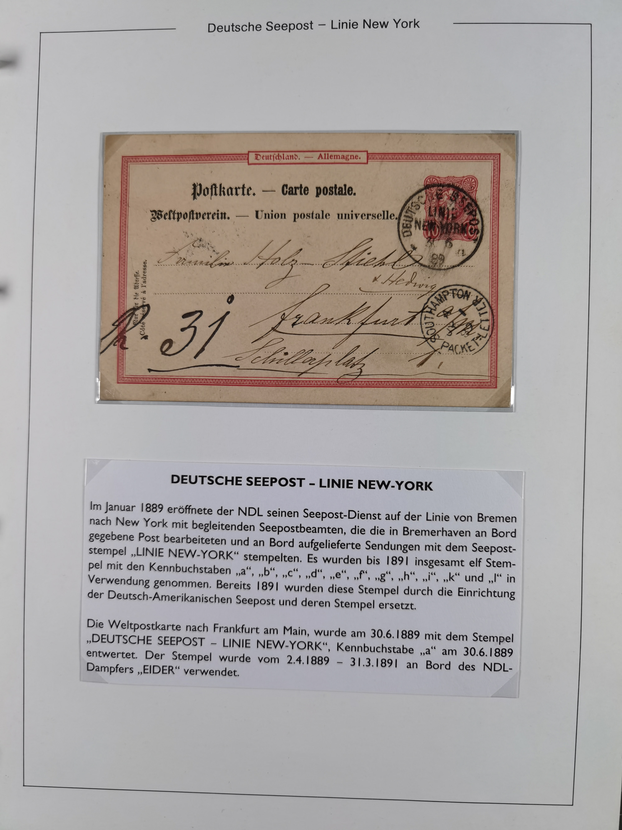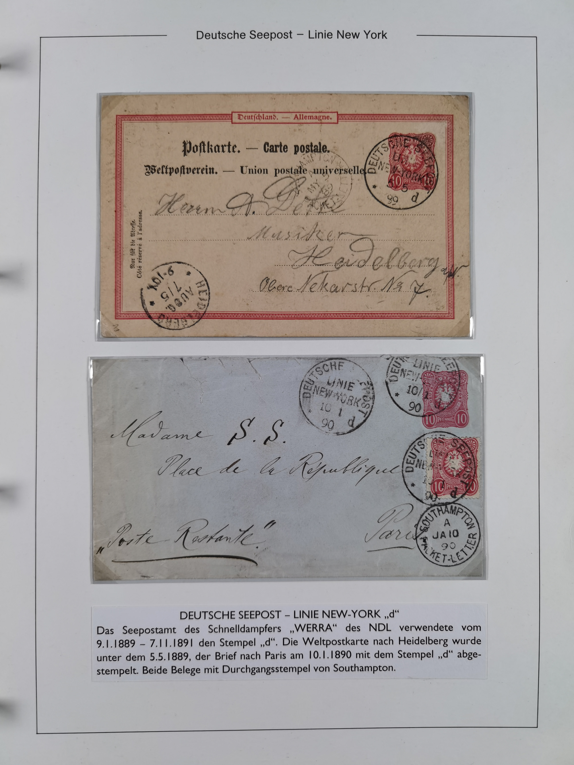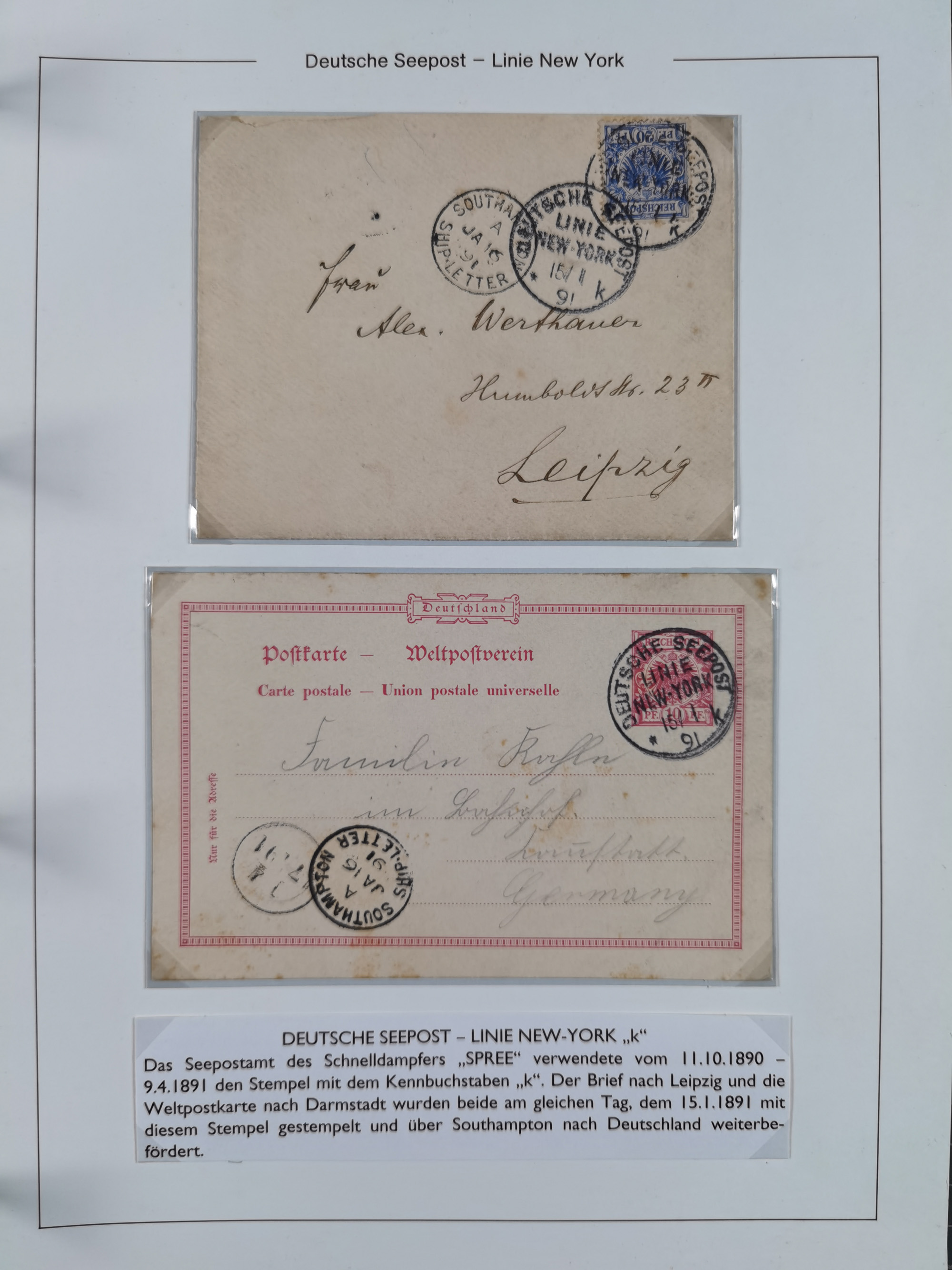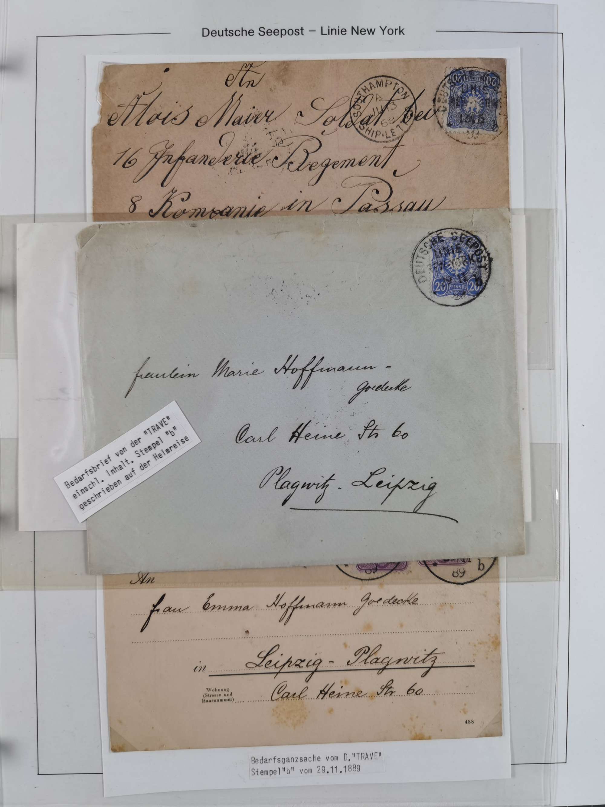 1889/91, Sammlung “DSP LINIE NEW YorK” mit Unterscheidungsbuchstaben “a” bis “l” mit 36 Briefen und GSK mit durchgehend klaren Abschlägen, oft mit Beschreibung der verschiedenen Dampfer. Meist in guter Erhaltung, in dieser Art recht selten, ex Steinmeyer