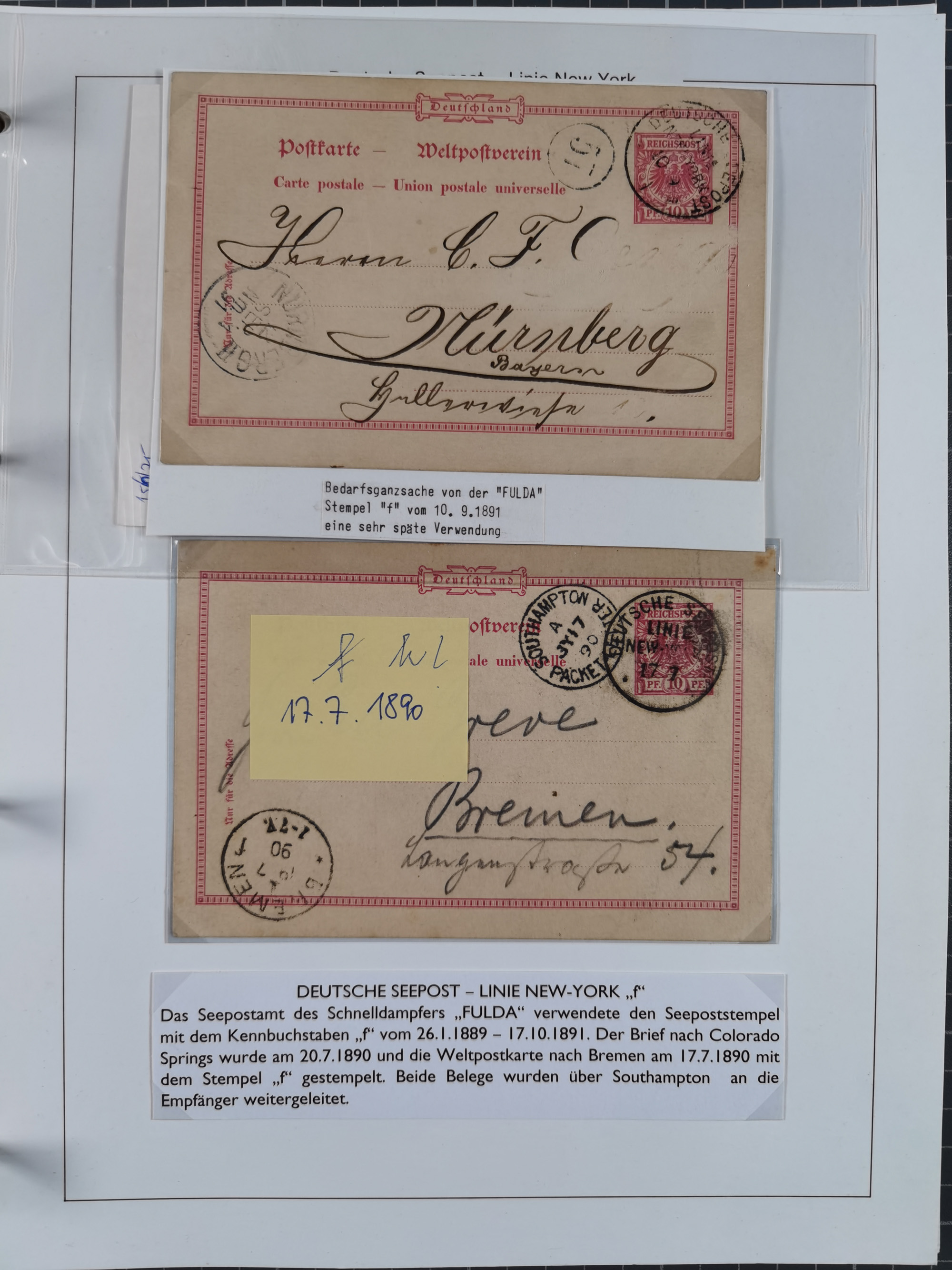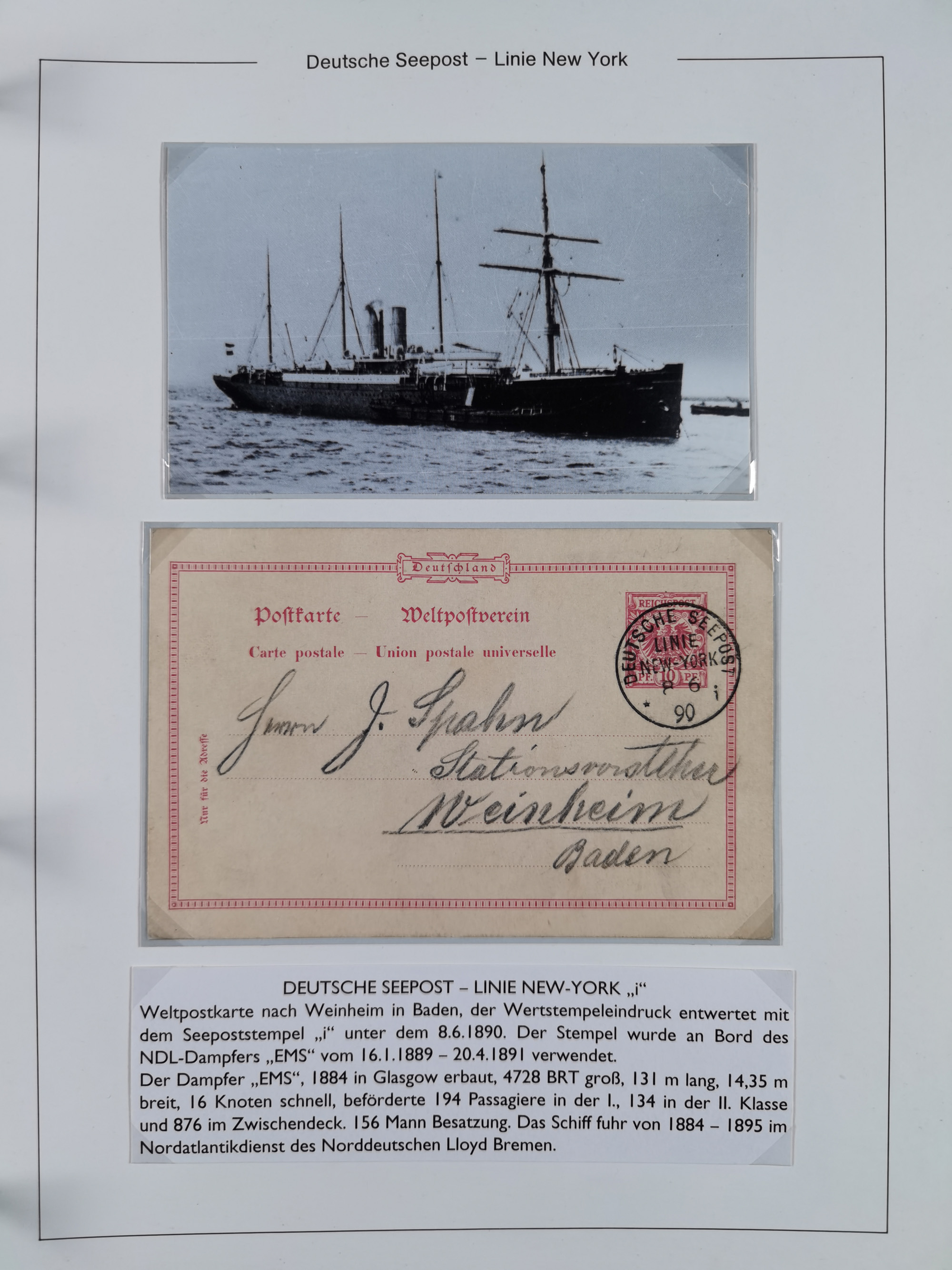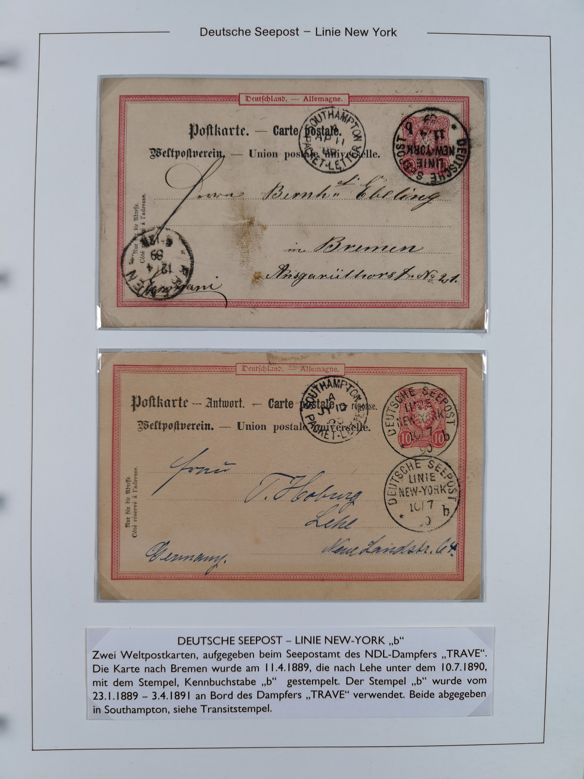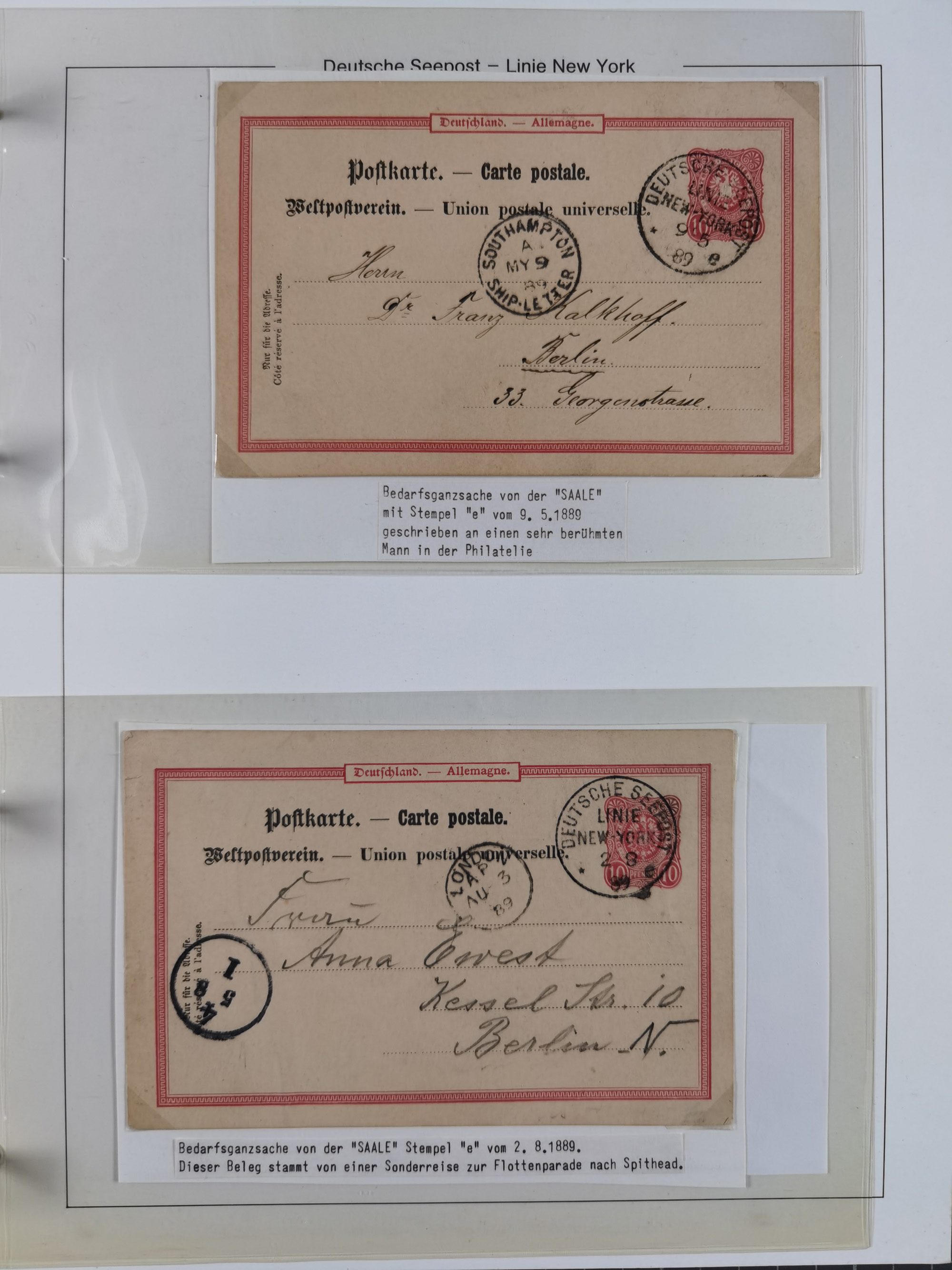 1889/91, Sammlung “DSP LINIE NEW YorK” mit Unterscheidungsbuchstaben “a” bis “l” mit 36 Briefen und GSK mit durchgehend klaren Abschlägen, oft mit Beschreibung der verschiedenen Dampfer. Meist in guter Erhaltung, in dieser Art recht selten, ex Steinmeyer