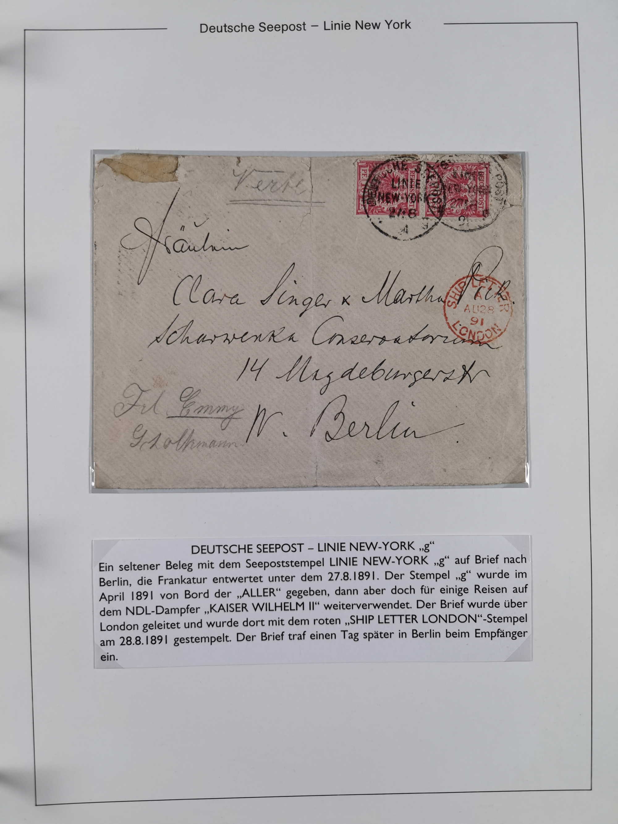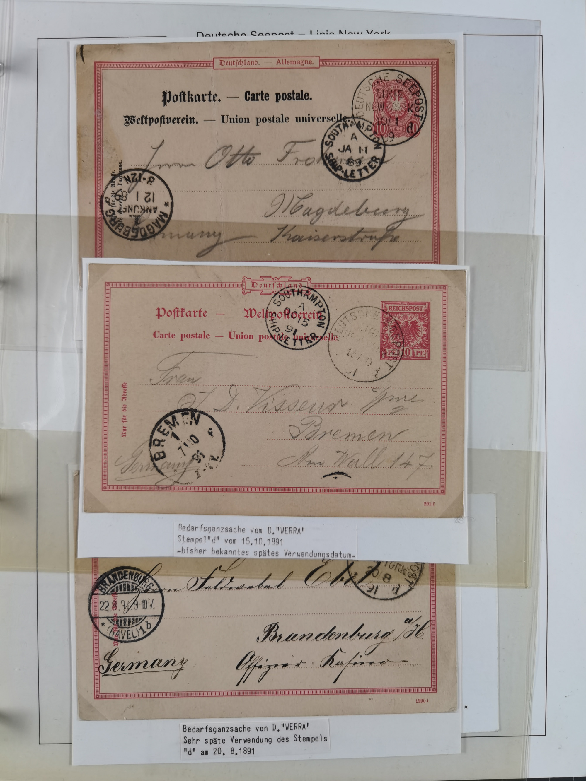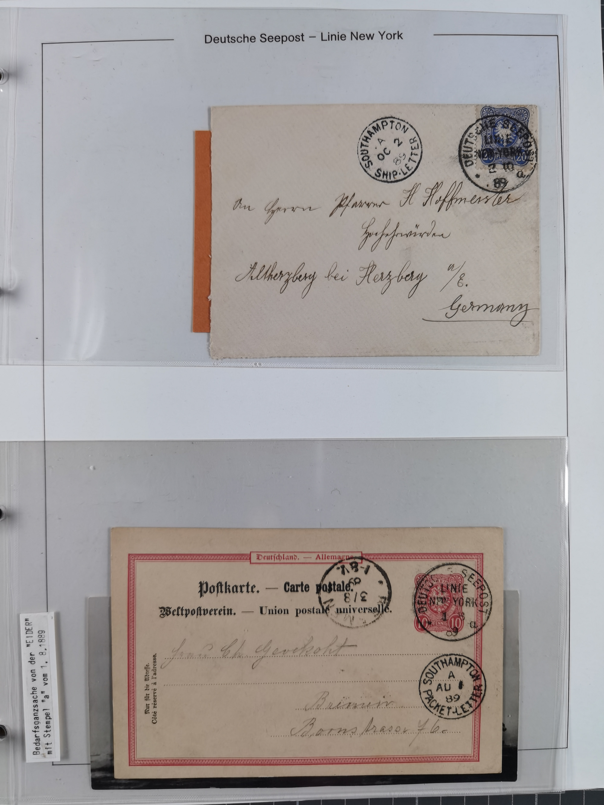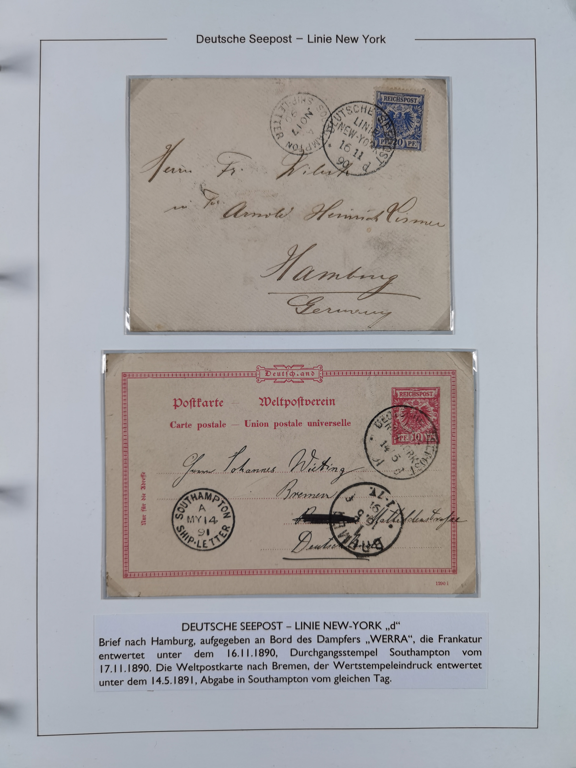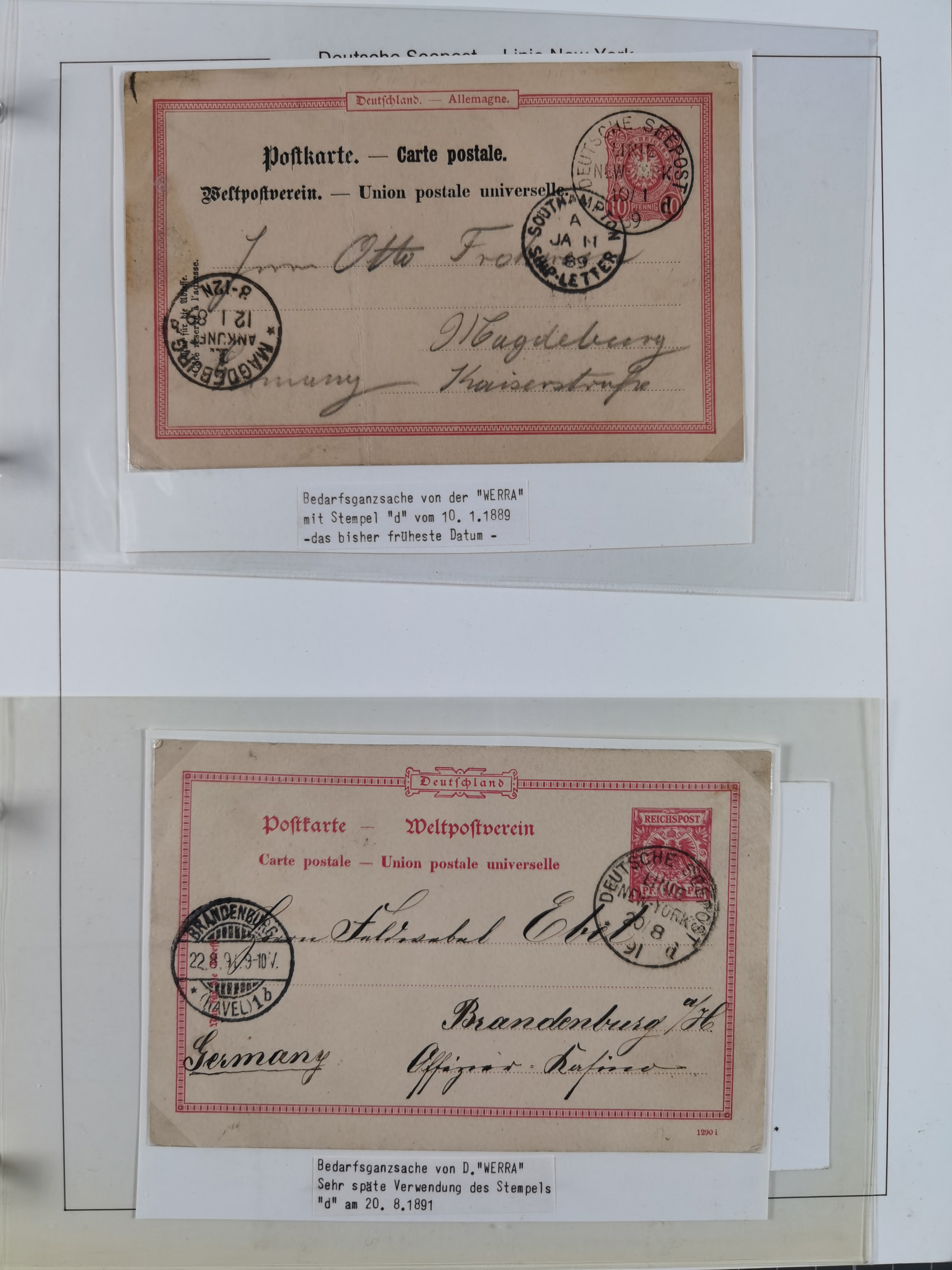 1889/91, Sammlung “DSP LINIE NEW YorK” mit Unterscheidungsbuchstaben “a” bis “l” mit 36 Briefen und GSK mit durchgehend klaren Abschlägen, oft mit Beschreibung der verschiedenen Dampfer. Meist in guter Erhaltung, in dieser Art recht selten, ex Steinmeyer