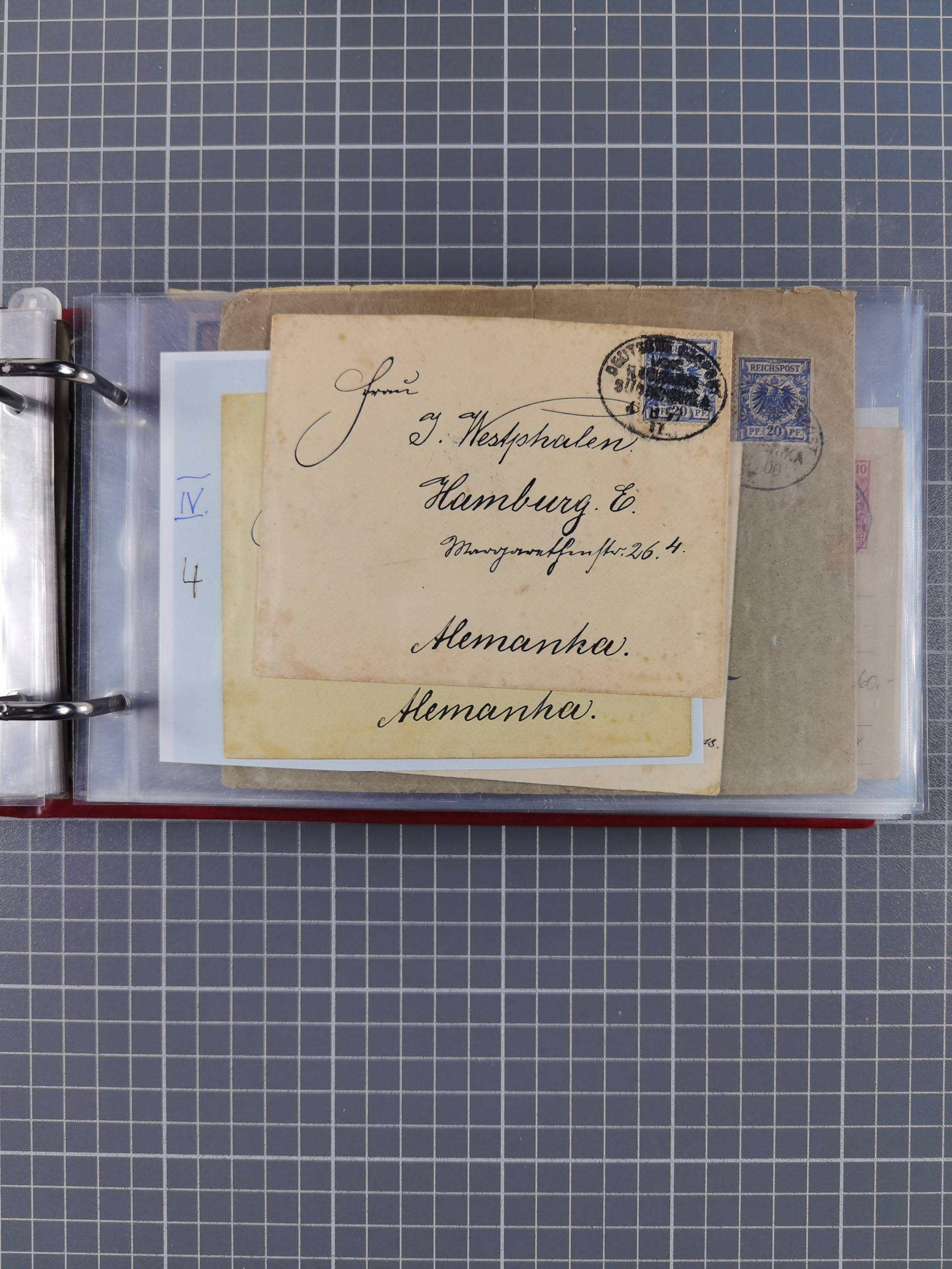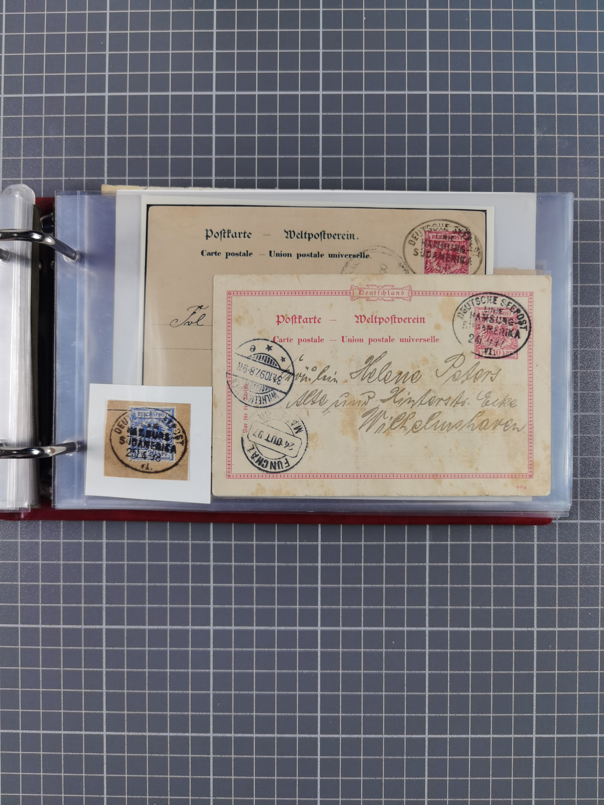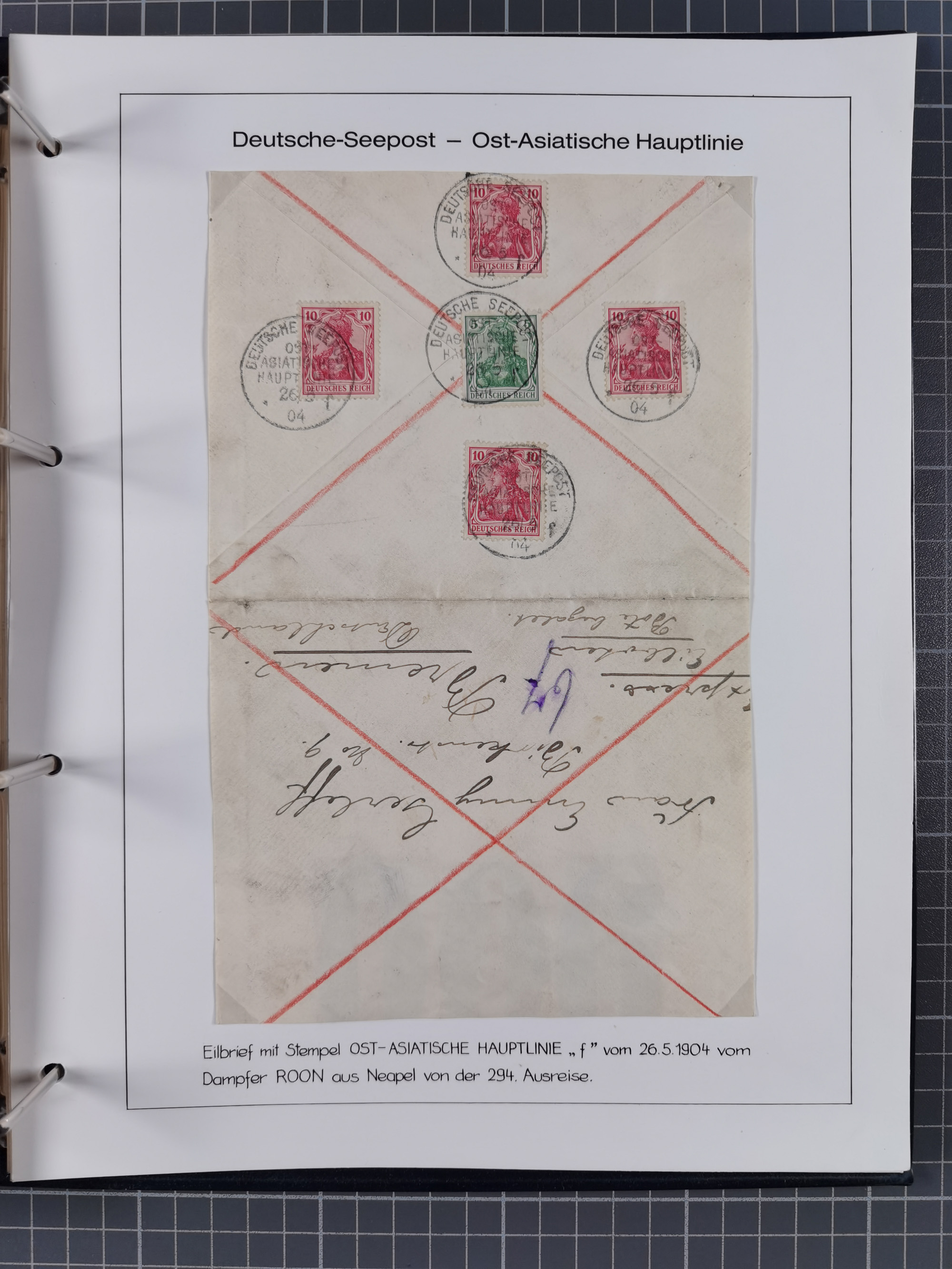 “DSP SYDNEY-HONGKONG *a 18.,4.04” (D. Medan), viermla klar auf vier Einzelmarken Germania 5 Pfg. als tarifgerechte Mehrfachfrankatur auf Brief nach Alzey mit Ankunftsstempel. Die Marken zum Teil mit Gelbflecken, ansonsten in guter Erhaltung. Ein seltener Schiffspoststempel aus der Südsee