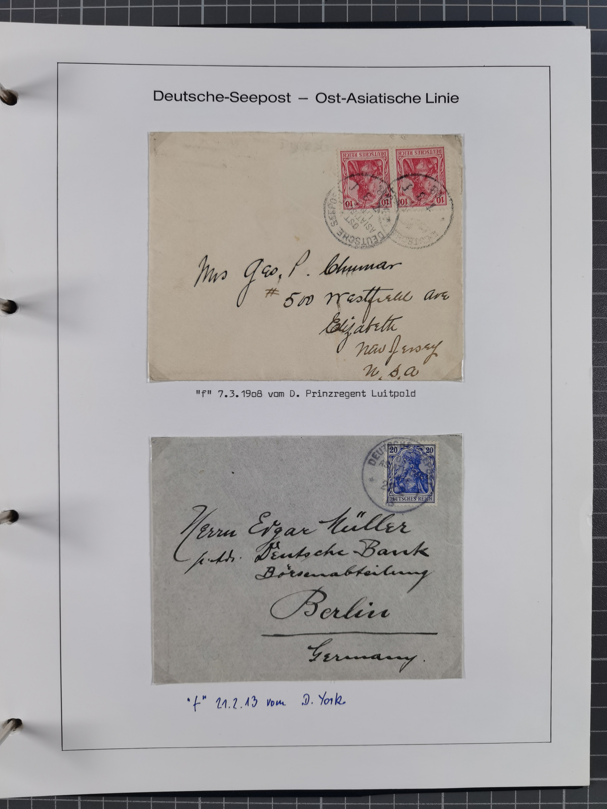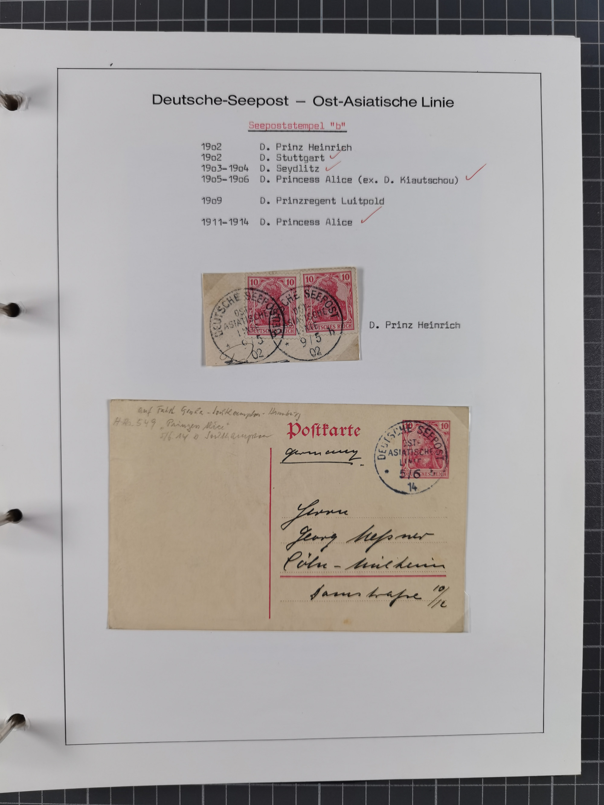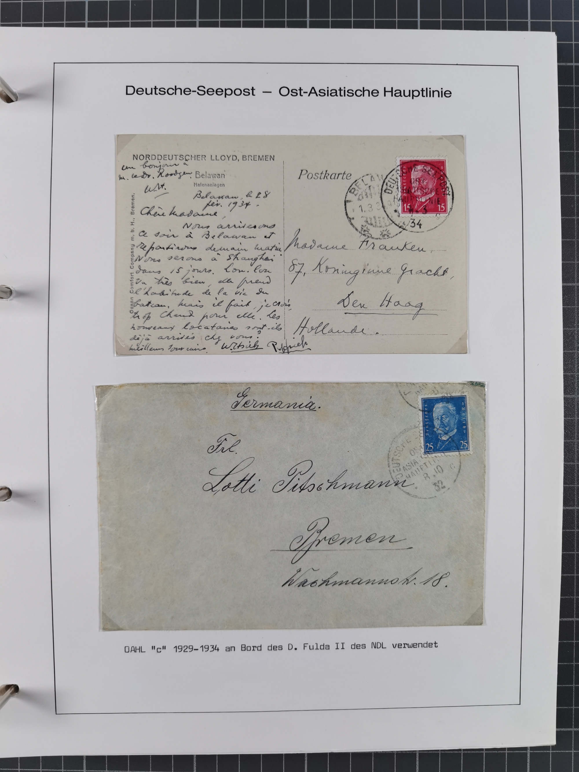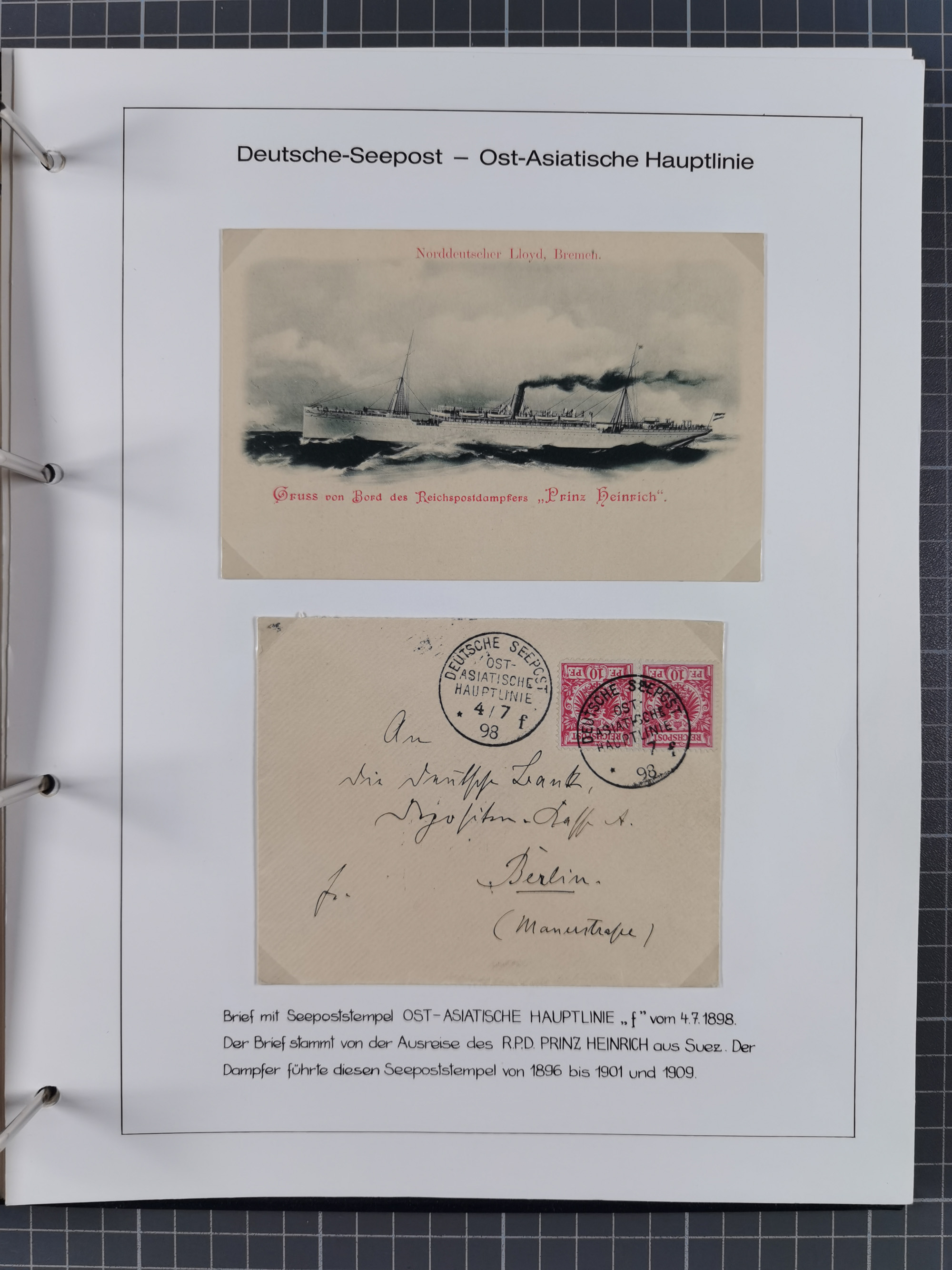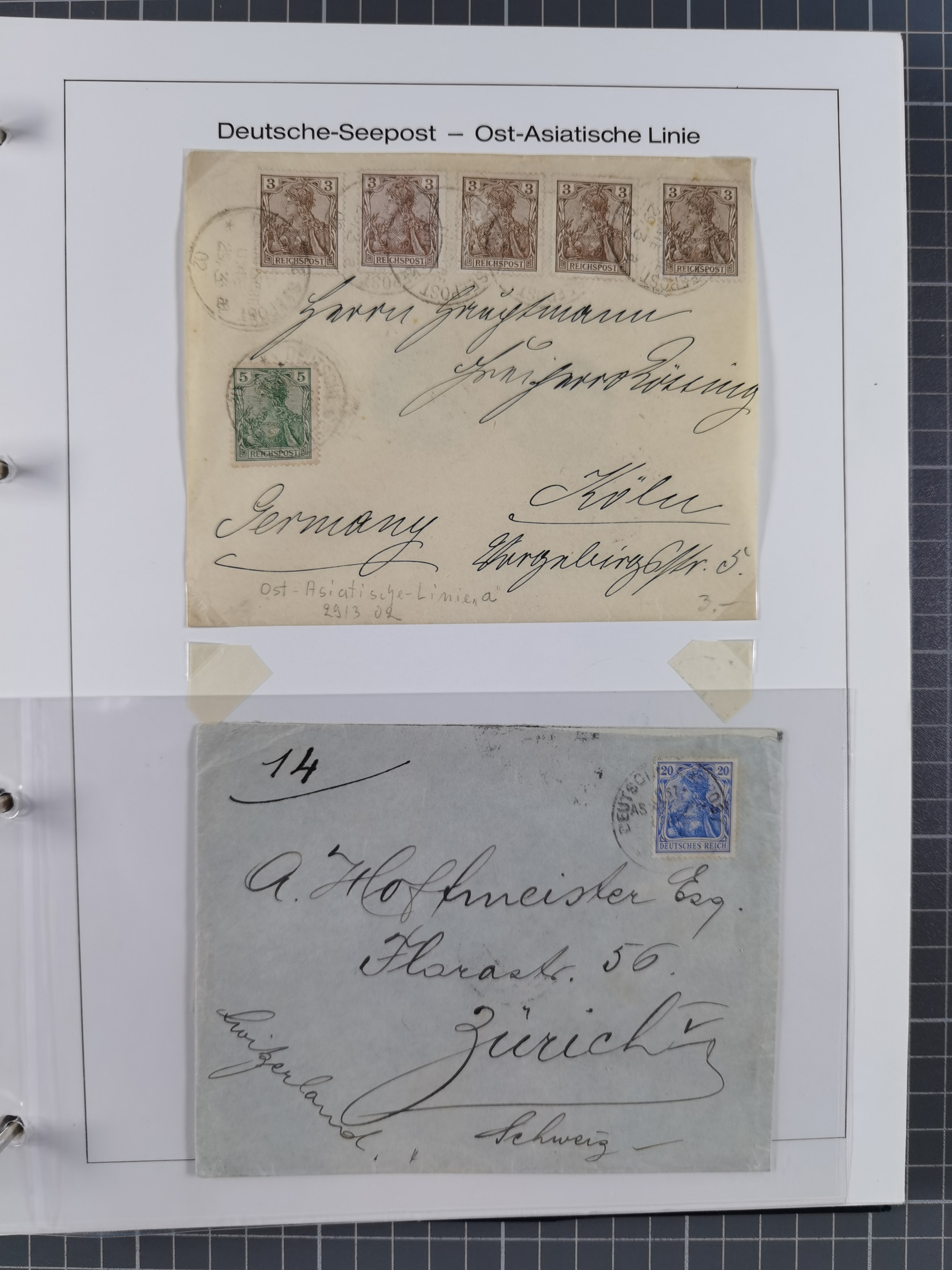 1887/1938, Sammlung “OST-ASIATISCHE HAUPTLINIE” und “OST-ASIATISCHE LINIE” mit ca. 120 Briefen, Karten und GSK, dabei frühe Post mit Aufgabe-Vermerken und R-Briefvorderseite 1905 mit R-Zettel “Deutsch Seepost…” und Ra2 “Reichspostdampfer Prinze Heinrich”. Fast durchgehen in guter Erhaltung und meist auf Albenblättern mit Beschriftung, ex Steinmeyer