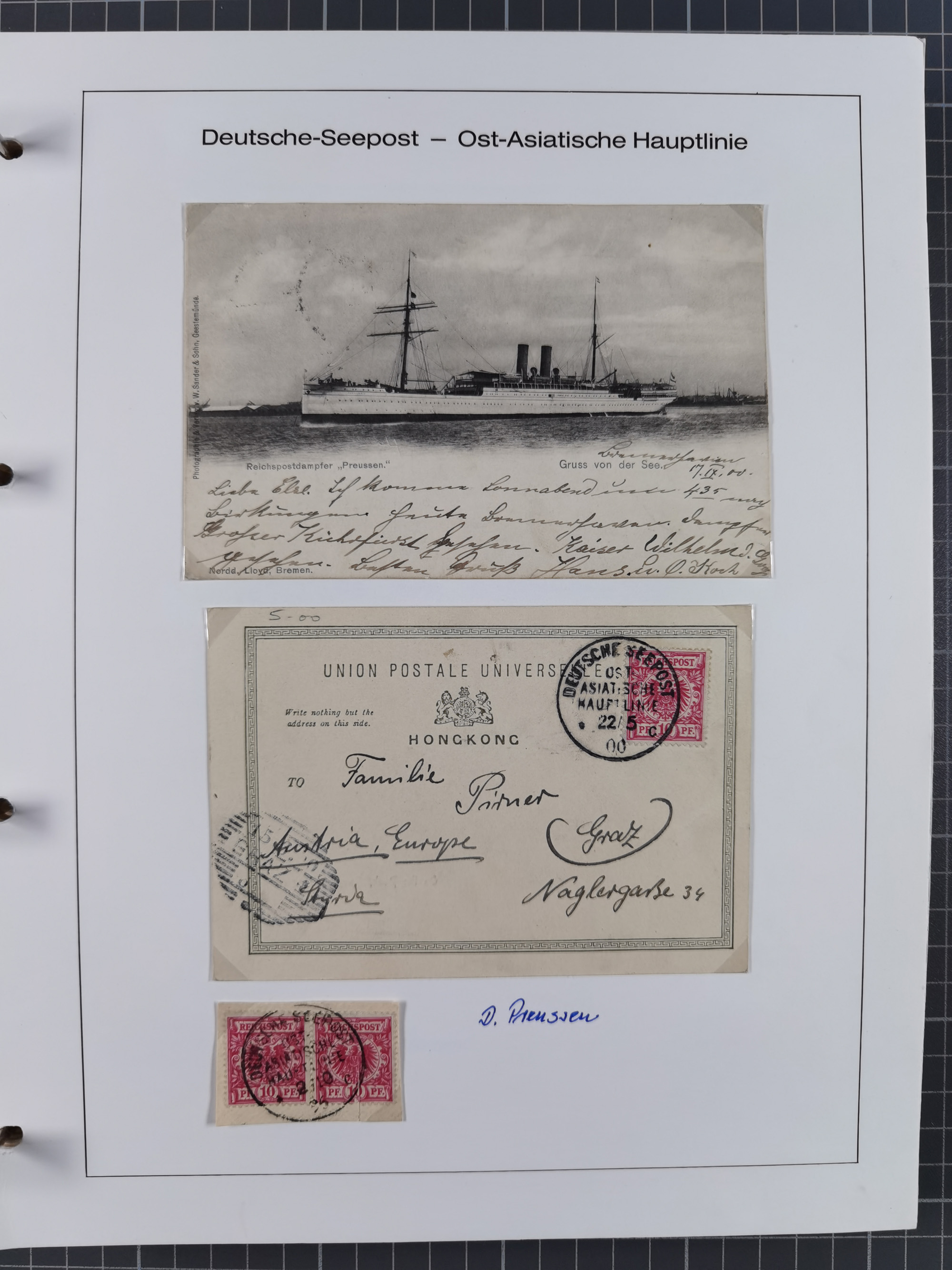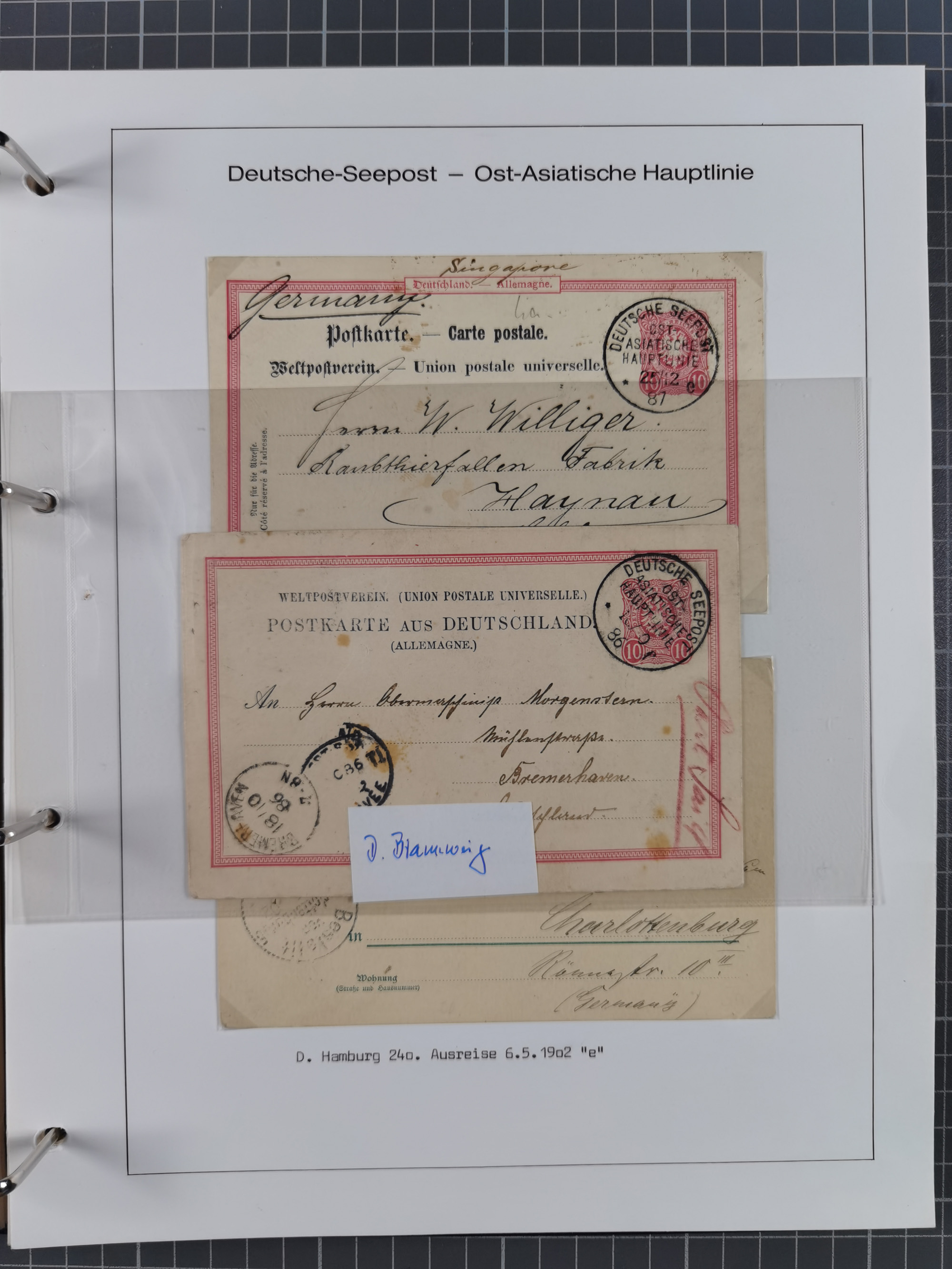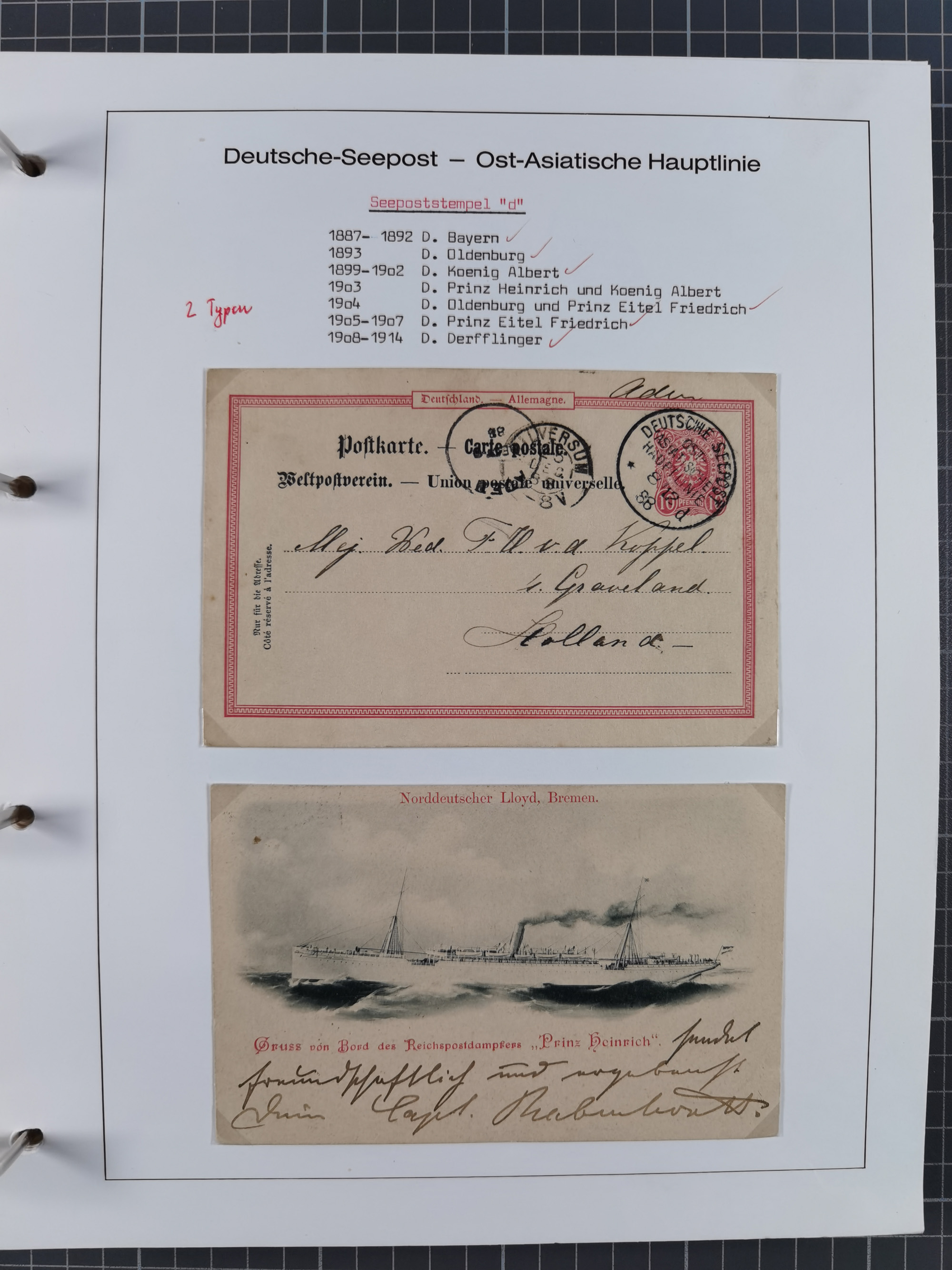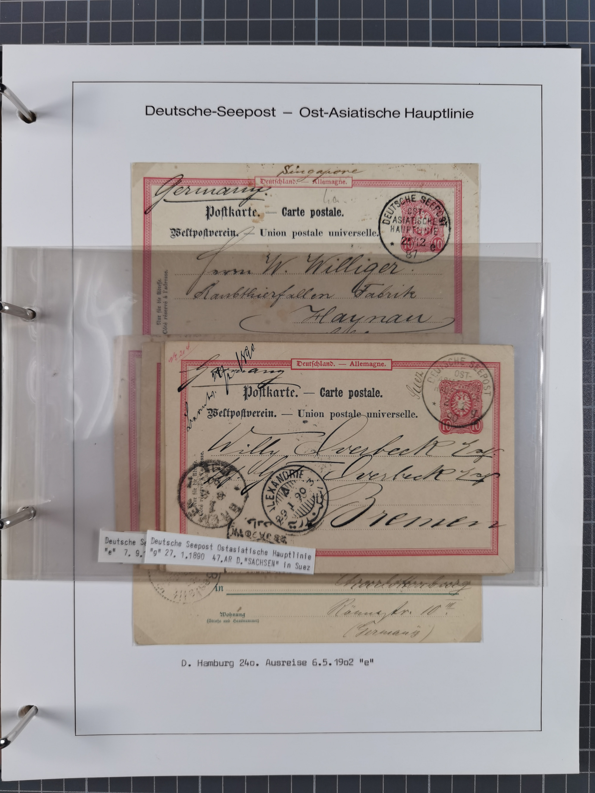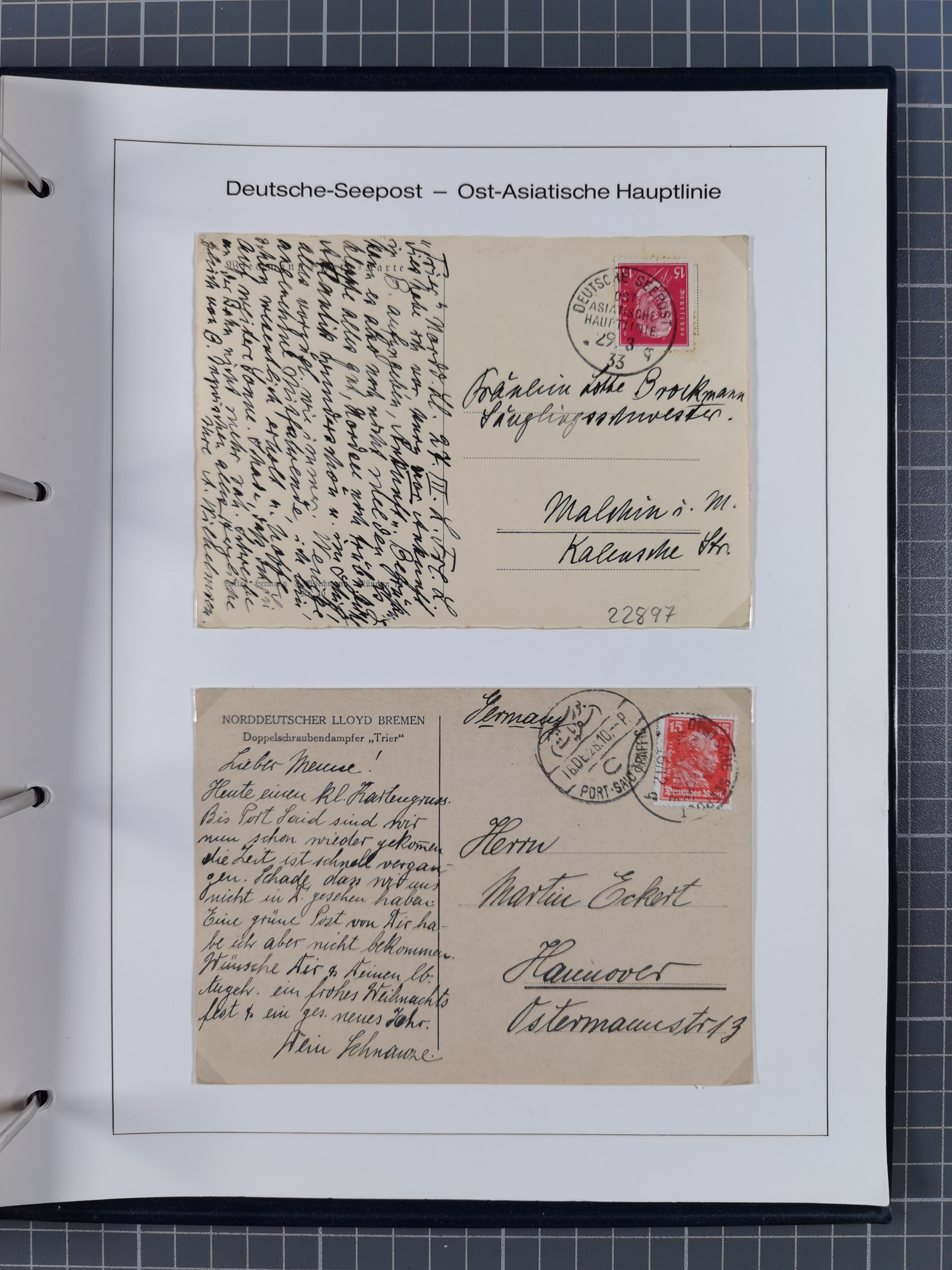 1887/1938, Sammlung “OST-ASIATISCHE HAUPTLINIE” und “OST-ASIATISCHE LINIE” mit ca. 120 Briefen, Karten und GSK, dabei frühe Post mit Aufgabe-Vermerken und R-Briefvorderseite 1905 mit R-Zettel “Deutsch Seepost…” und Ra2 “Reichspostdampfer Prinze Heinrich”. Fast durchgehen in guter Erhaltung und meist auf Albenblättern mit Beschriftung, ex Steinmeyer