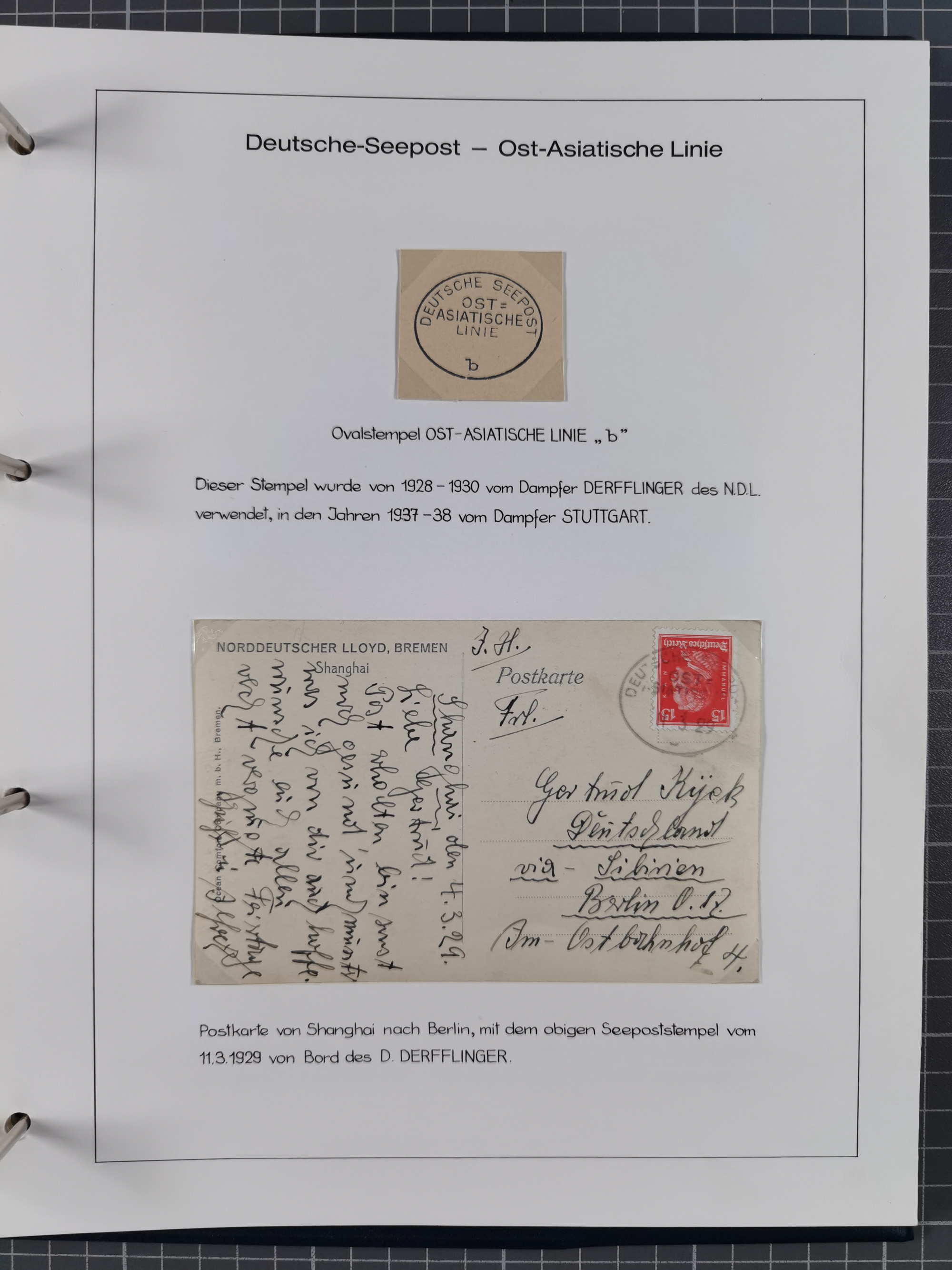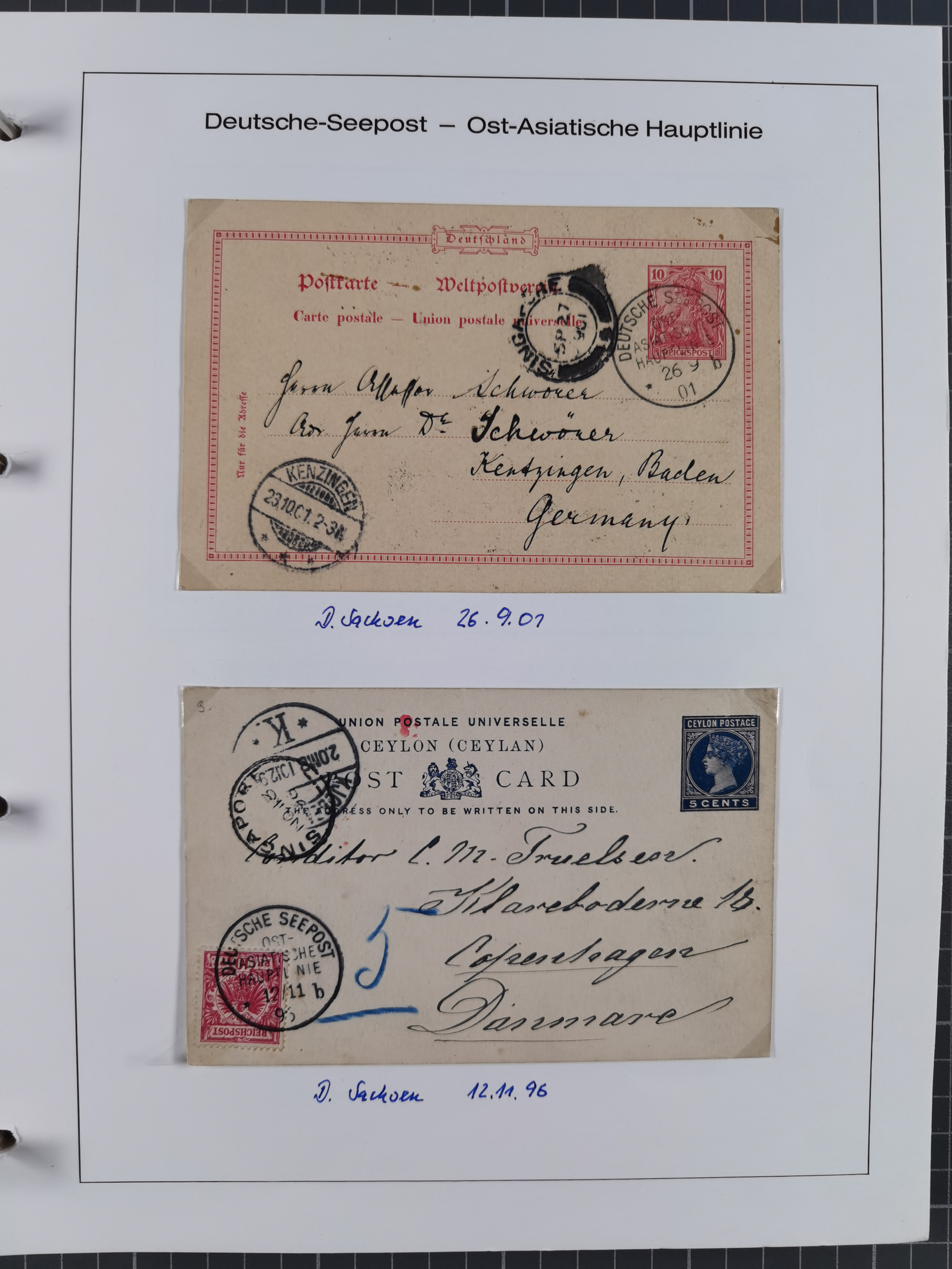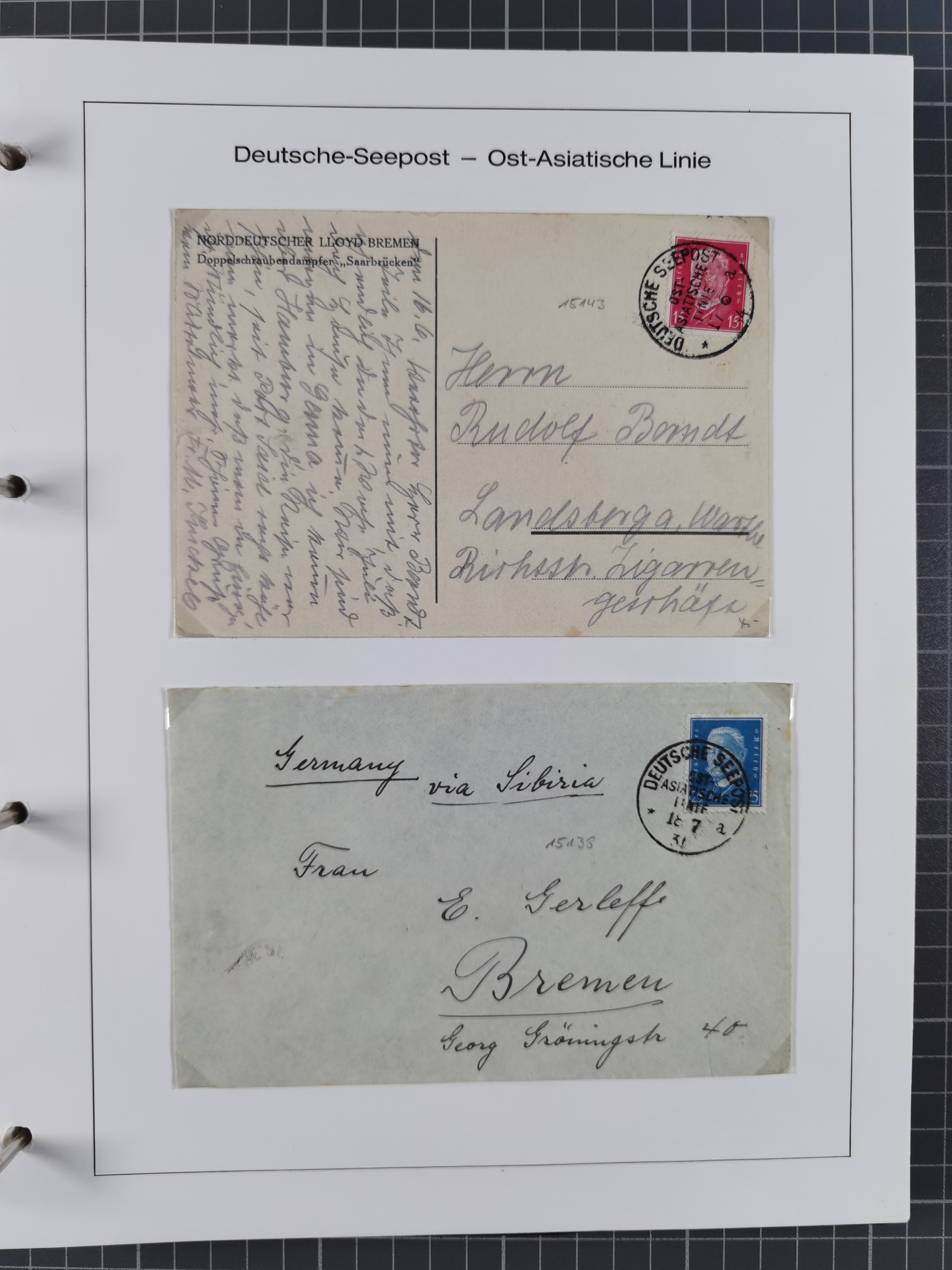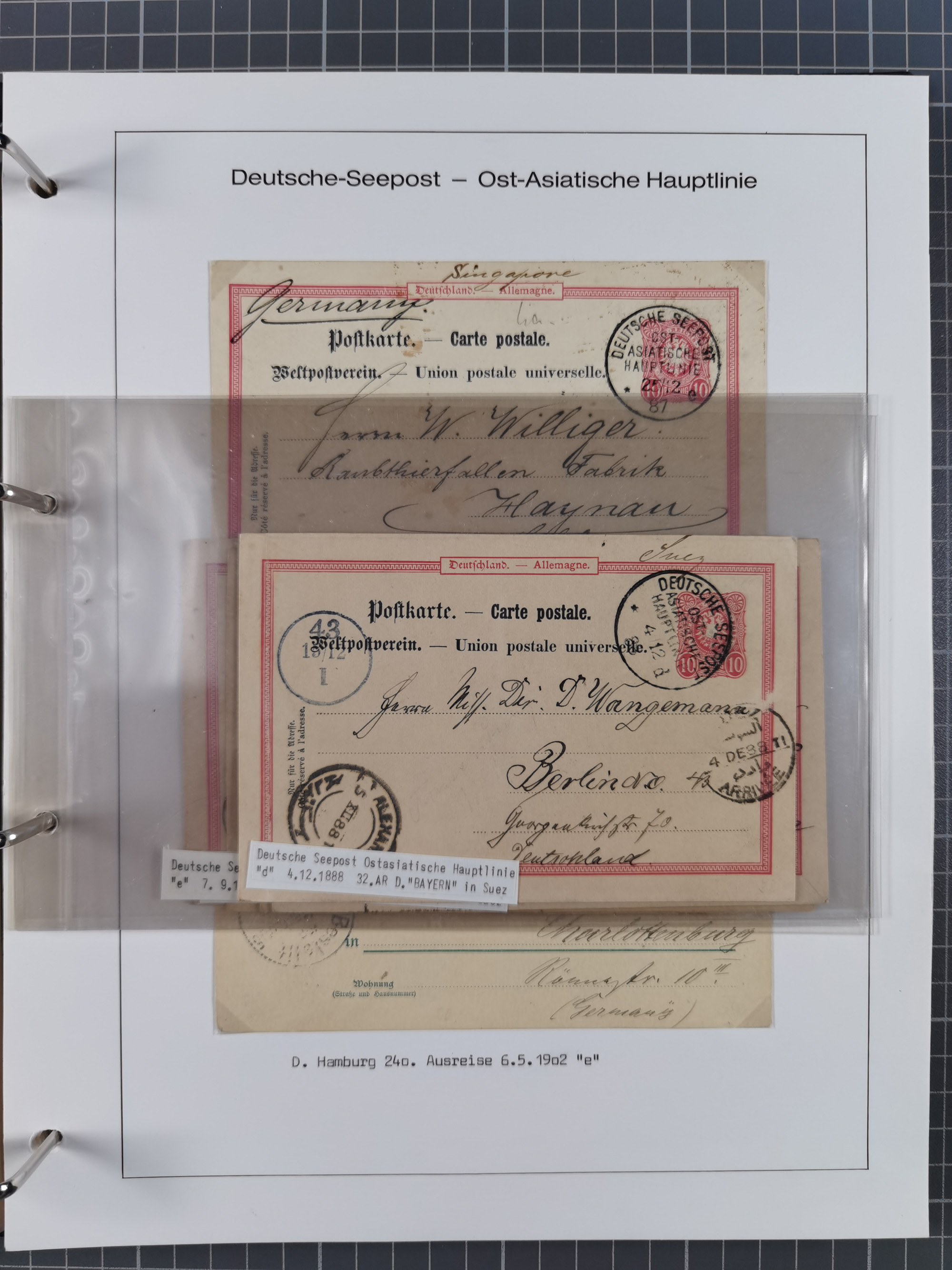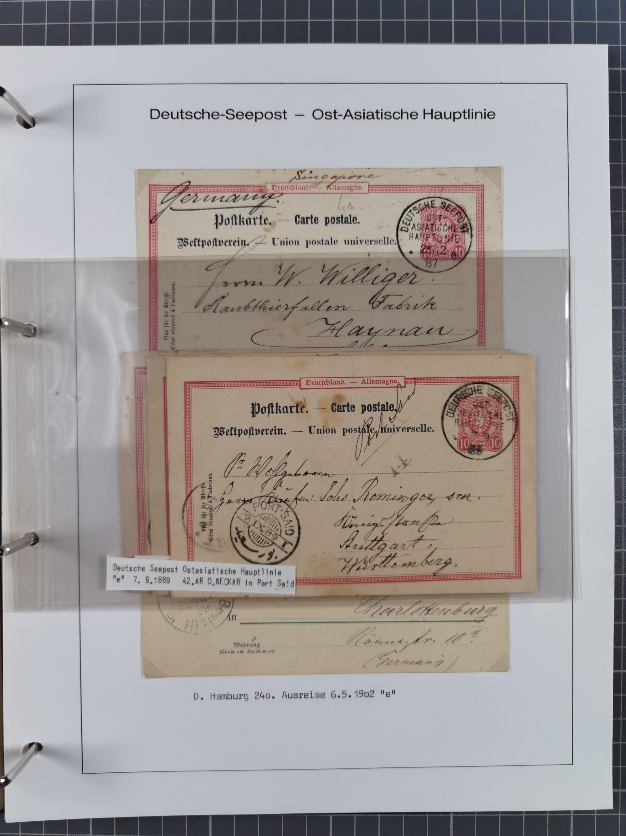 1887/1938, Sammlung “OST-ASIATISCHE HAUPTLINIE” und “OST-ASIATISCHE LINIE” mit ca. 120 Briefen, Karten und GSK, dabei frühe Post mit Aufgabe-Vermerken und R-Briefvorderseite 1905 mit R-Zettel “Deutsch Seepost…” und Ra2 “Reichspostdampfer Prinze Heinrich”. Fast durchgehen in guter Erhaltung und meist auf Albenblättern mit Beschriftung, ex Steinmeyer