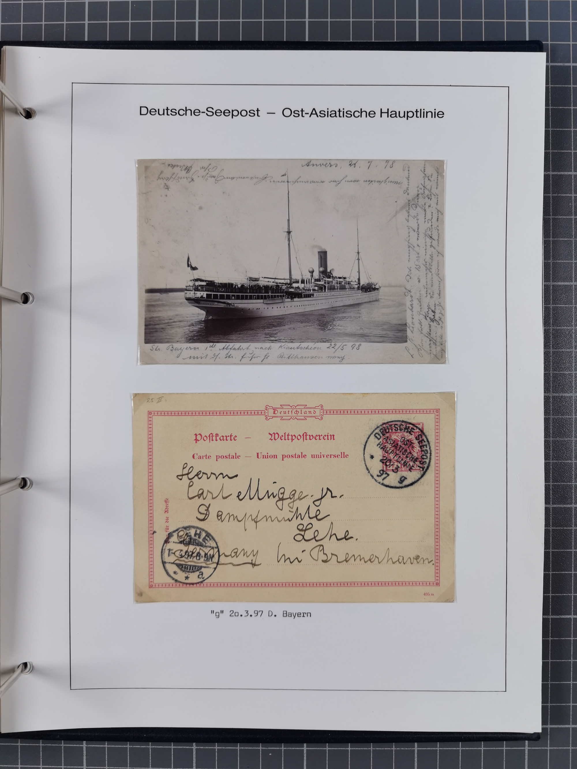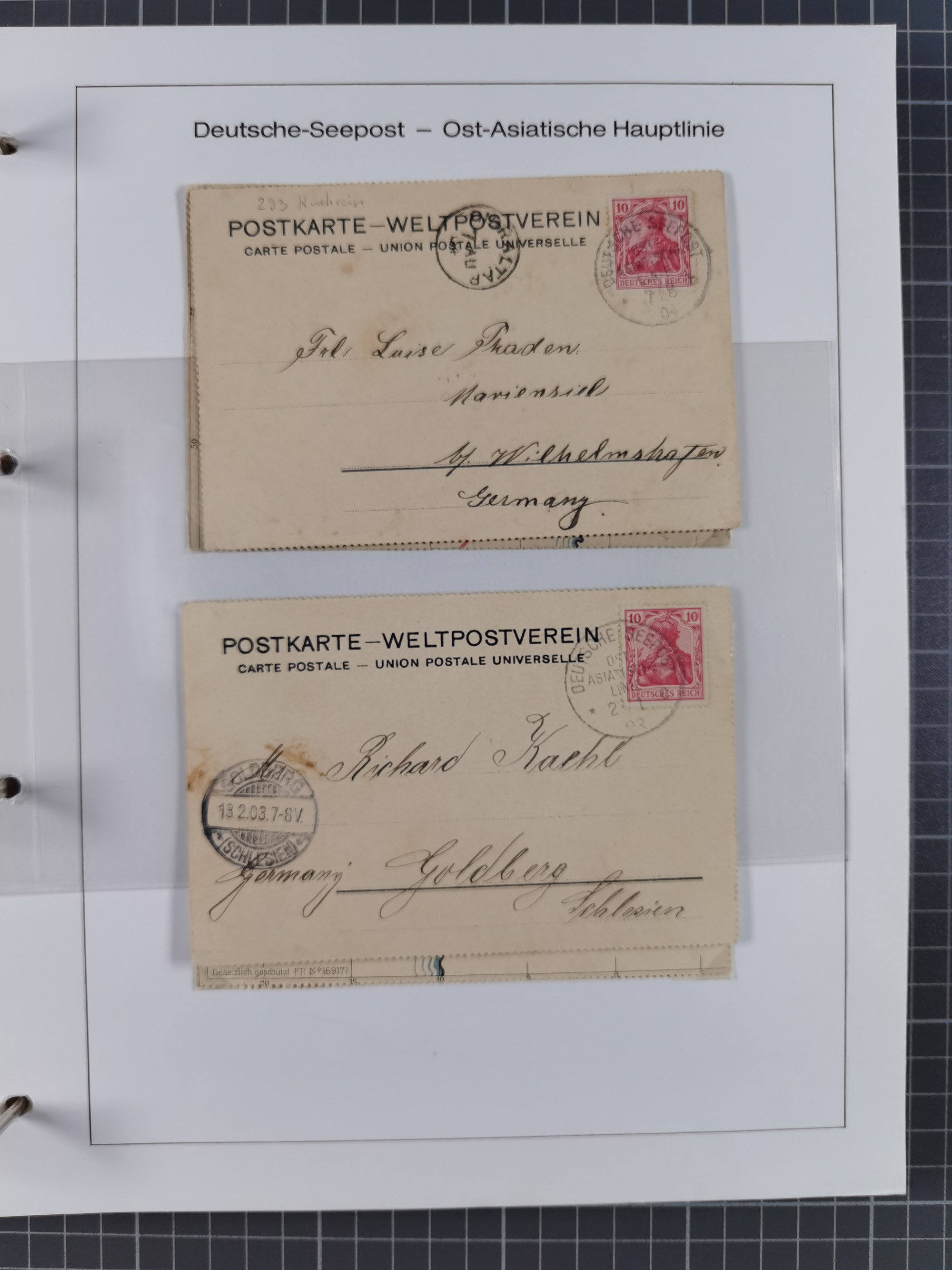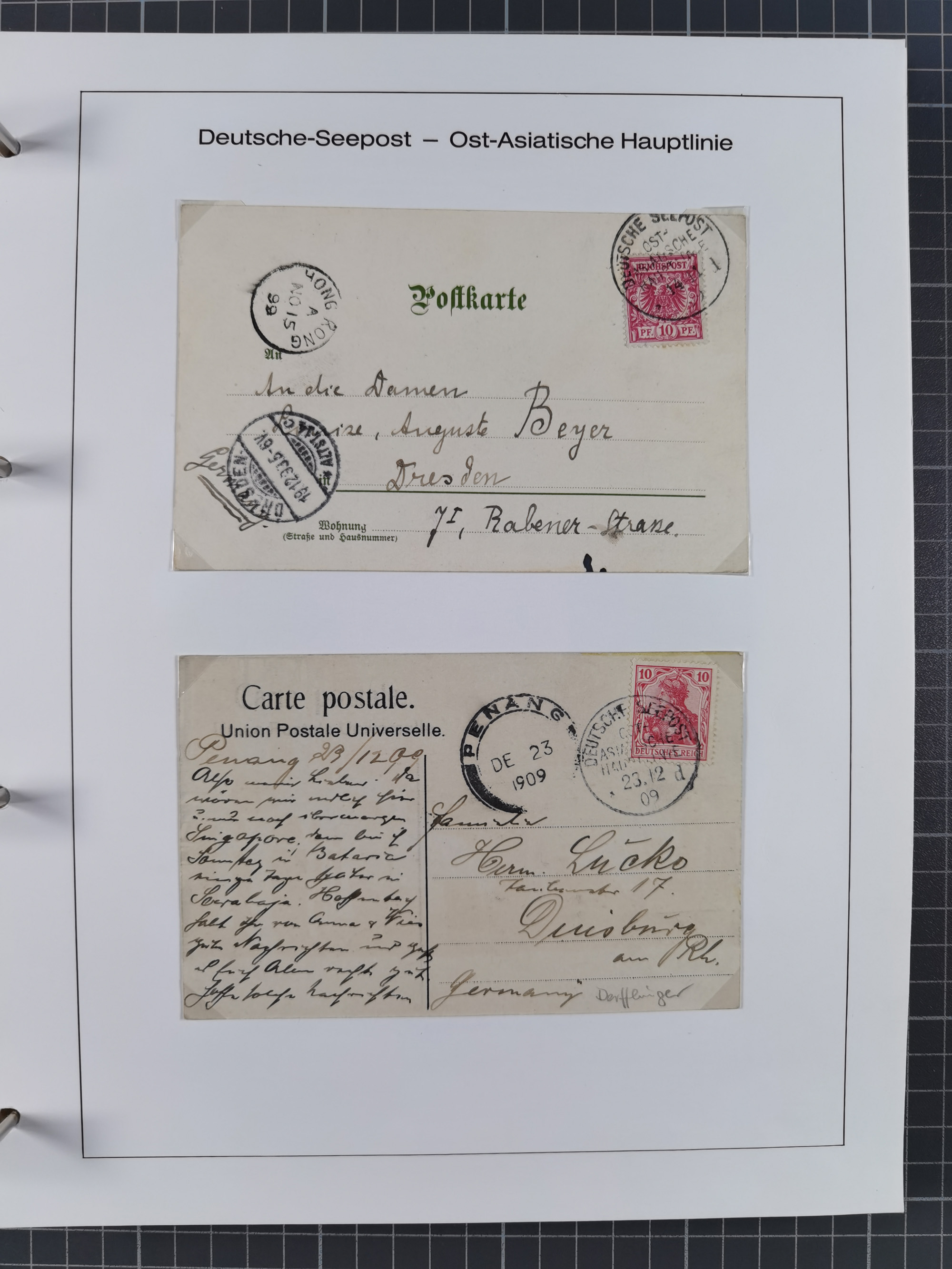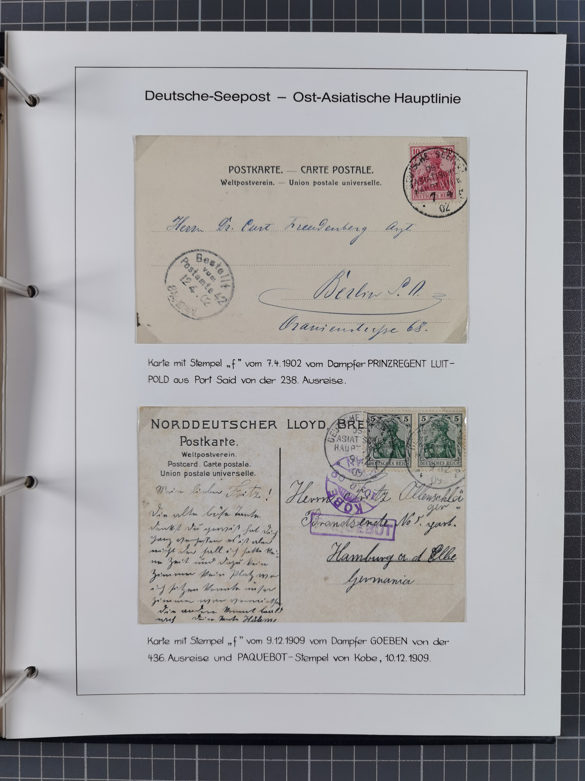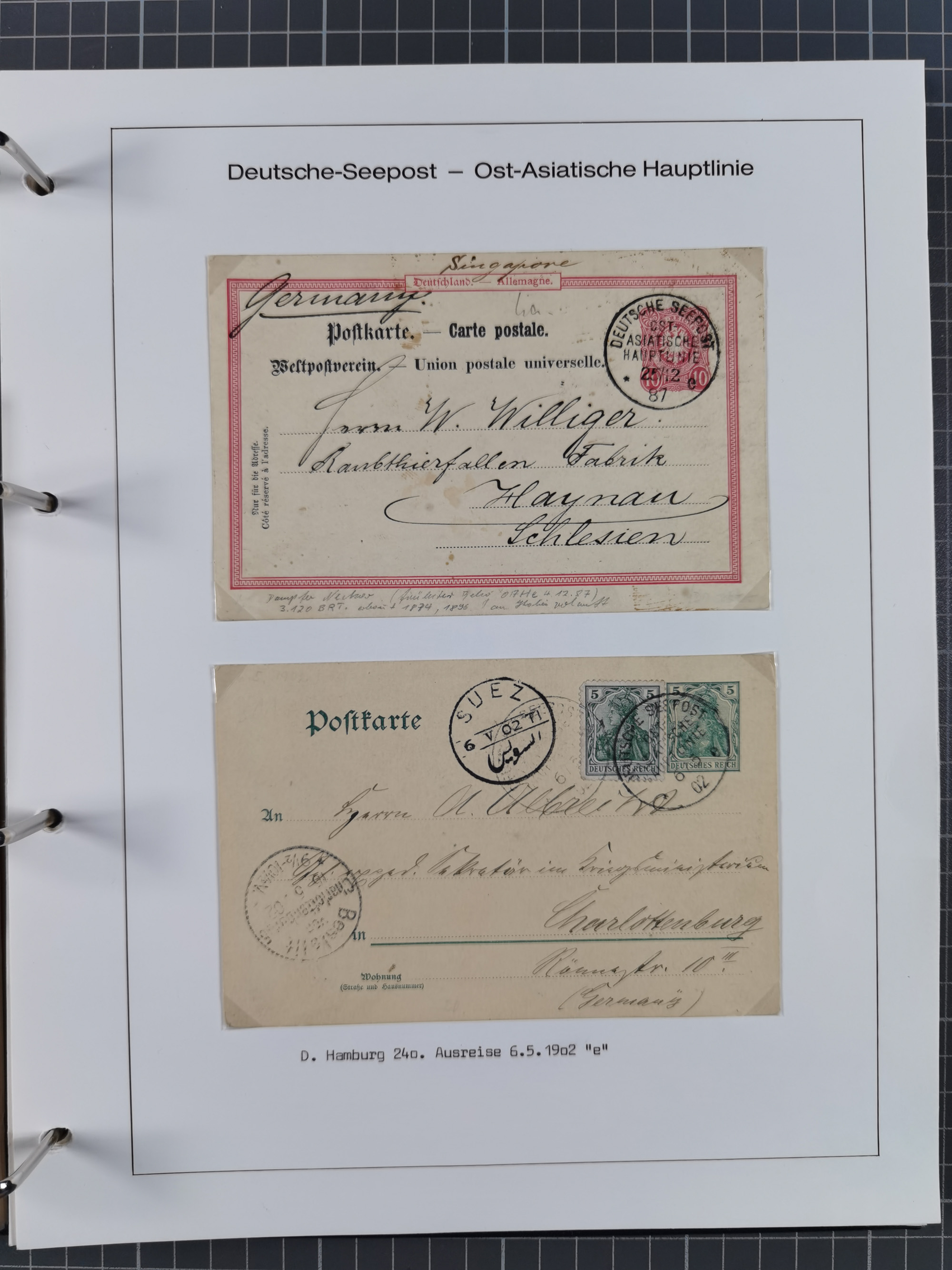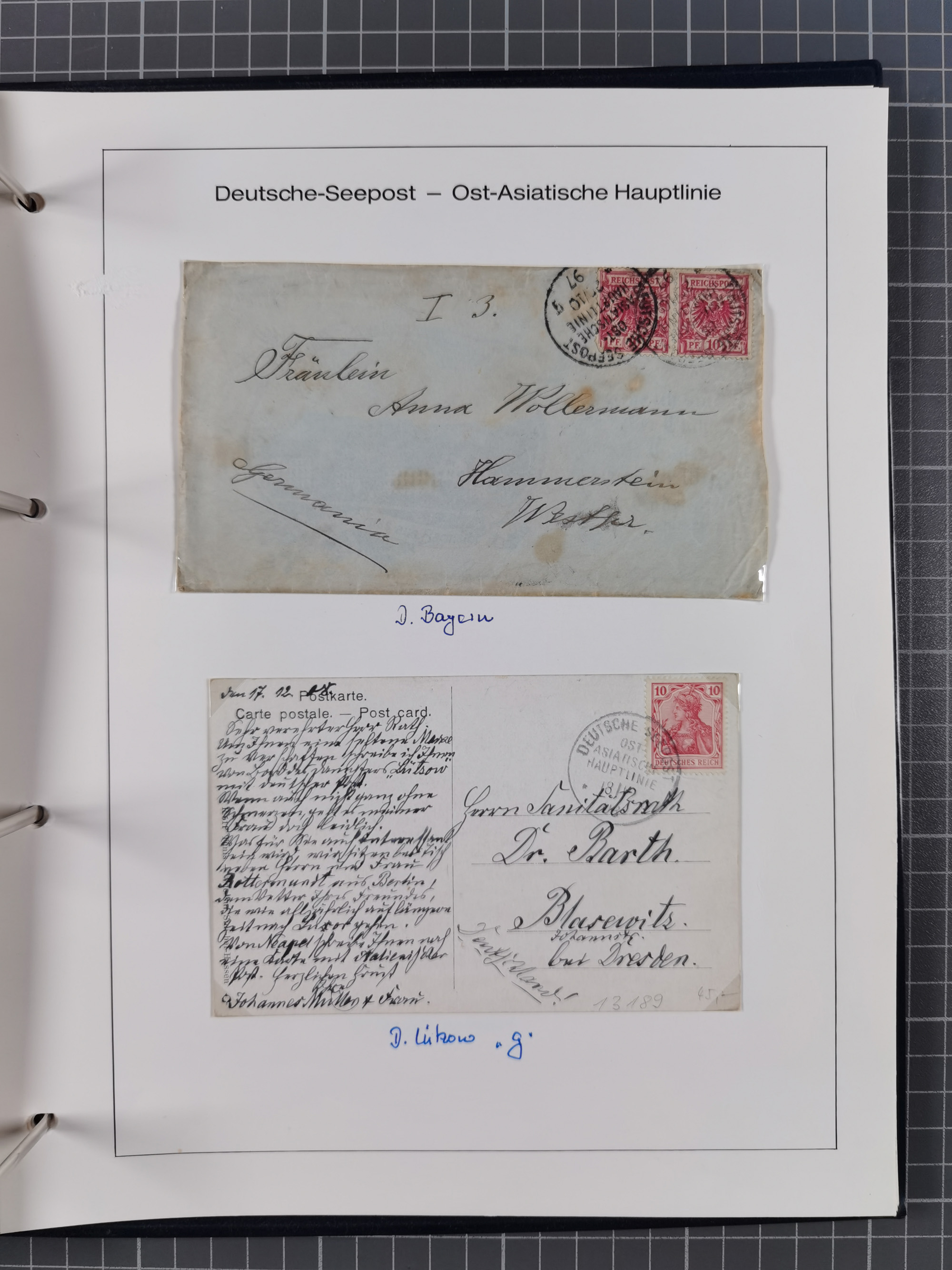 1887/1938, Sammlung “OST-ASIATISCHE HAUPTLINIE” und “OST-ASIATISCHE LINIE” mit ca. 120 Briefen, Karten und GSK, dabei frühe Post mit Aufgabe-Vermerken und R-Briefvorderseite 1905 mit R-Zettel “Deutsch Seepost…” und Ra2 “Reichspostdampfer Prinze Heinrich”. Fast durchgehen in guter Erhaltung und meist auf Albenblättern mit Beschriftung, ex Steinmeyer