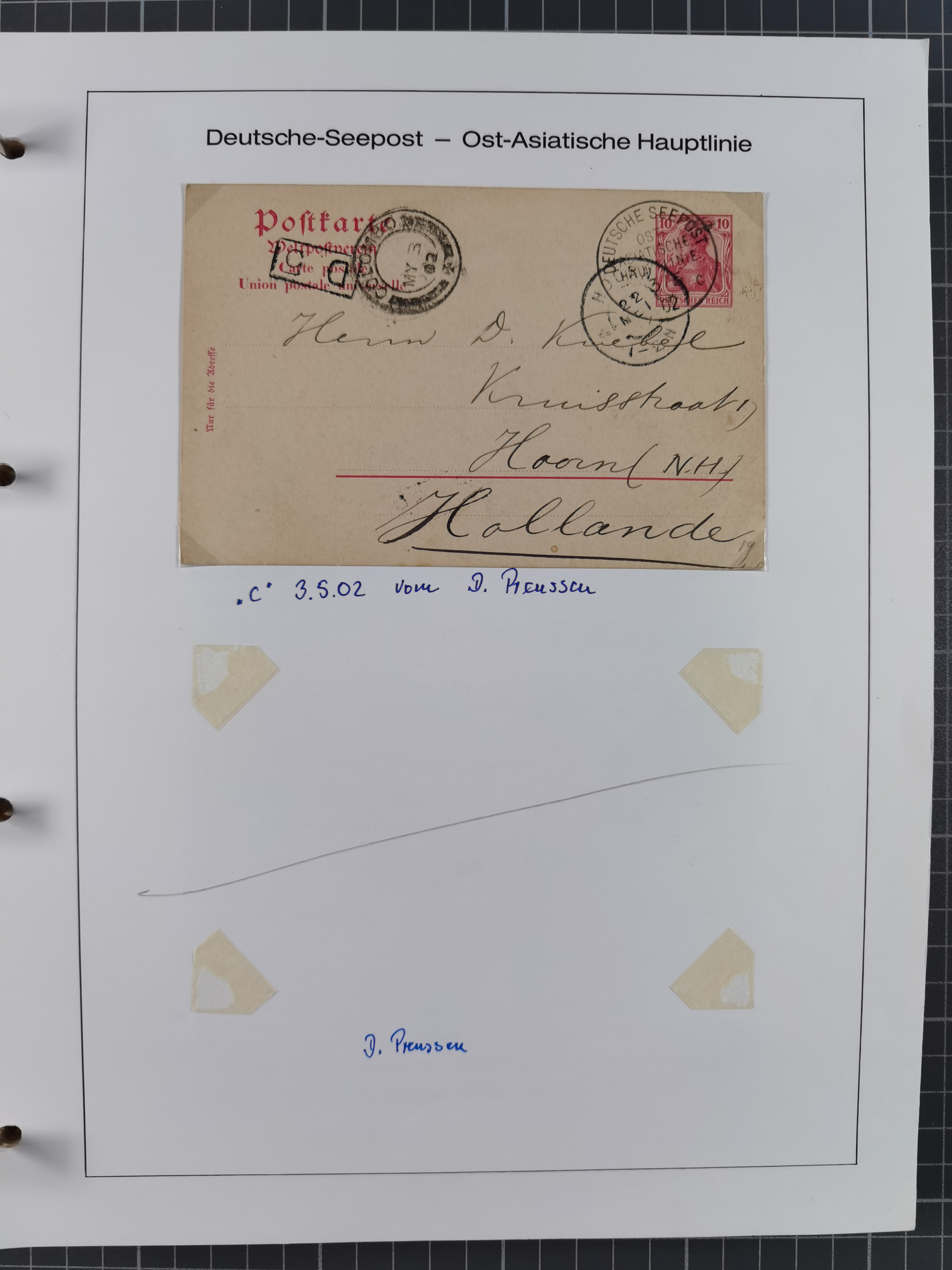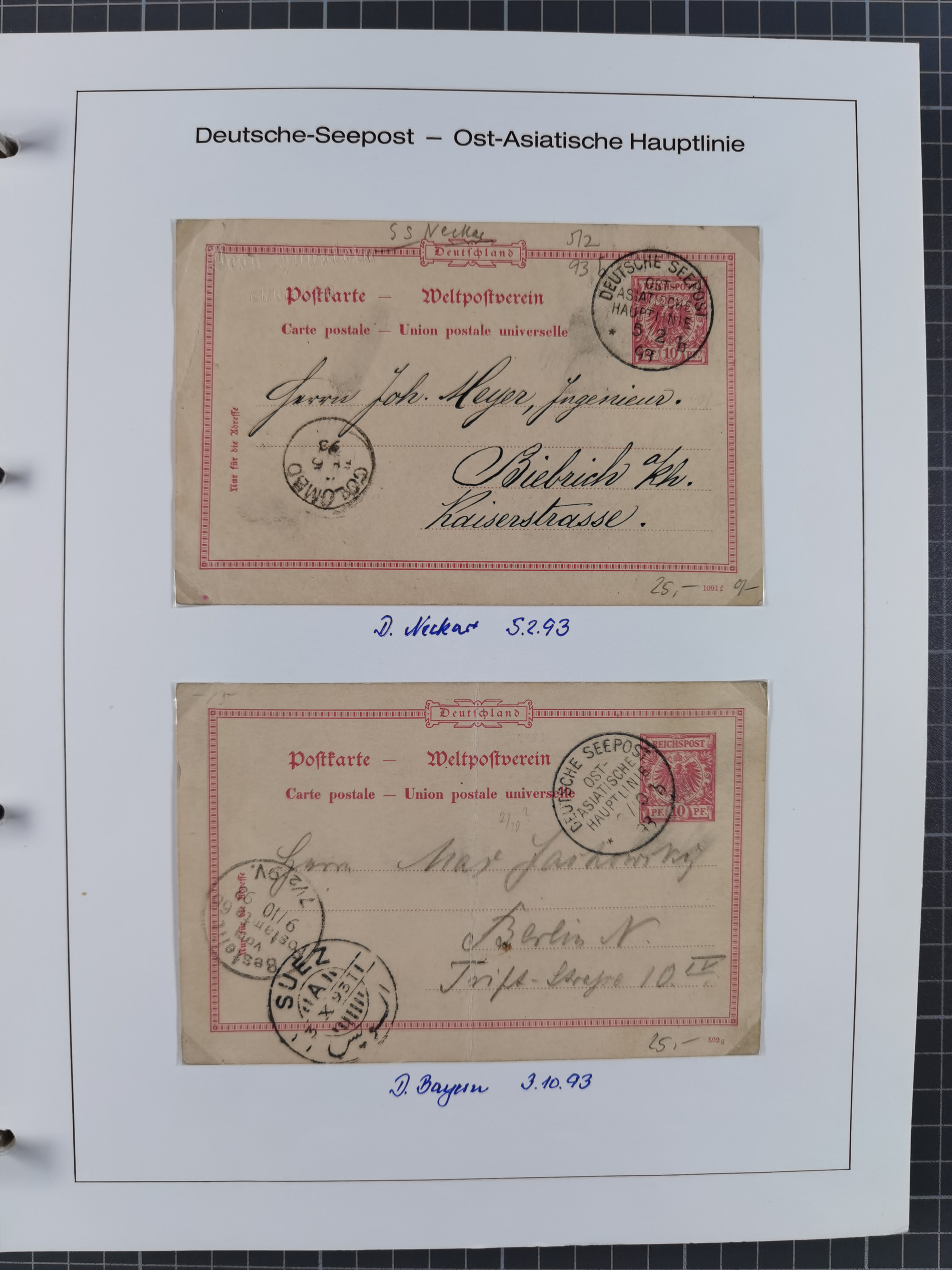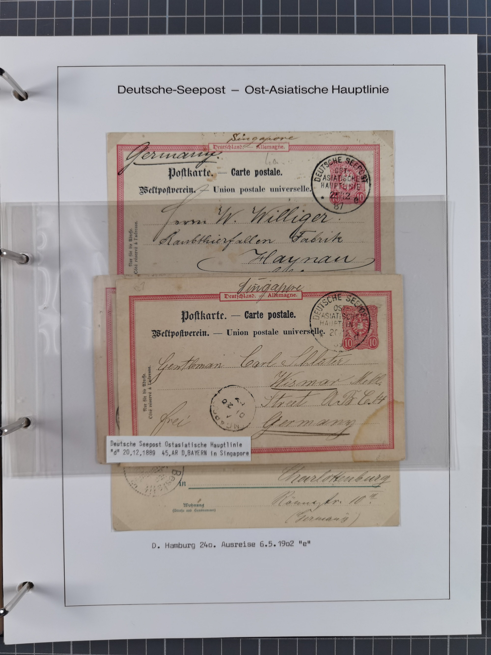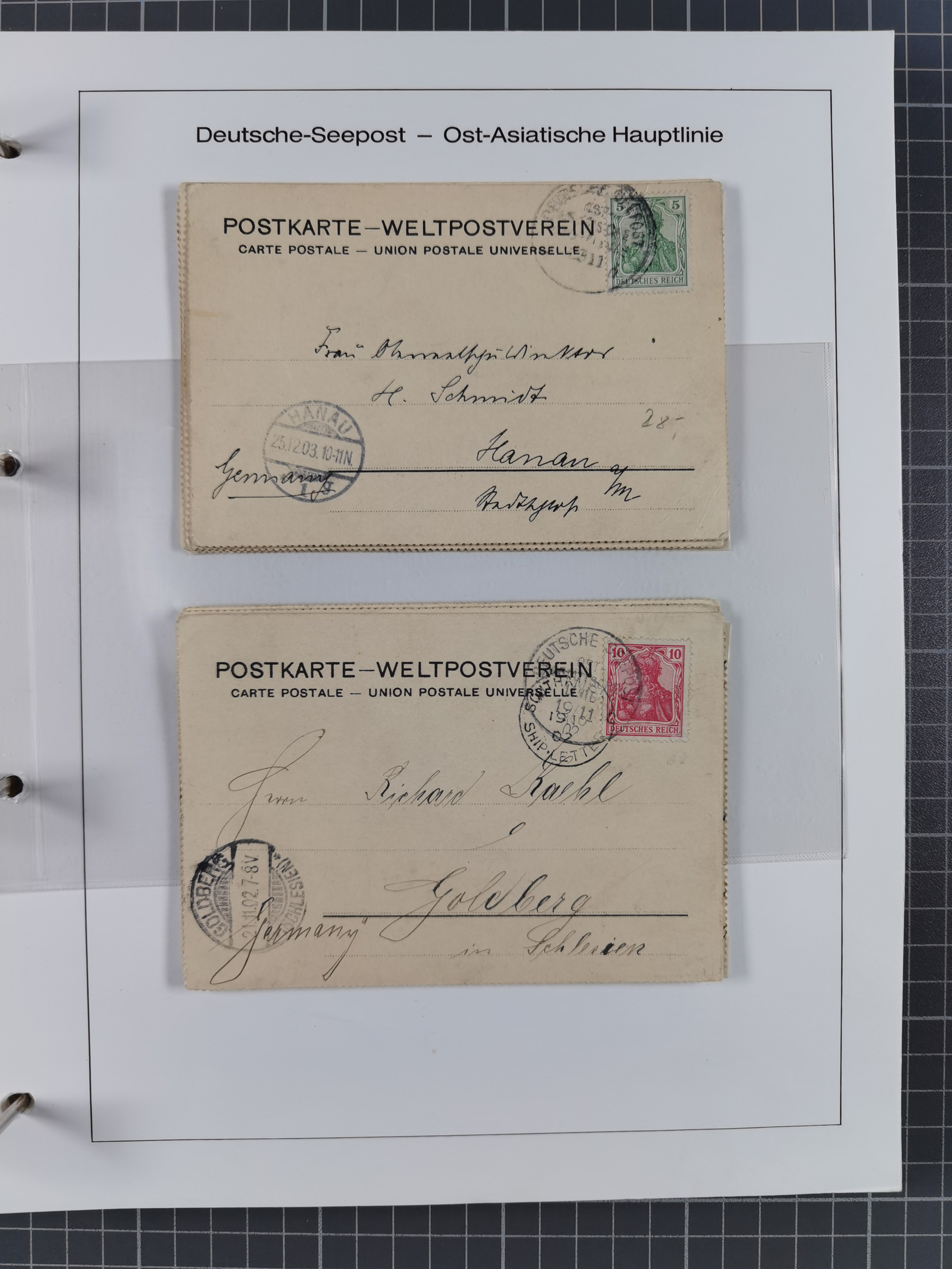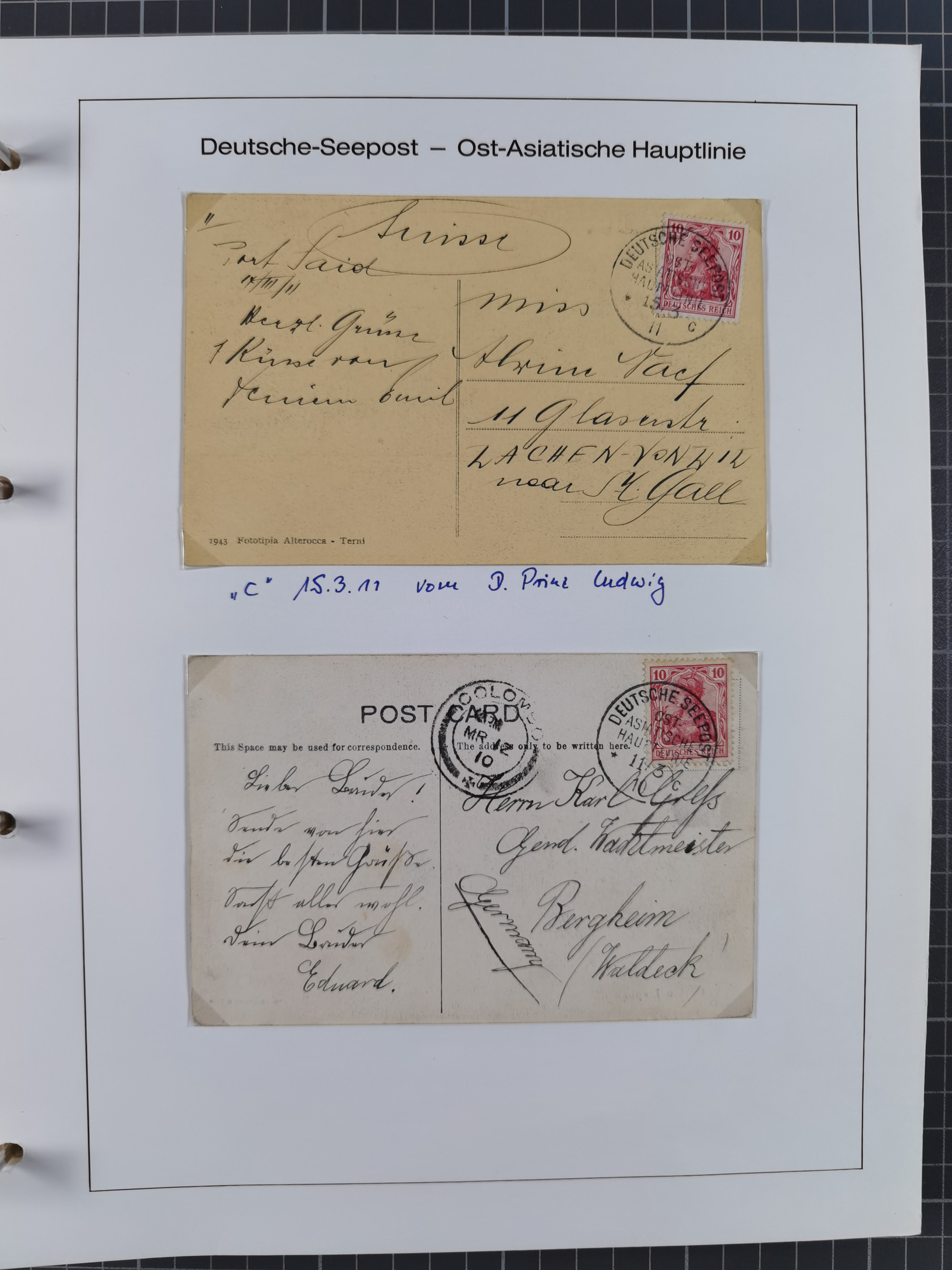 1887/1938, Sammlung “OST-ASIATISCHE HAUPTLINIE” und “OST-ASIATISCHE LINIE” mit ca. 120 Briefen, Karten und GSK, dabei frühe Post mit Aufgabe-Vermerken und R-Briefvorderseite 1905 mit R-Zettel “Deutsch Seepost…” und Ra2 “Reichspostdampfer Prinze Heinrich”. Fast durchgehen in guter Erhaltung und meist auf Albenblättern mit Beschriftung, ex Steinmeyer
