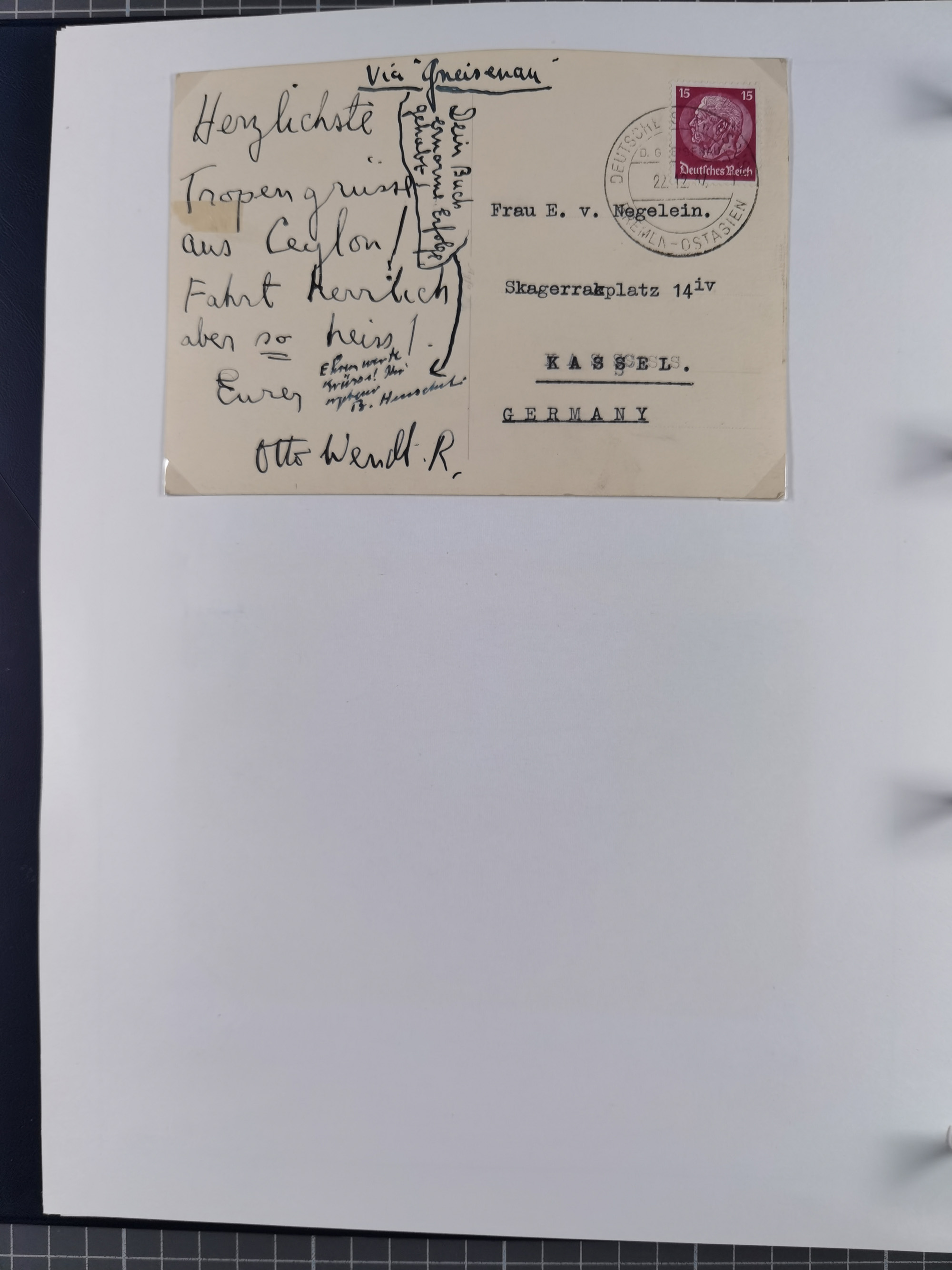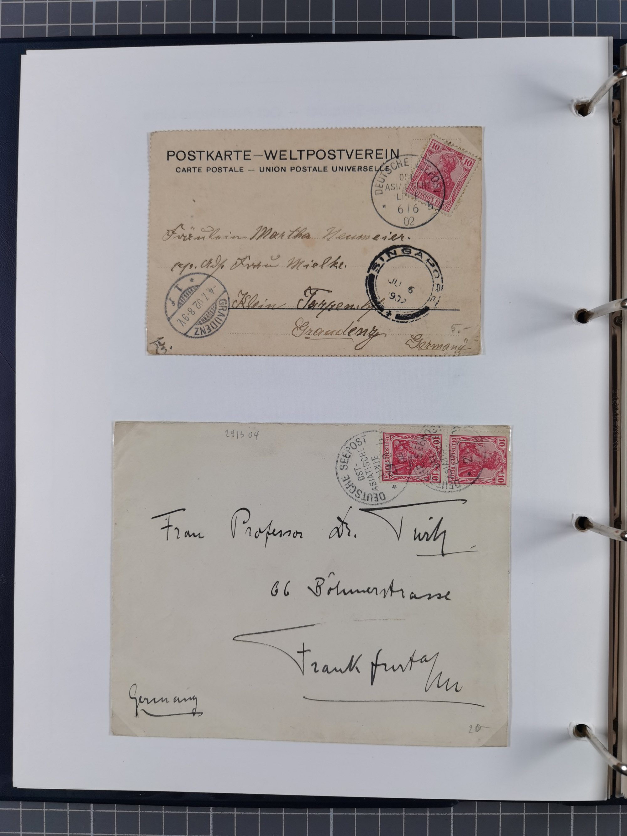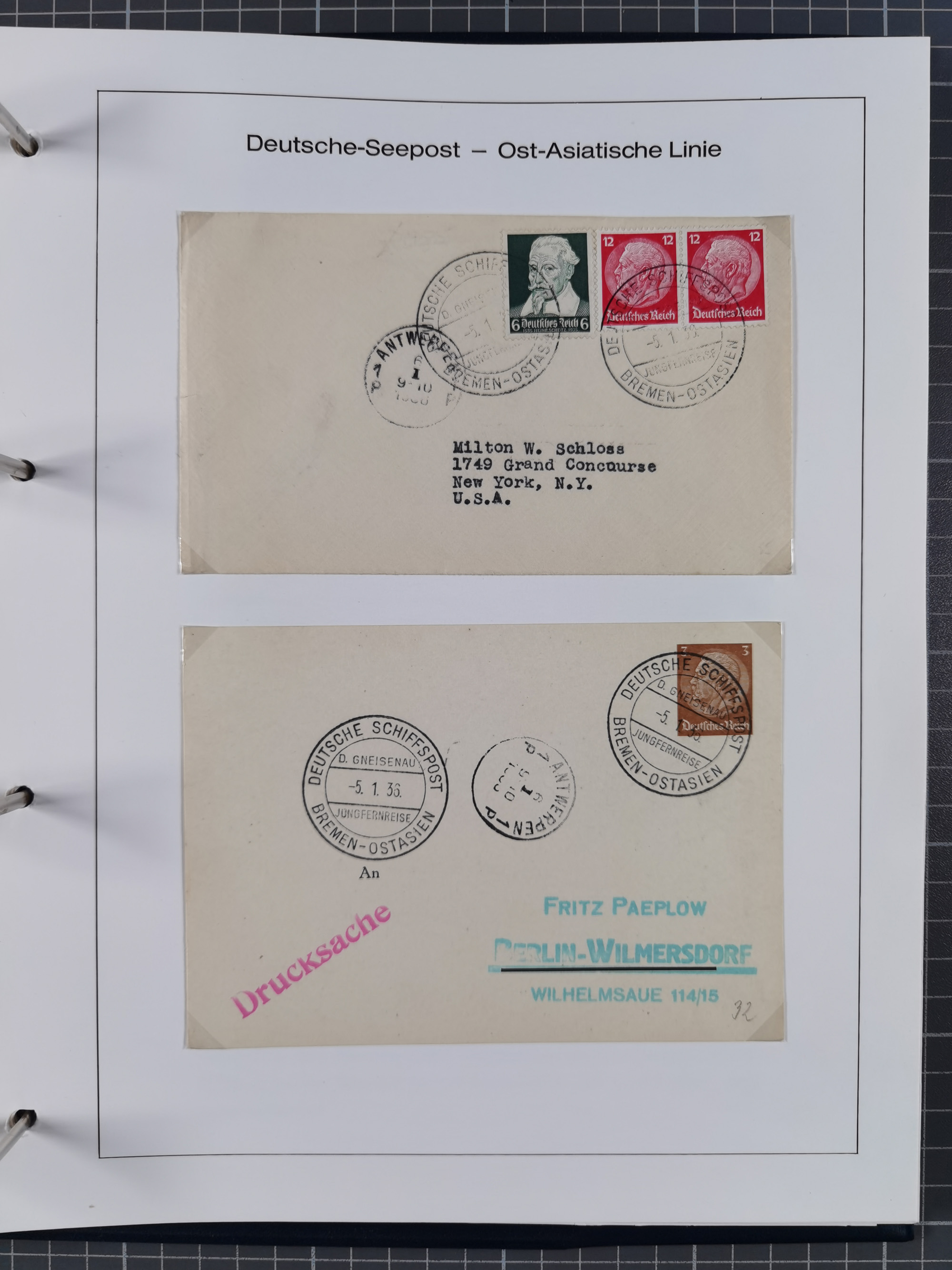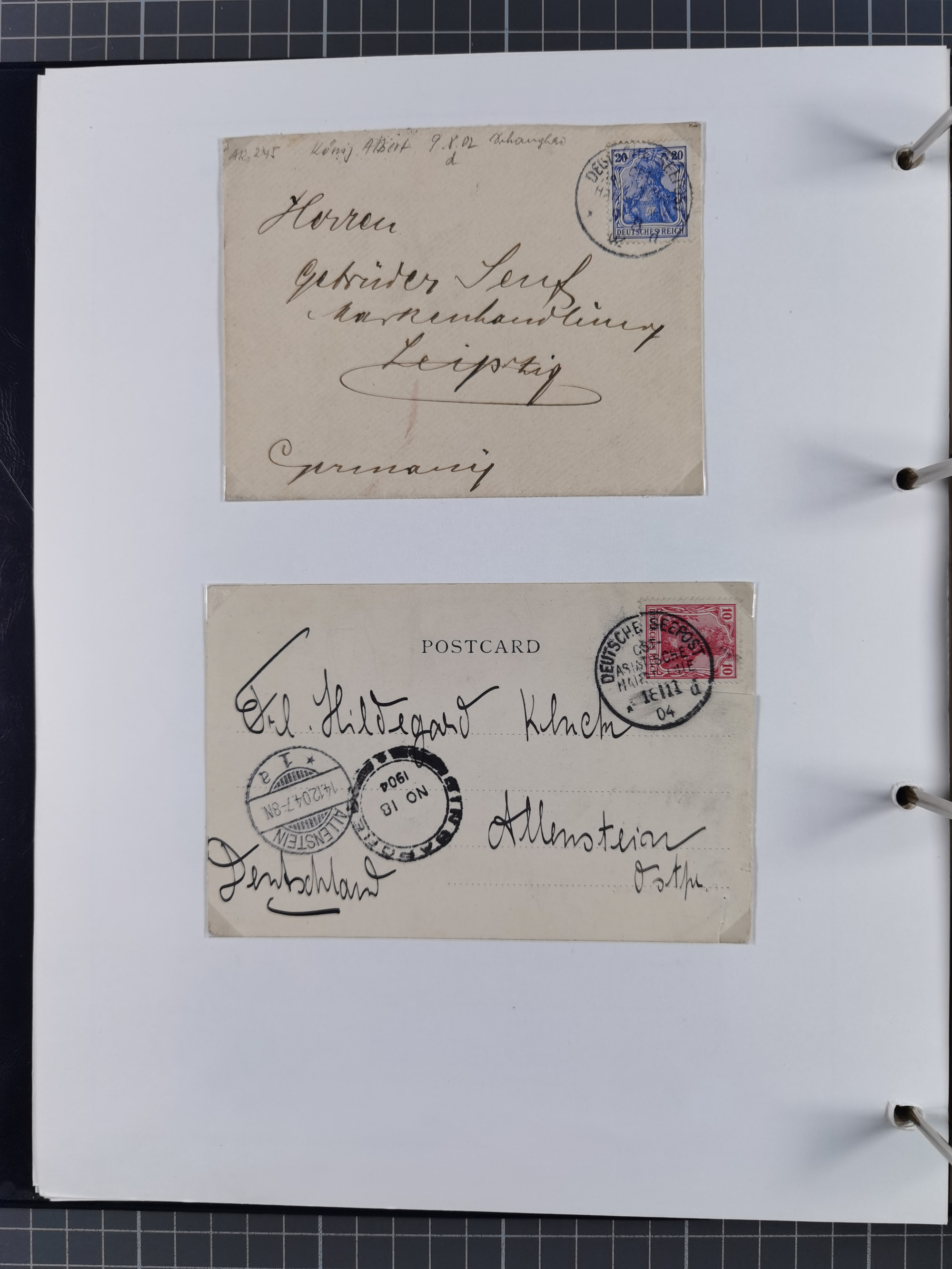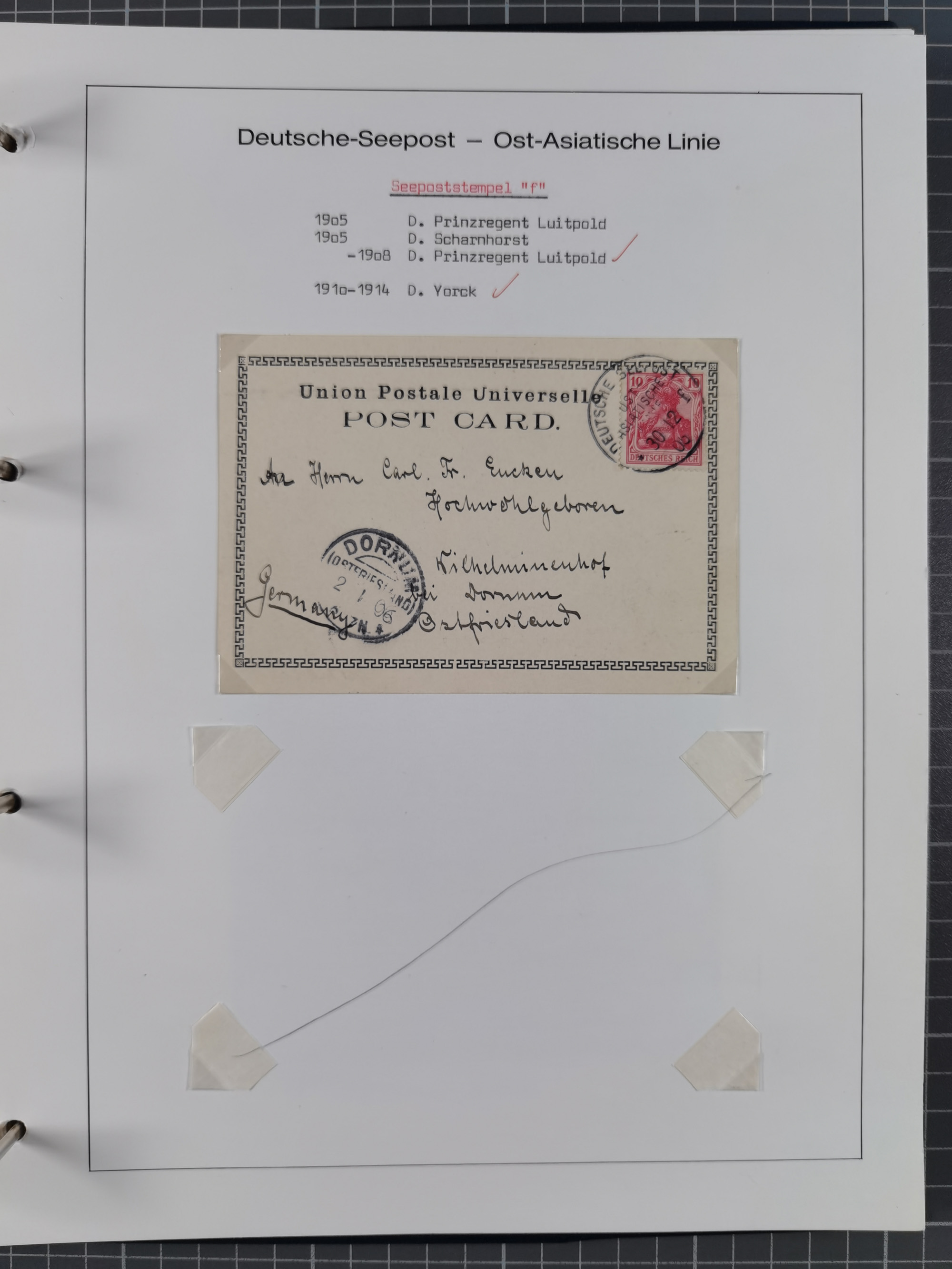 1887/1938, Sammlung “OST-ASIATISCHE HAUPTLINIE” und “OST-ASIATISCHE LINIE” mit ca. 120 Briefen, Karten und GSK, dabei frühe Post mit Aufgabe-Vermerken und R-Briefvorderseite 1905 mit R-Zettel “Deutsch Seepost…” und Ra2 “Reichspostdampfer Prinze Heinrich”. Fast durchgehen in guter Erhaltung und meist auf Albenblättern mit Beschriftung, ex Steinmeyer