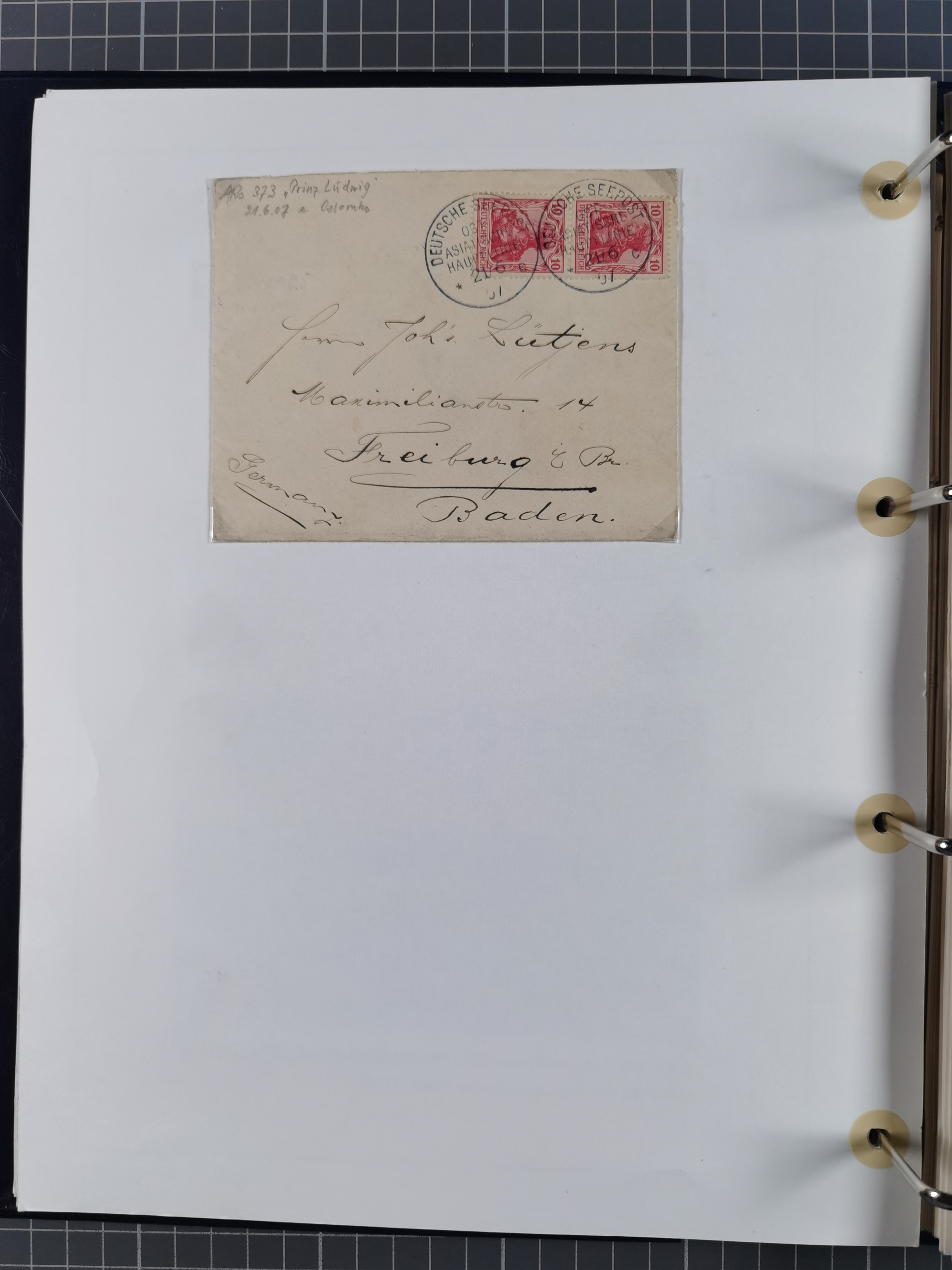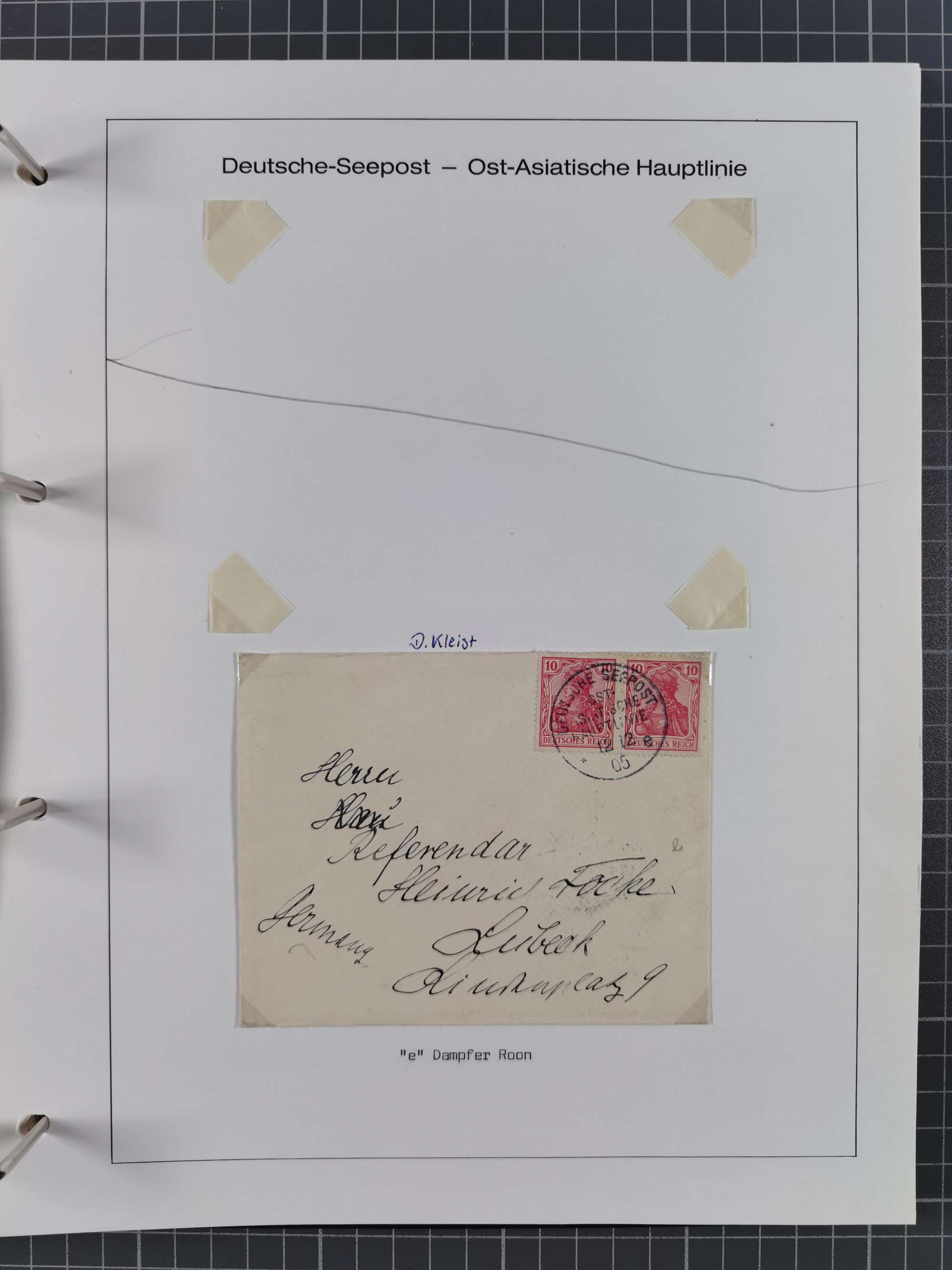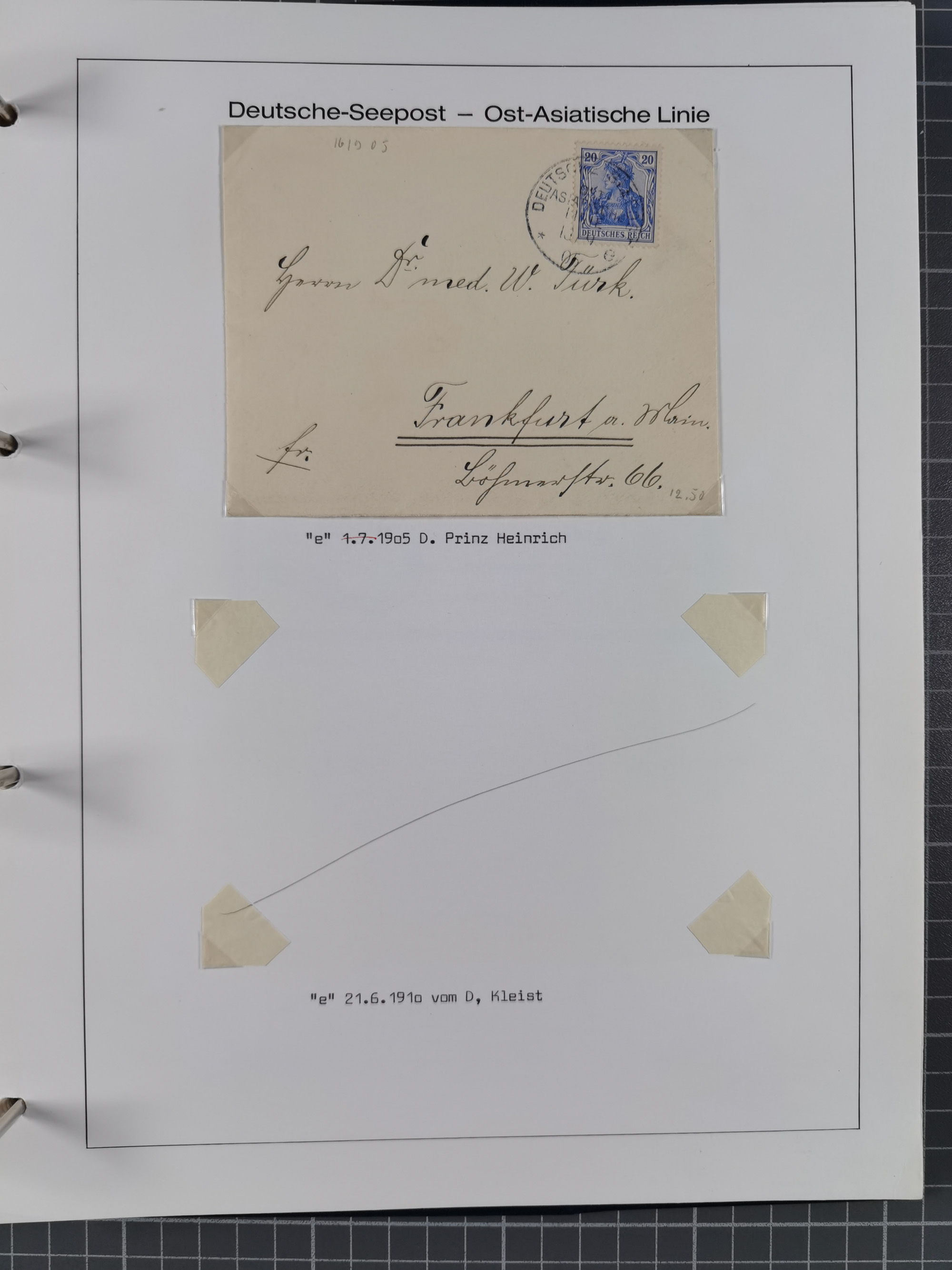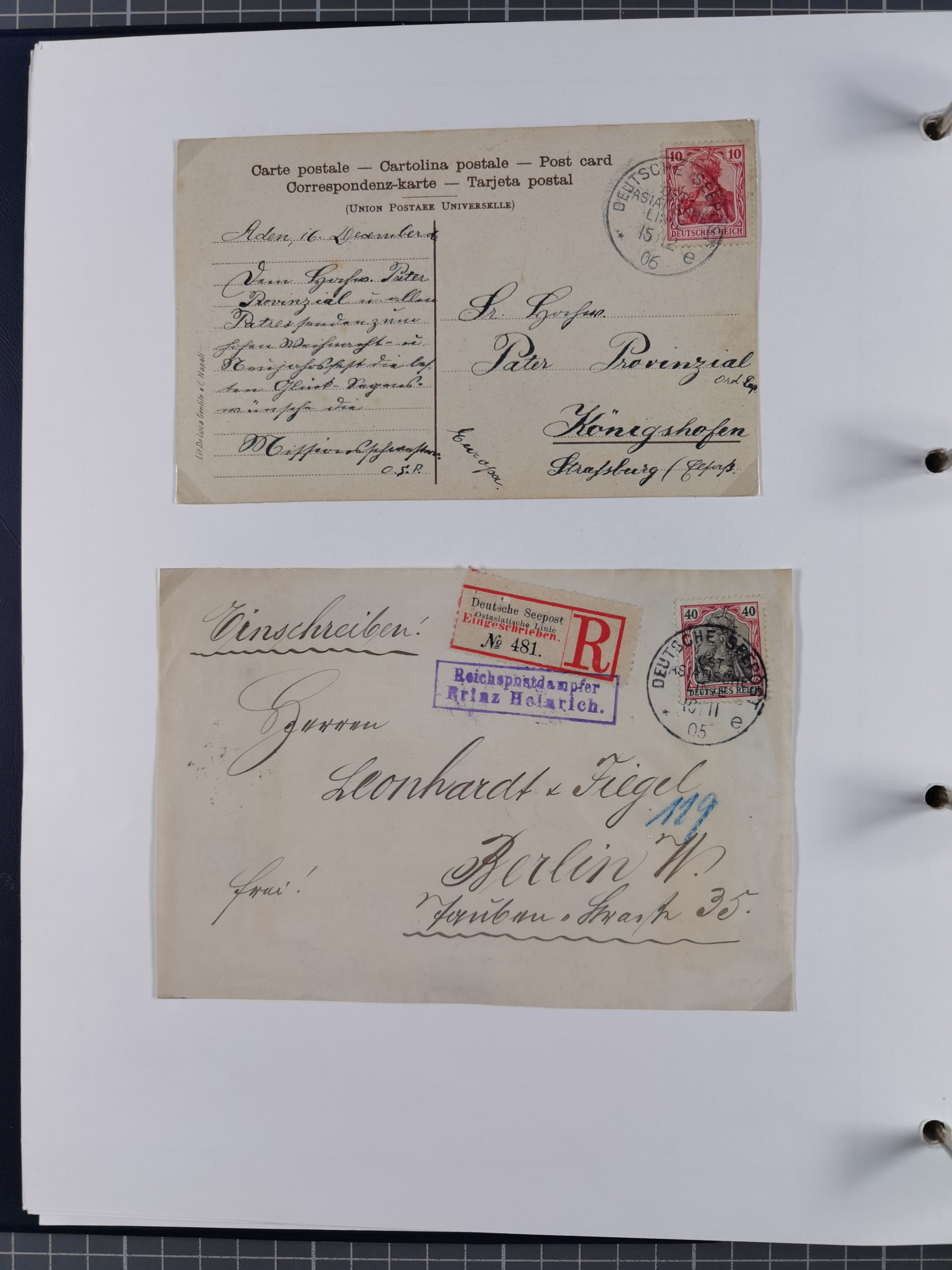 “DSP OST-ASIATISCHE-LINIE *e 7.6.05” (D. Prinz Heinrich) zweimal recht klar auf Germania 40 und 80 Pfg. ohne Wasserzeichen als tarifgerechte Frankatur auf langformatigem R-Brief der 5. Gewichtsstufe mit R-Zettel “Deutsche Seepost Ostasiatische Linie” und nebengesetztem violettem Ra2 “Reichspostdampfer Prinz Heinrich” nach Köln mit Ankunftsstempel. Der Umschlag mit senkrechter Faltung und waagerechten Faltspuren (obere Marke davon betroffen). Trotz der Einschränkungen ein nicht häufiger R-Brief aus dem Bedarf