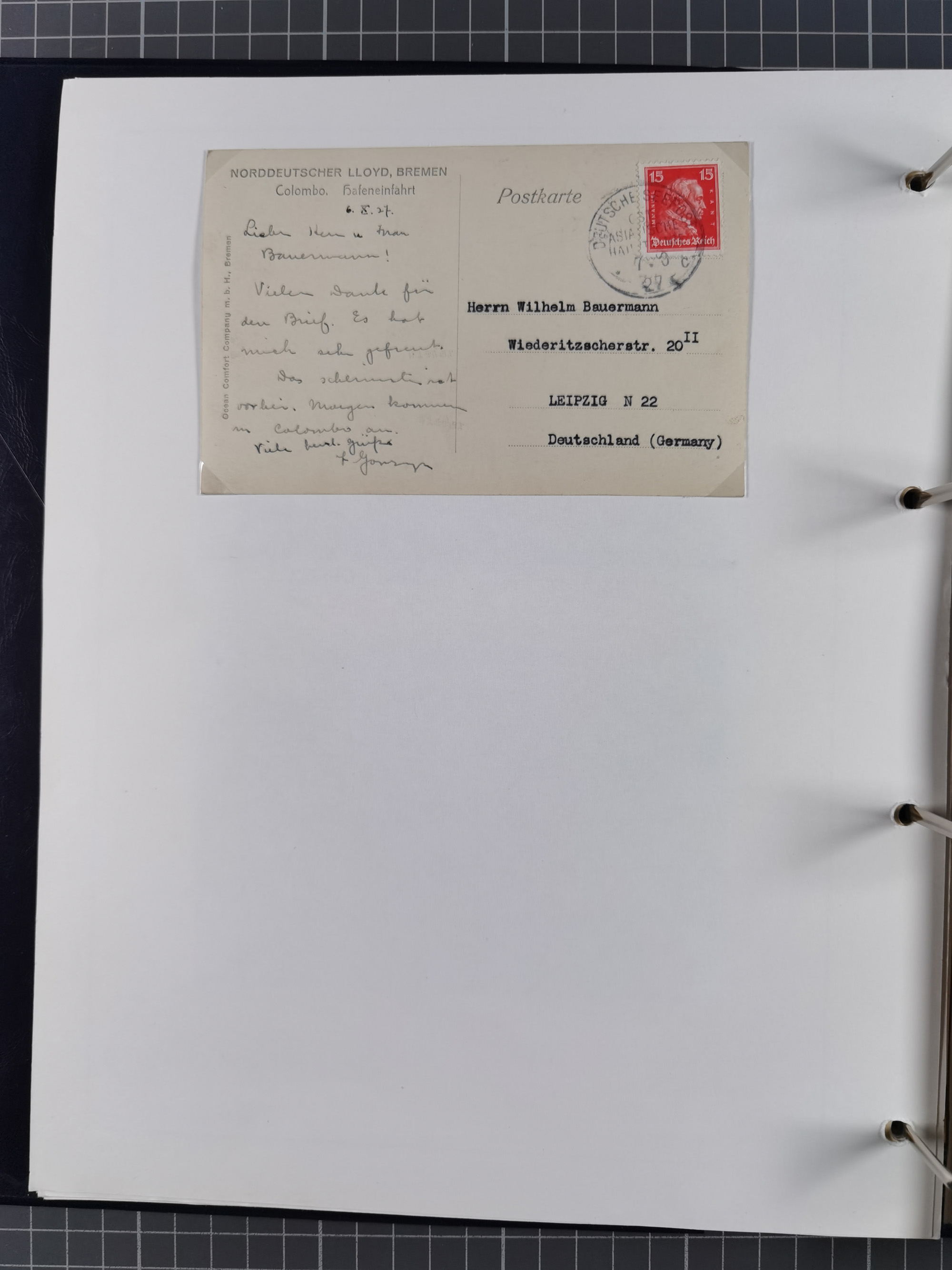 “DSP OST-ASIATISCHE LINIE*a 18.3.22” mehrfach rechts klar auf Ziffer 100 M. und waagerechtes Paar Posthorn 40 M. auf Ansichtskarte “Norddeutscher Lloyd, Bremen” mit viel Text aus Colombo in die USA