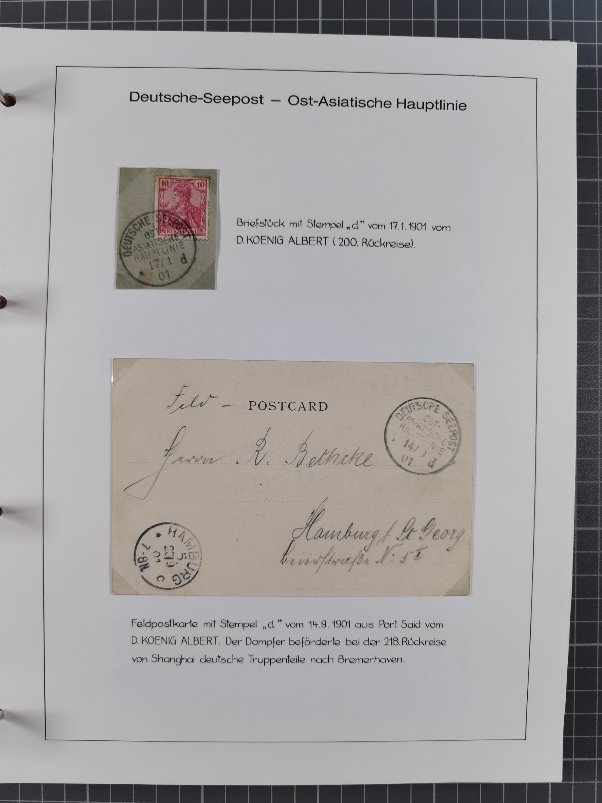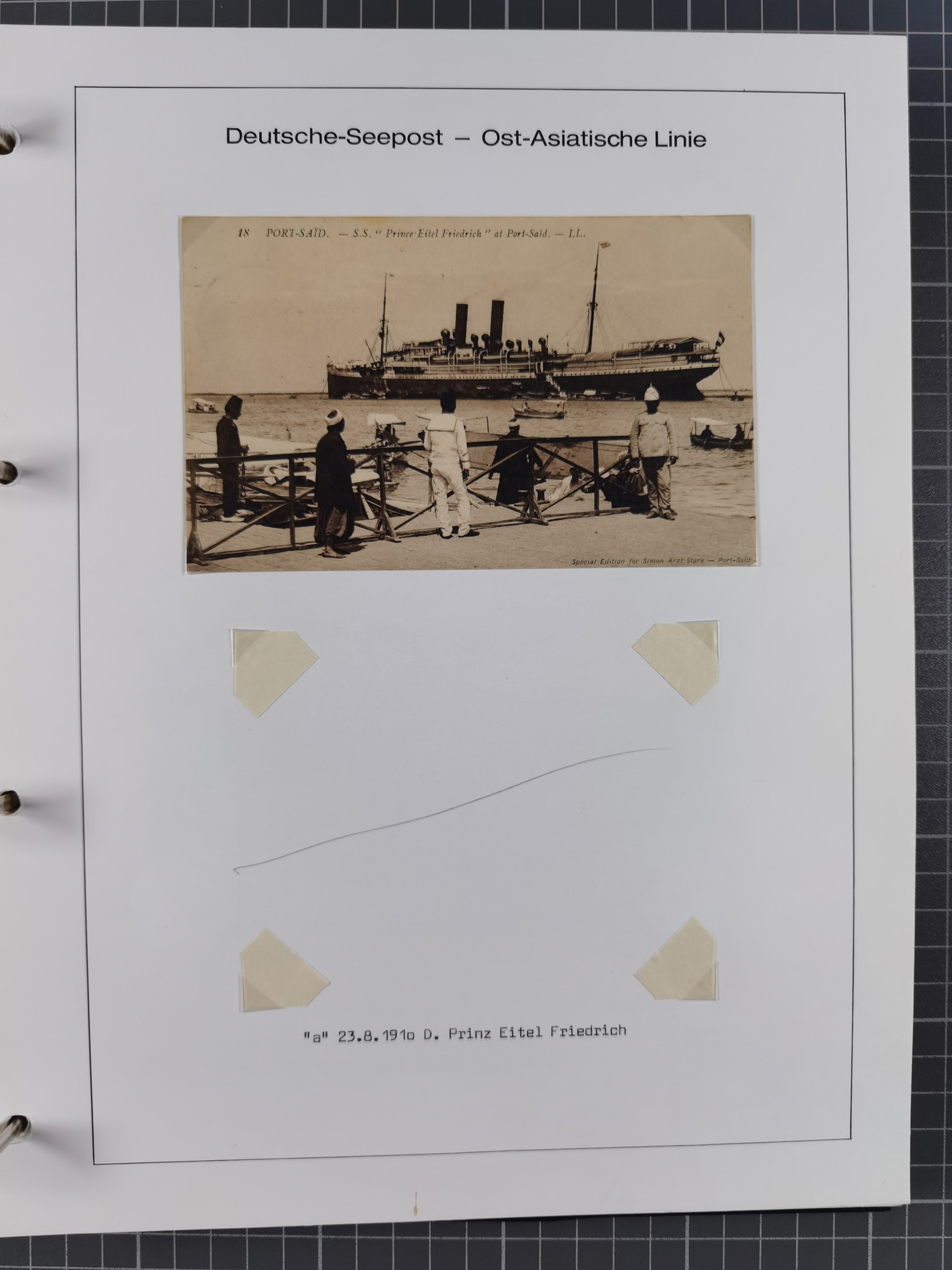 “DSP OST-INDISCHE LINIE *l 1.8.05" recht klar auf Germania 10 Pfg. auf Ansichtskarte “Port Said” mit Grußtext und L1 “PAQUEBOT” nach Bremen mit vorderseitigem Ankunftsstempel, in guter Erhaltung
