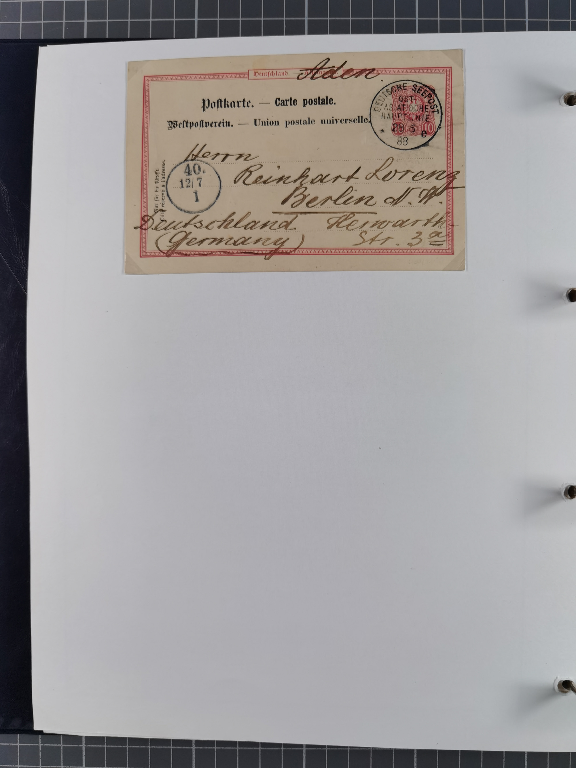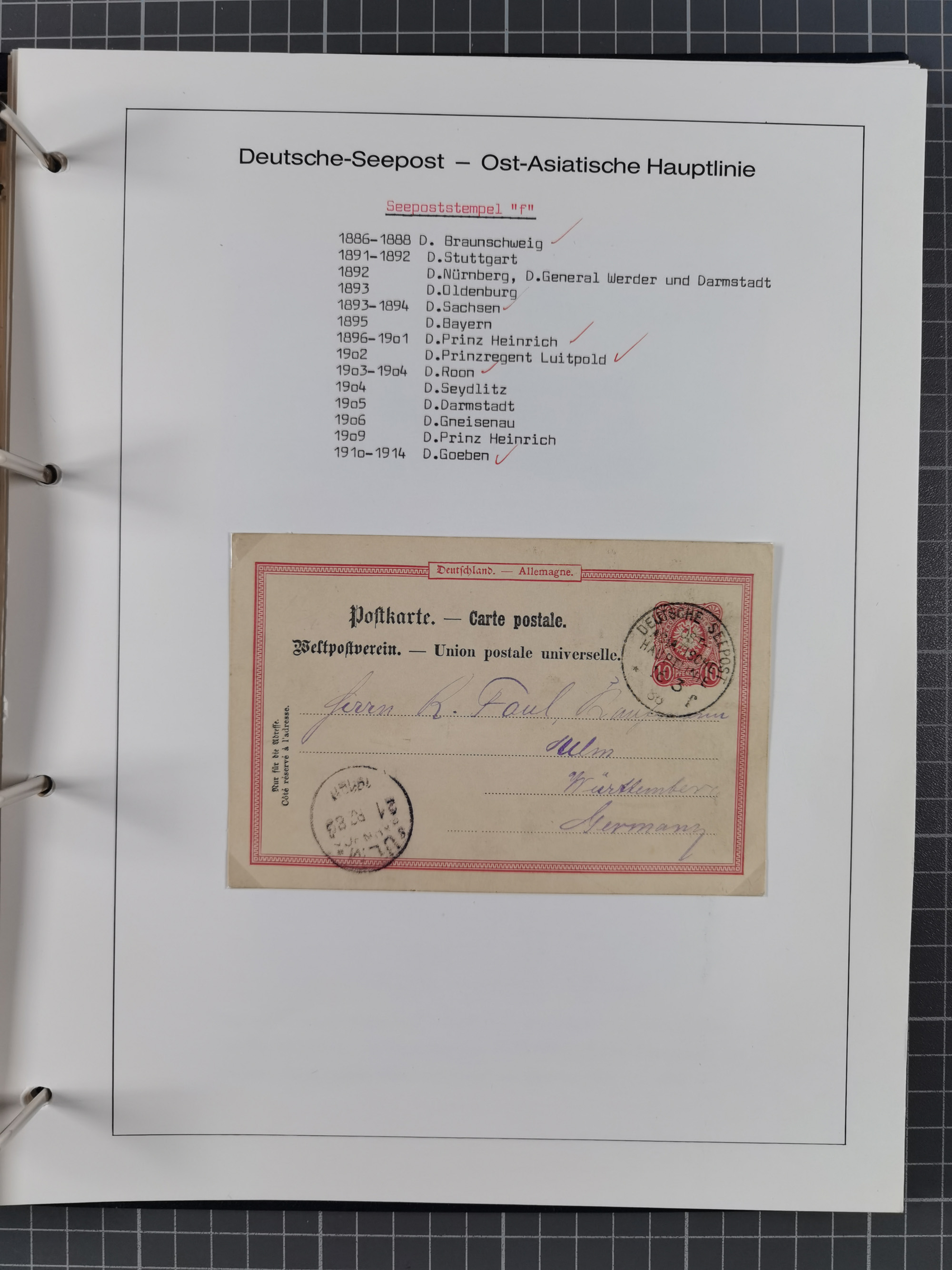 “DSP OST-ASIATISCHE-ZWEIGLINIE *a 18.10.88” (D. General Werder) klar auf Ganzsachenkarte 10 Pfg. mit Text und Datierung “An Bord General Werder 18/10/18” via Kobe nach Hongkong mit Ankunftsstempel vom 26.10.1888, in einwandfreier Erhaltung. Eine schöne Karte mit diesem seltenen Stempel