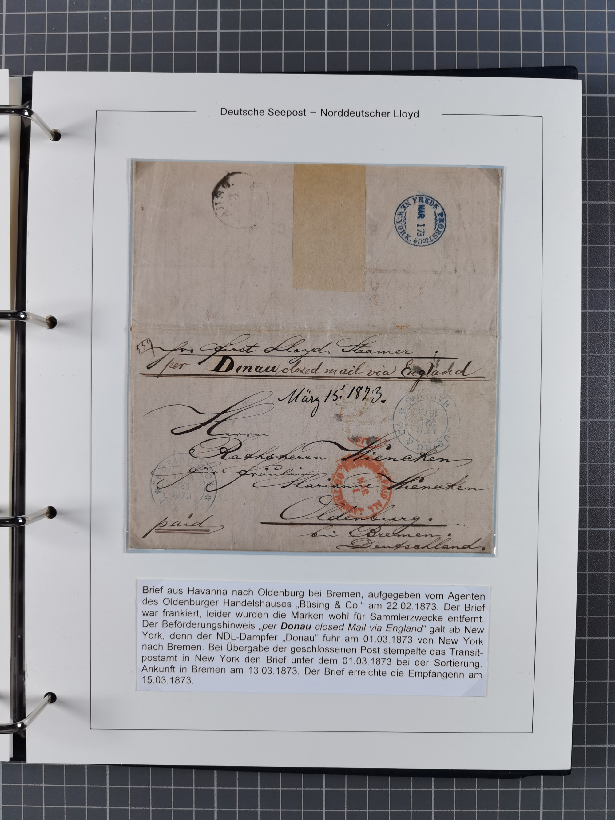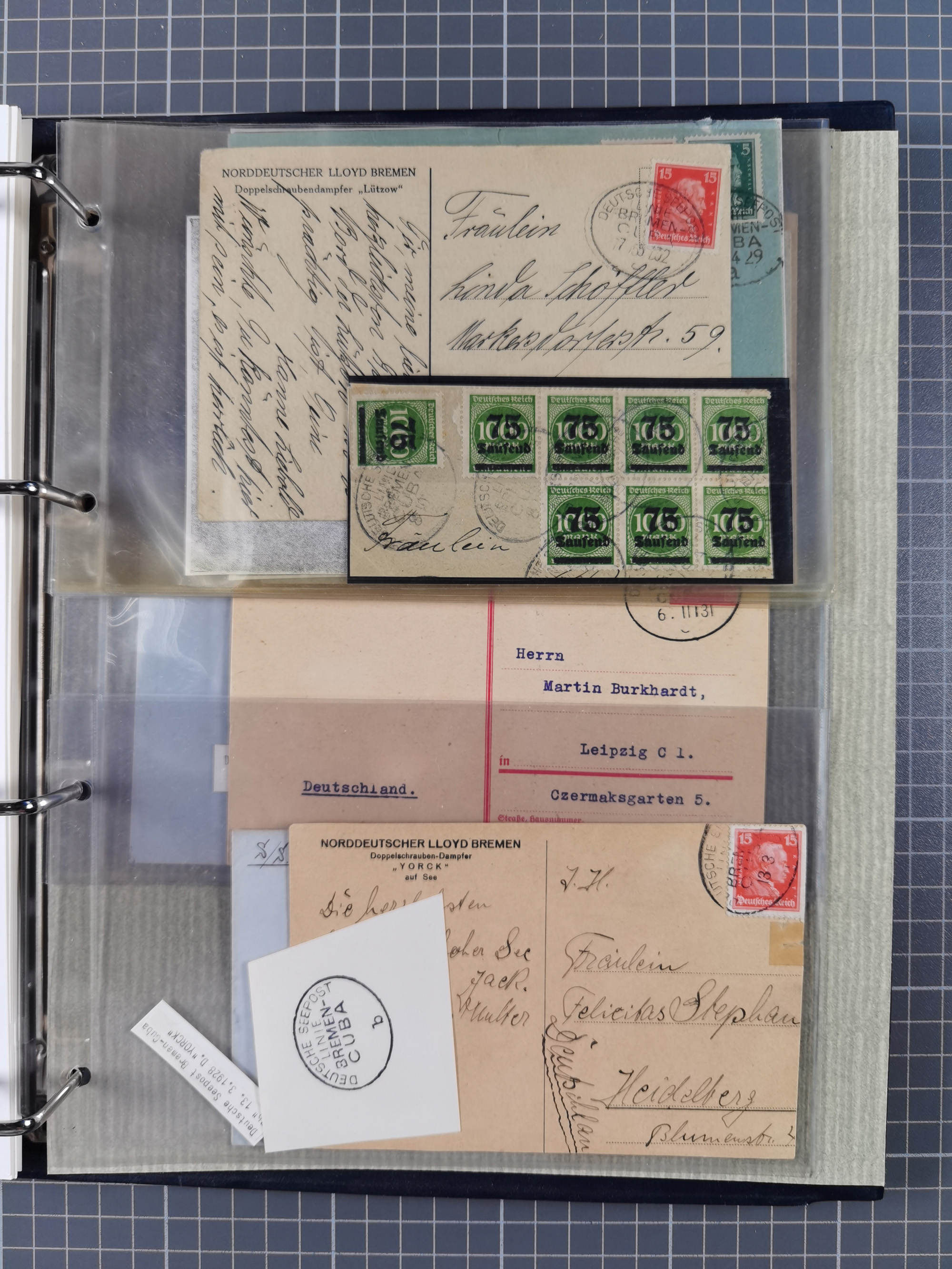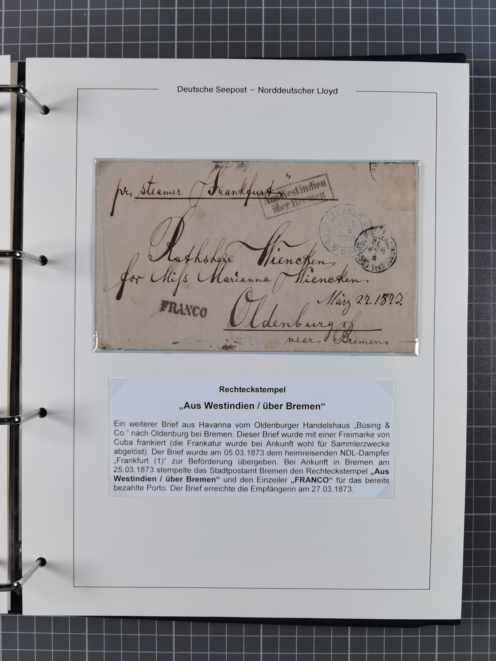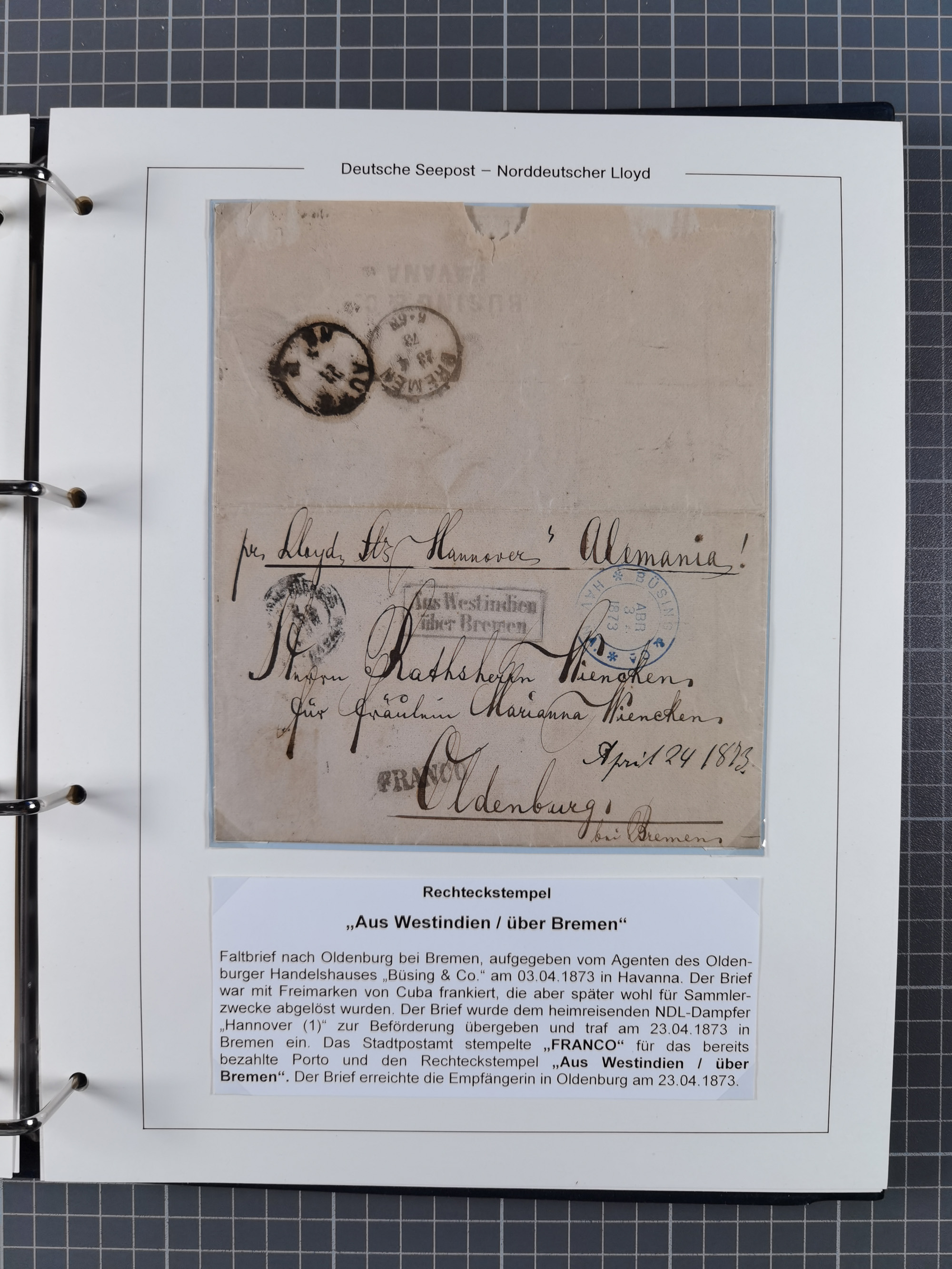1873/1932, kleine Sammlung “DSP LINIE BREMEN-CUBA” mit 10 Briefen, Karten und Ganzsachen, dabei Bedarfspost. Dazu sieben Briefe 1873/74 aus einer Korrespondenz aus Havanna mit entfernter Frankatur nach Oldenburg, dabei drei Briefe mit seltenem Ra2 “Aus Westindien über Bremen”
