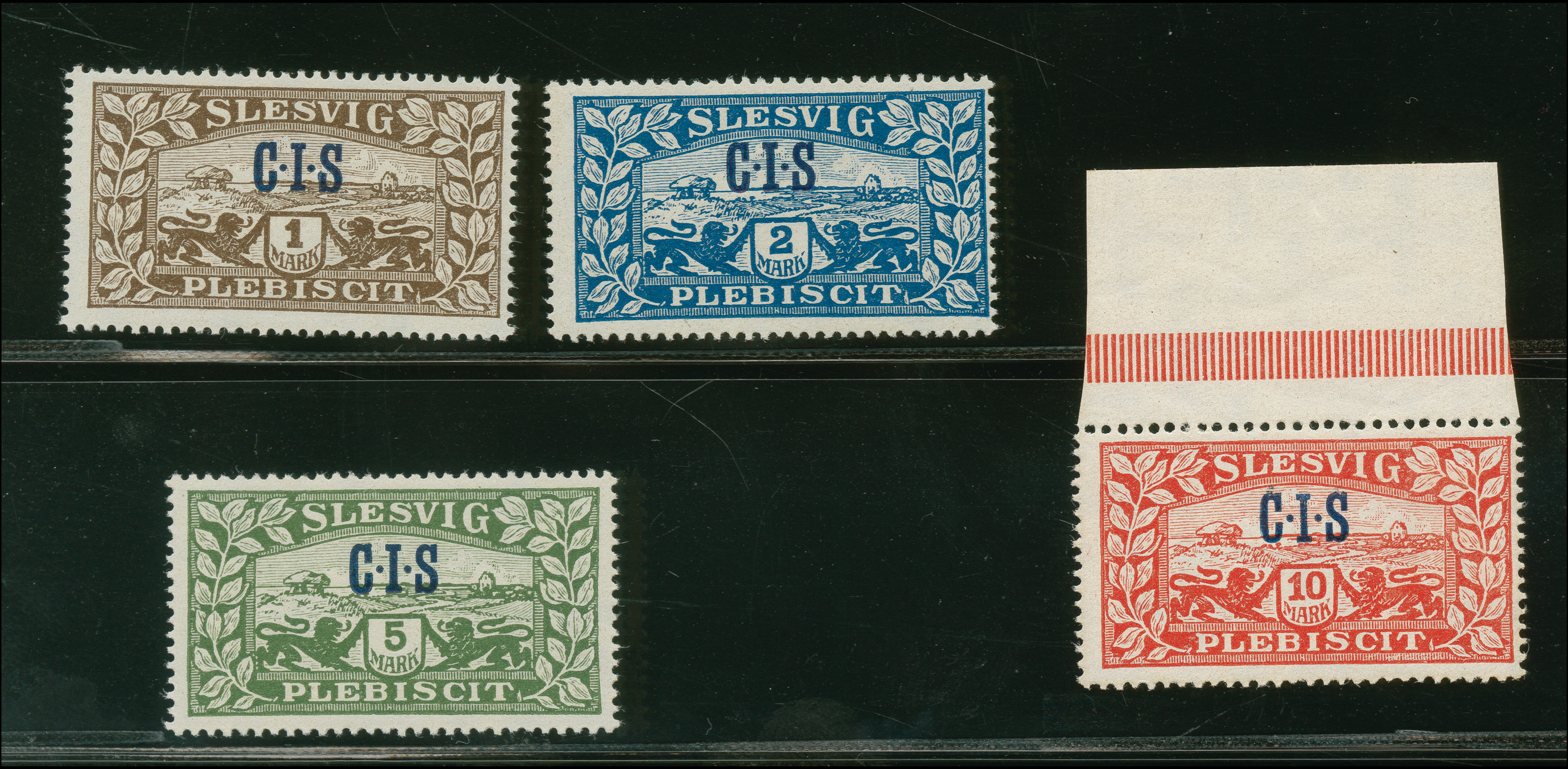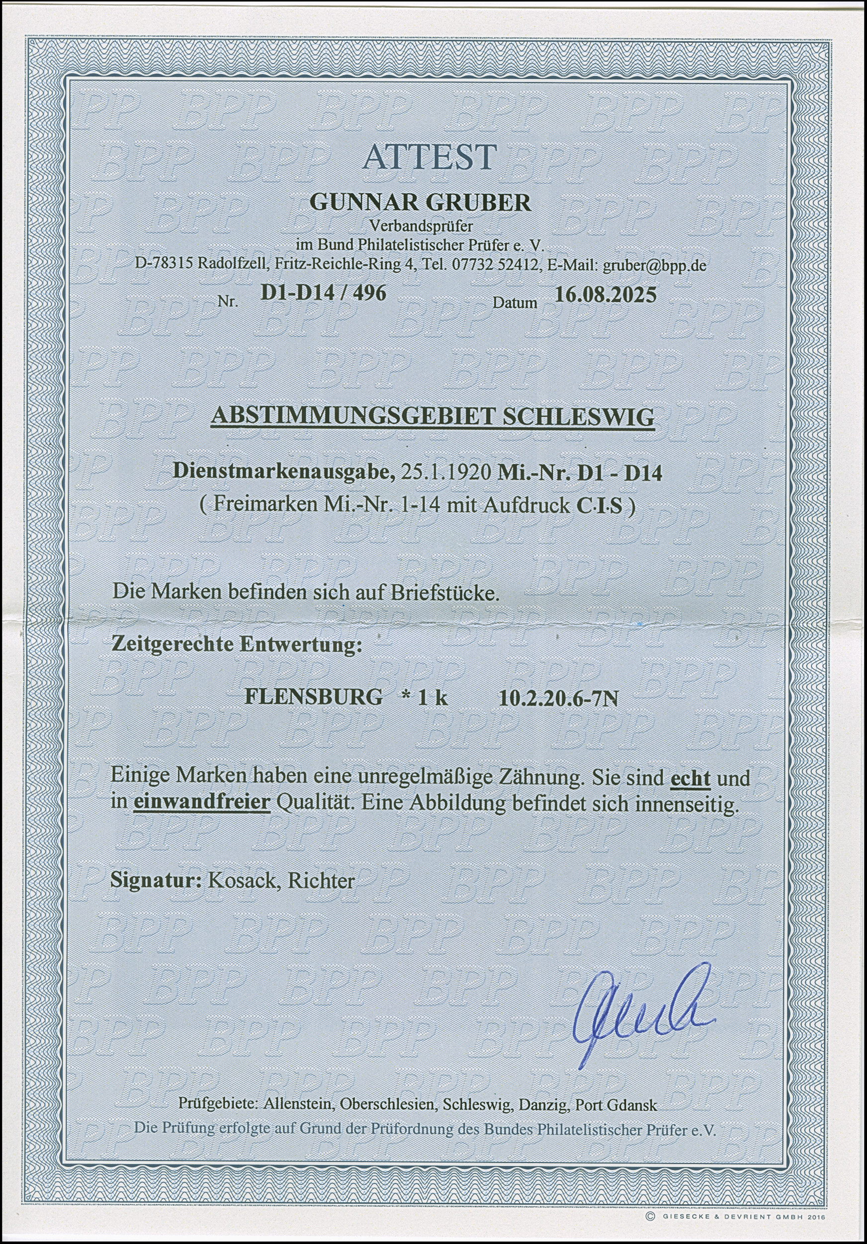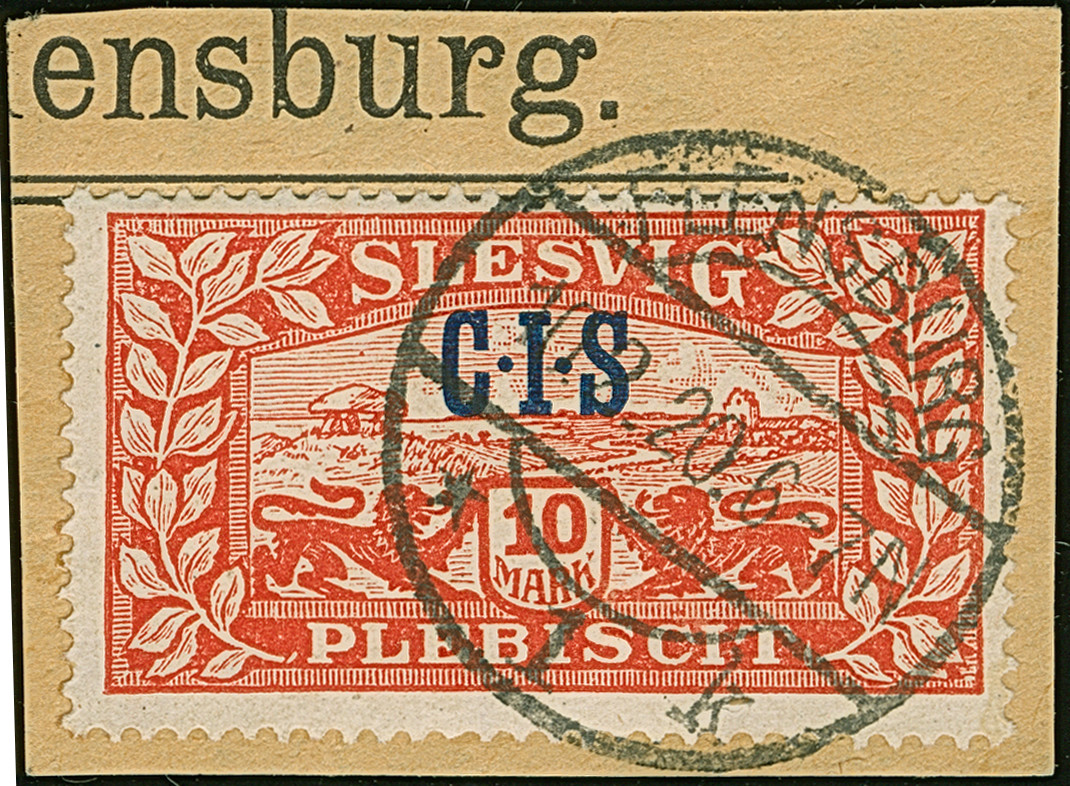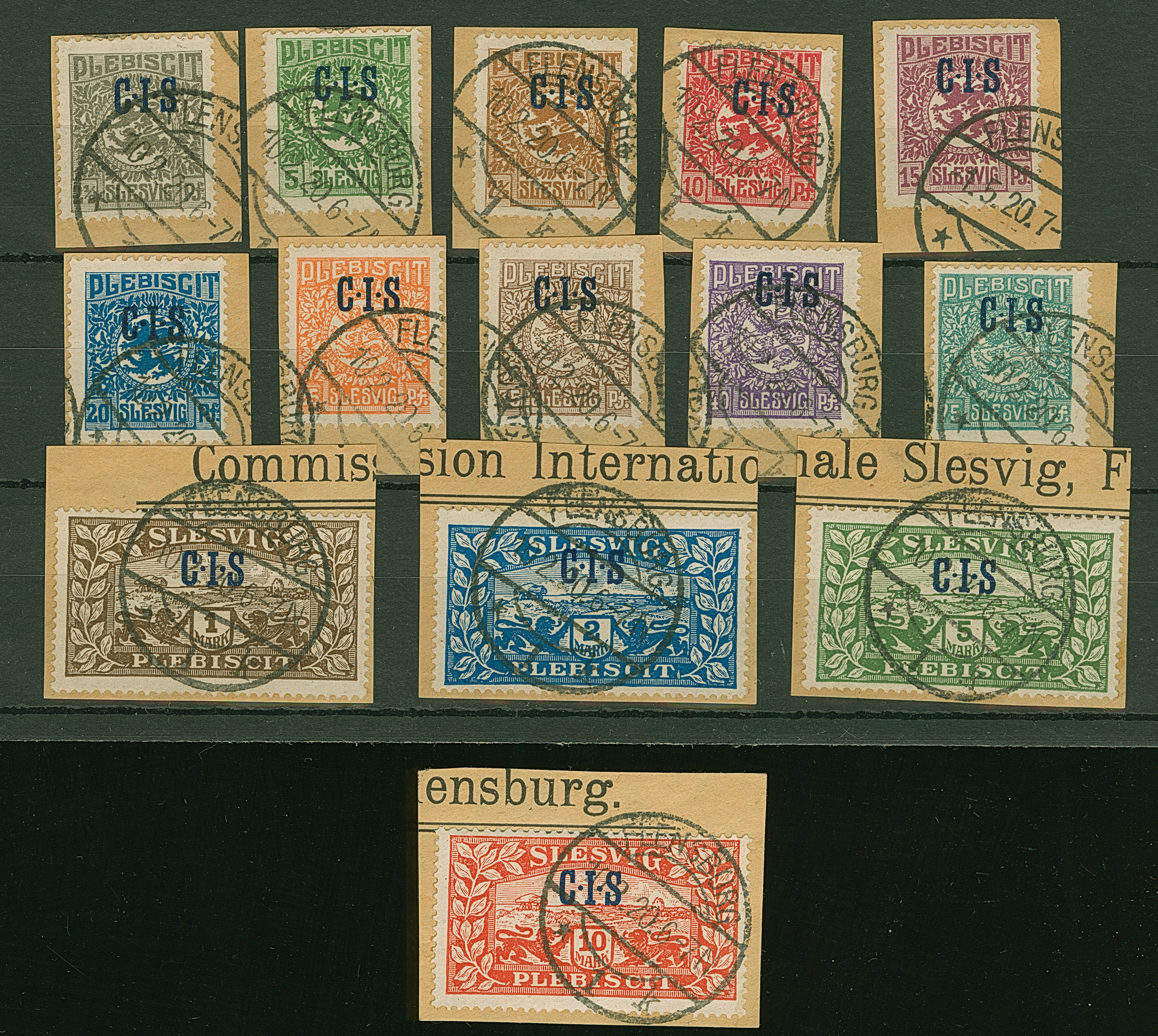 1920, C.I.S. 2 ½ Pfg. – 10 M., je mit sauberem Stempel "FLENSBURG 1k 10.2.20" auf Briefstücken. Einwandfrei. Fotoattest Gruber BPP (2025)