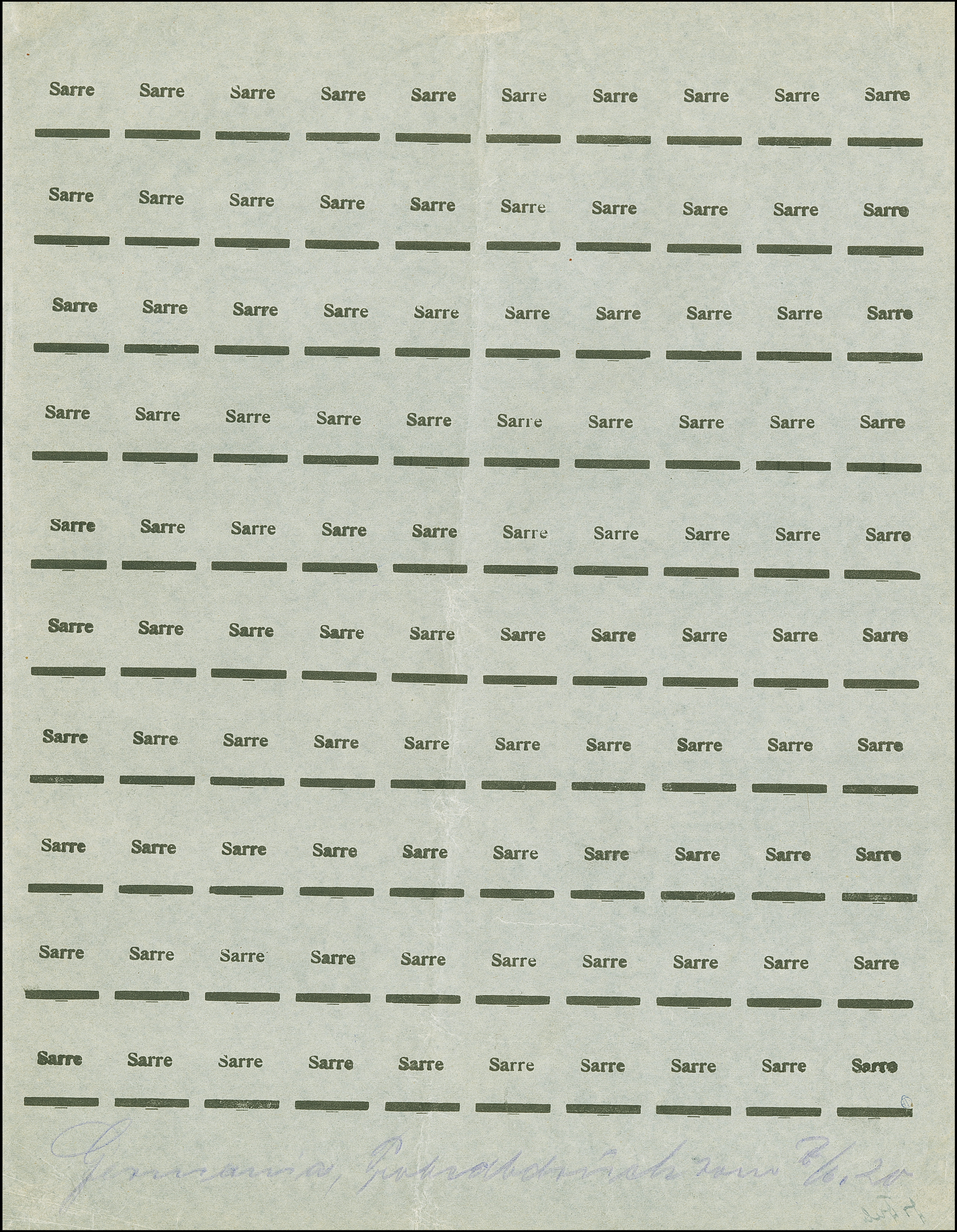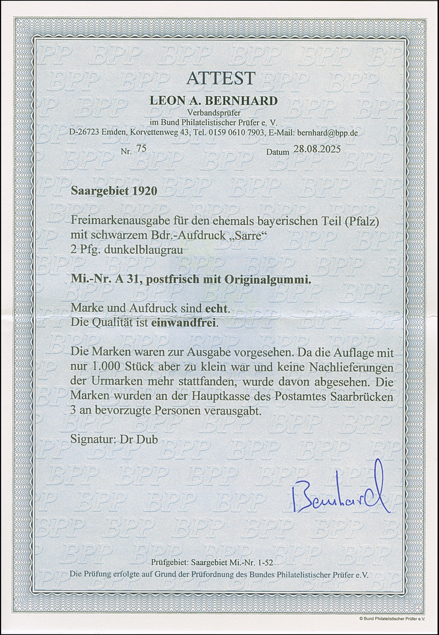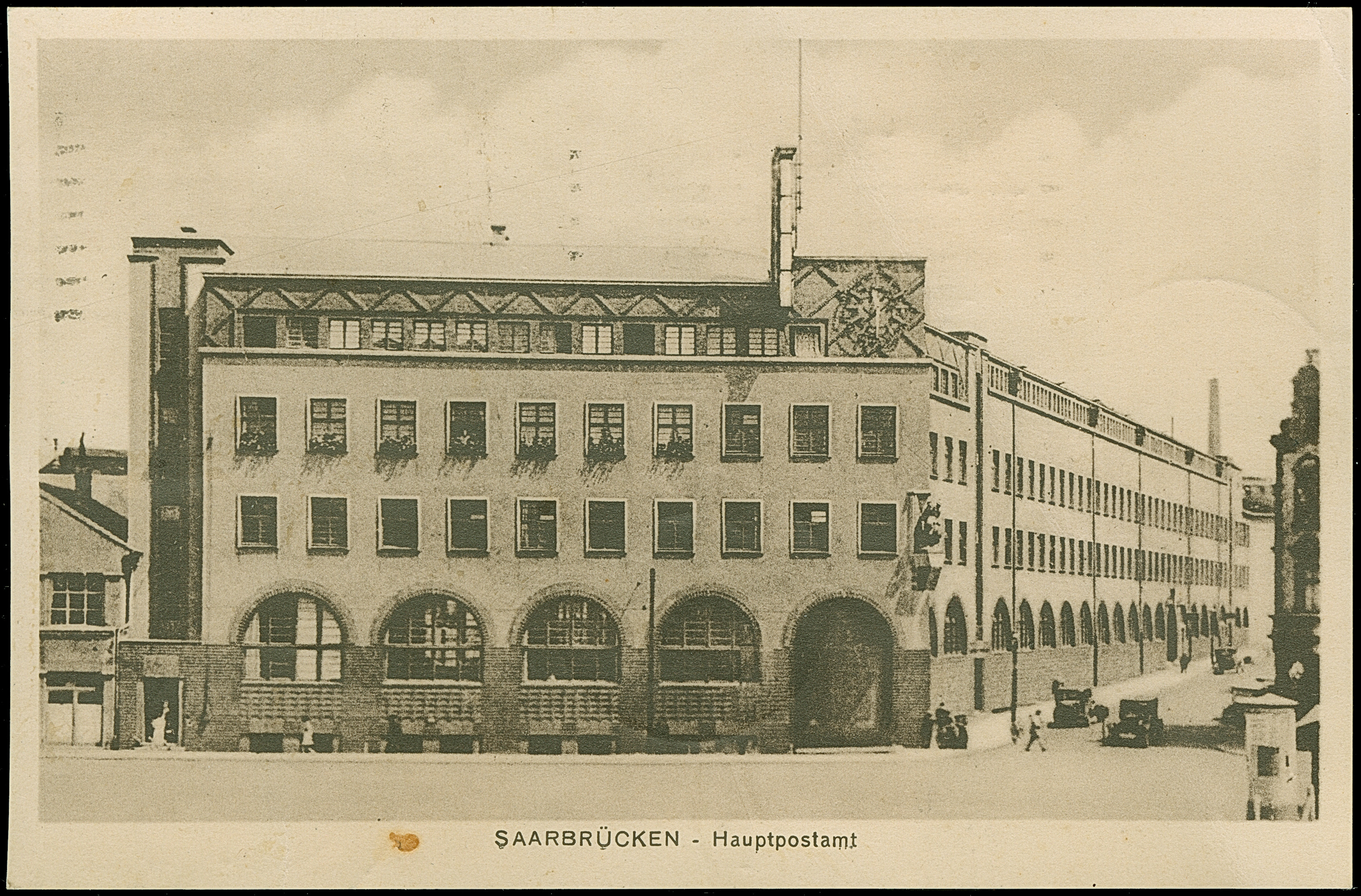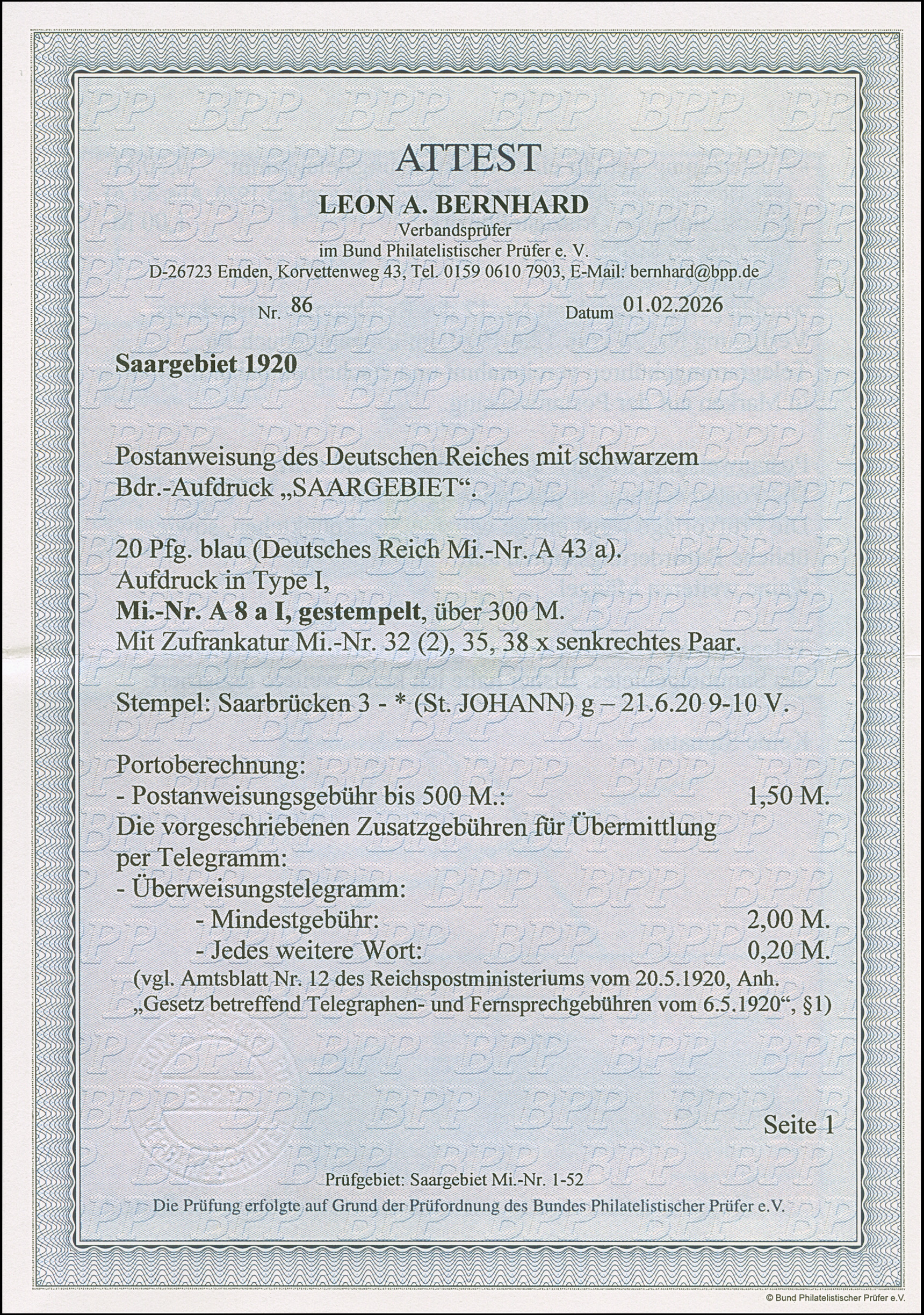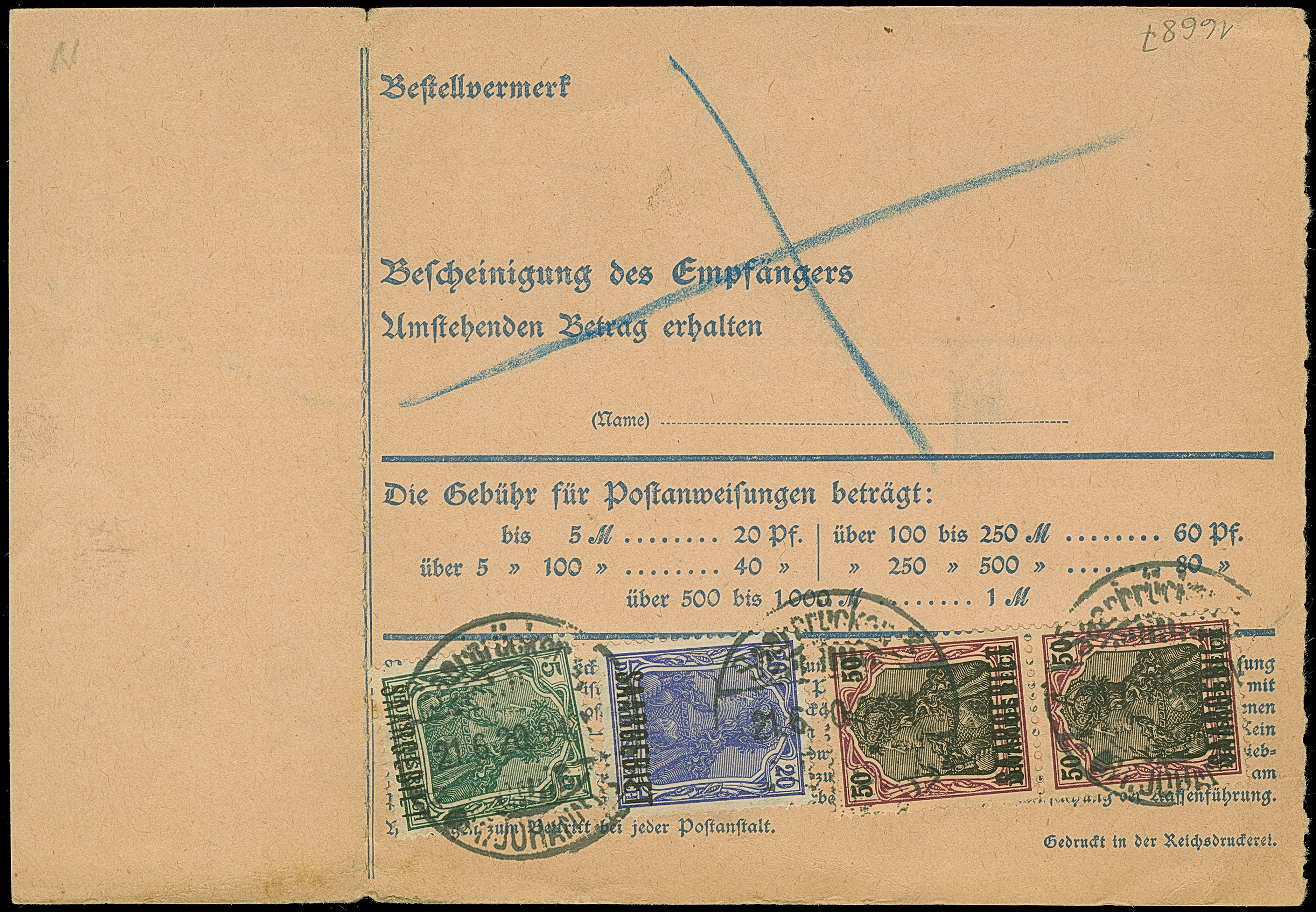 1920, 50 Pfg. im senkrechten Paar, 20 Pfg. und zwei Einzelmarken 5 Pfg. jeweils mit Stempel “Saarbrücken 3 (St. JOHANN) 21.6.20” als tarifgerechte Zufrankatur vorder- und rückseitig auf kpl. Ganzsachen-Postanweisung 20 Pfg. für 300 M. mit handschriftlichem Vermerk “Telegraphisch” nach Wilhelmsburg. Die vorgeschriebenen Zusatzgebühren für die Übermittlung per Telegramm wurden nicht verklebt, sondern laut Verfügung Nr. 26 vom 12.4.1920 im Einnahmebuch für Telegrammgebühren vereinnahmt. Die Marken zum Teil kleinen Stockflecken in der Zähnung und das Formular mit Beförderungsspuren. In dieser Art als Telegraphische Postanweisung ist aus dem Saargebiet bisher kein weiteres Exemplar registriert, Fotoattest Bernhard BPP (2026)