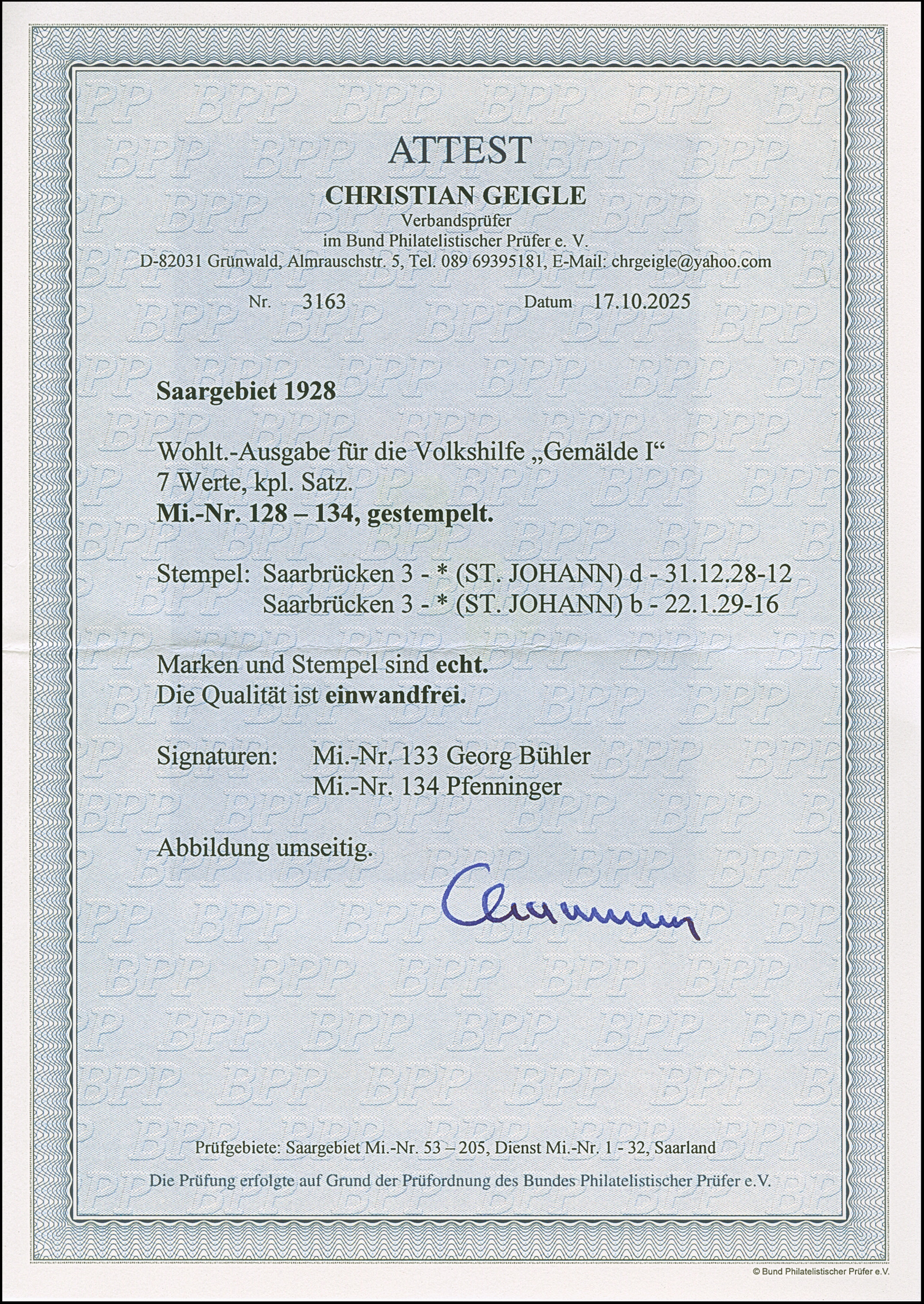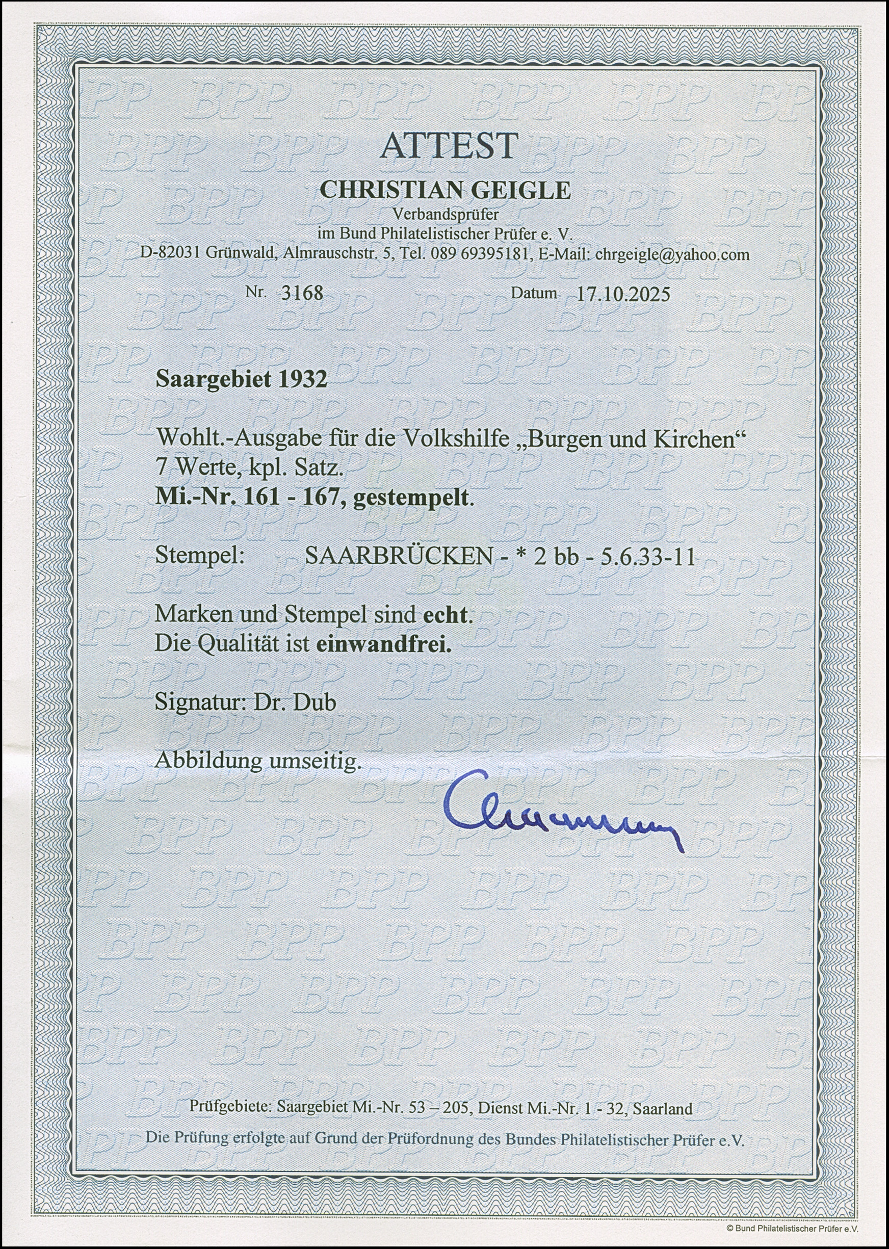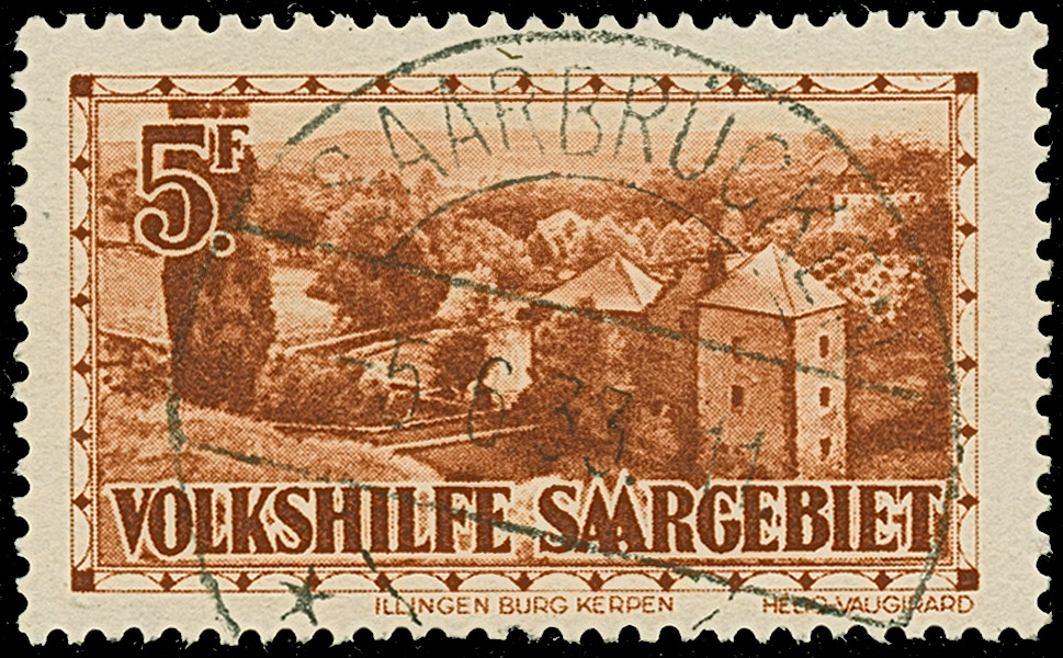 1932, Volkshilfe 40 C. -5 Fr., sauber gestempelt "SAARBRÜCKEN 5.6.33". Einwandfrei. Signiert Dr. Dub, Fotoattest Geigle BPP (2025)