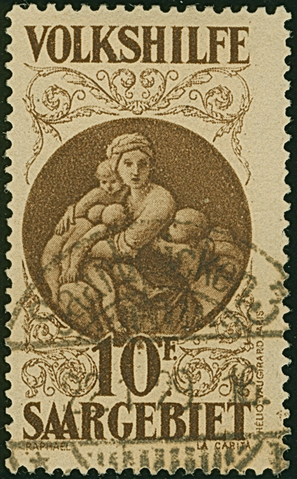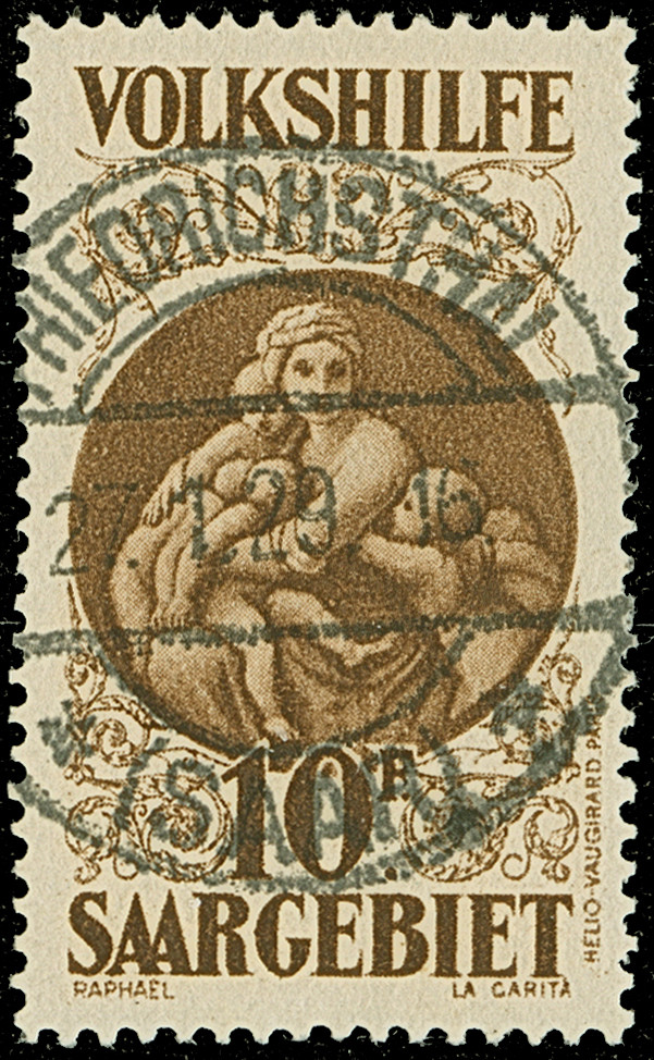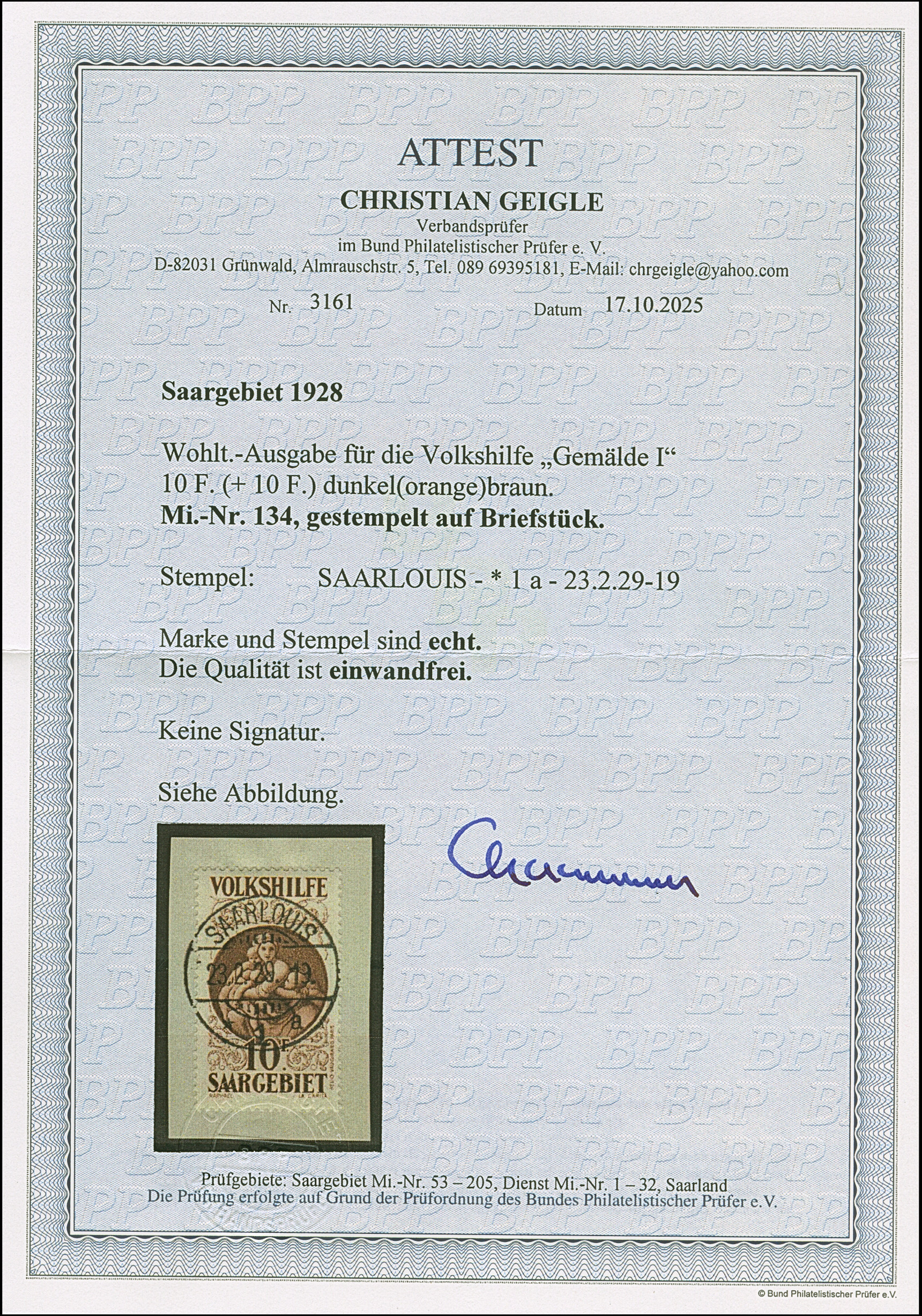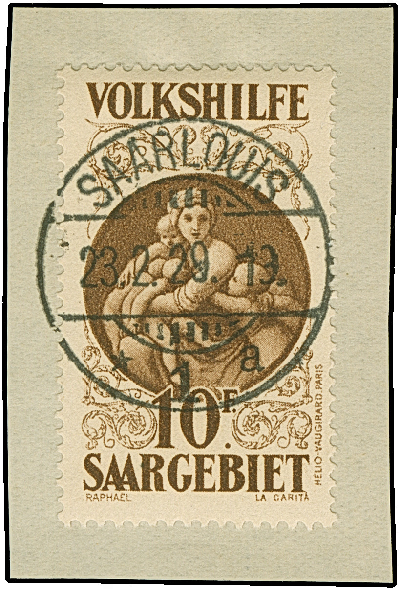 1928, Volkshilfe 10 Fr., sauber gestempelt "SAARLOUIS 23.2.29", auf Briefstück. Einwandfrei. Fotoattest Geigle BPP (2025)