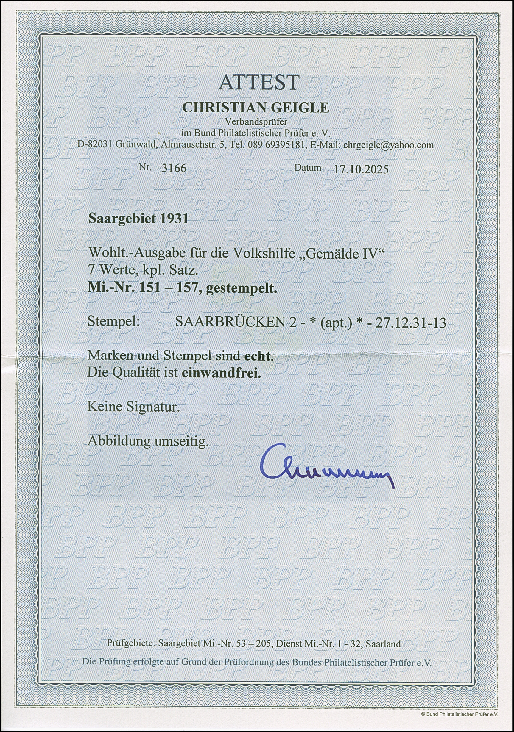 1931, Volkshilfe 40 C. -5 Fr., sauber gestempelt "SAARBRÜCKEN 27.12.31". Einwandfrei. Fotoattest Geigle BPP (2025)