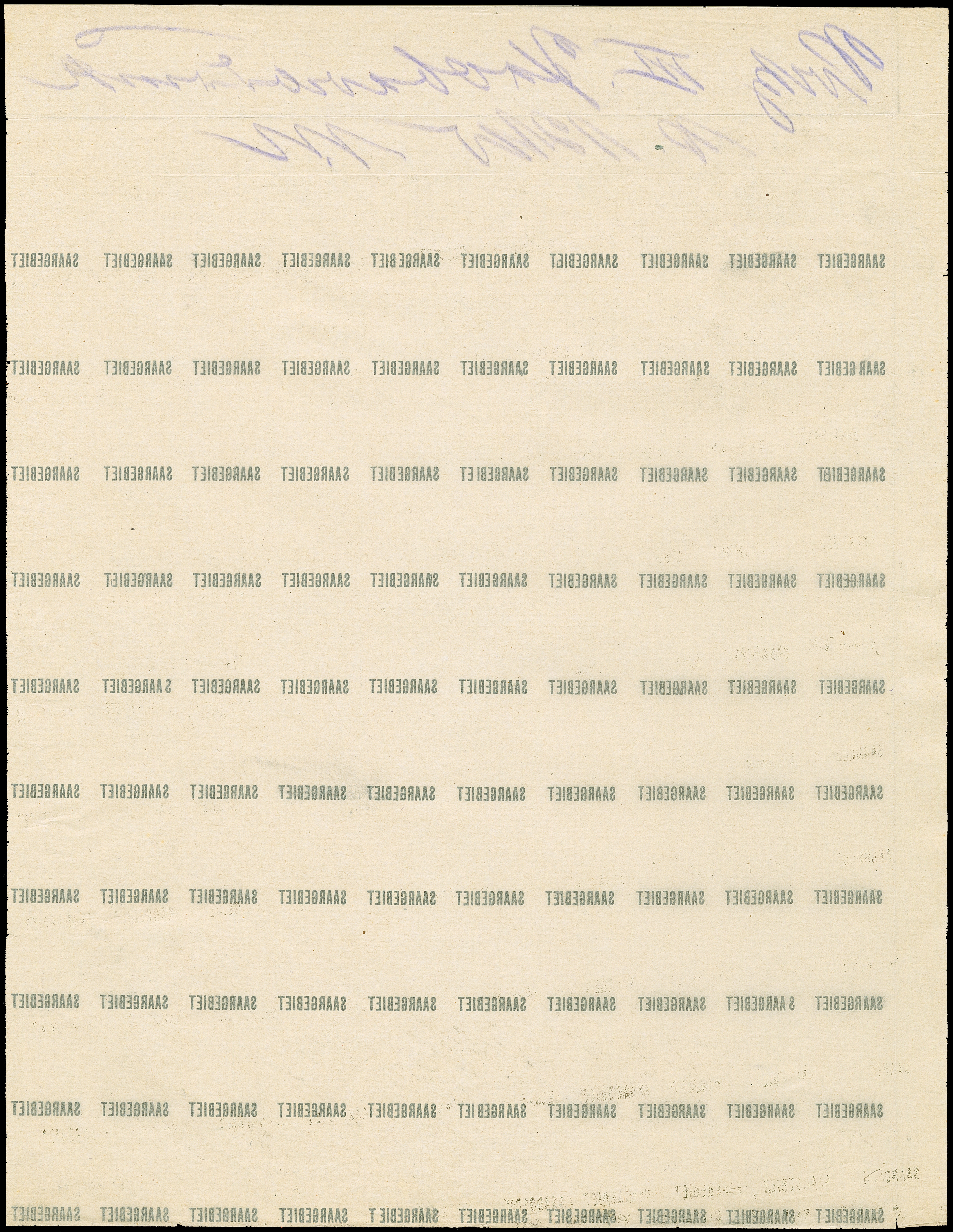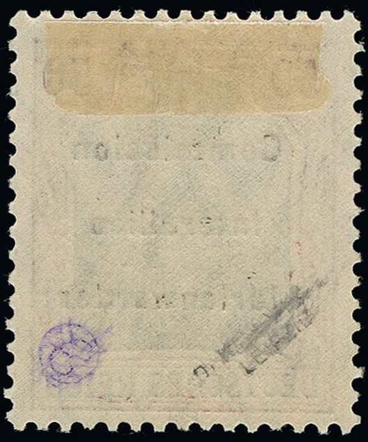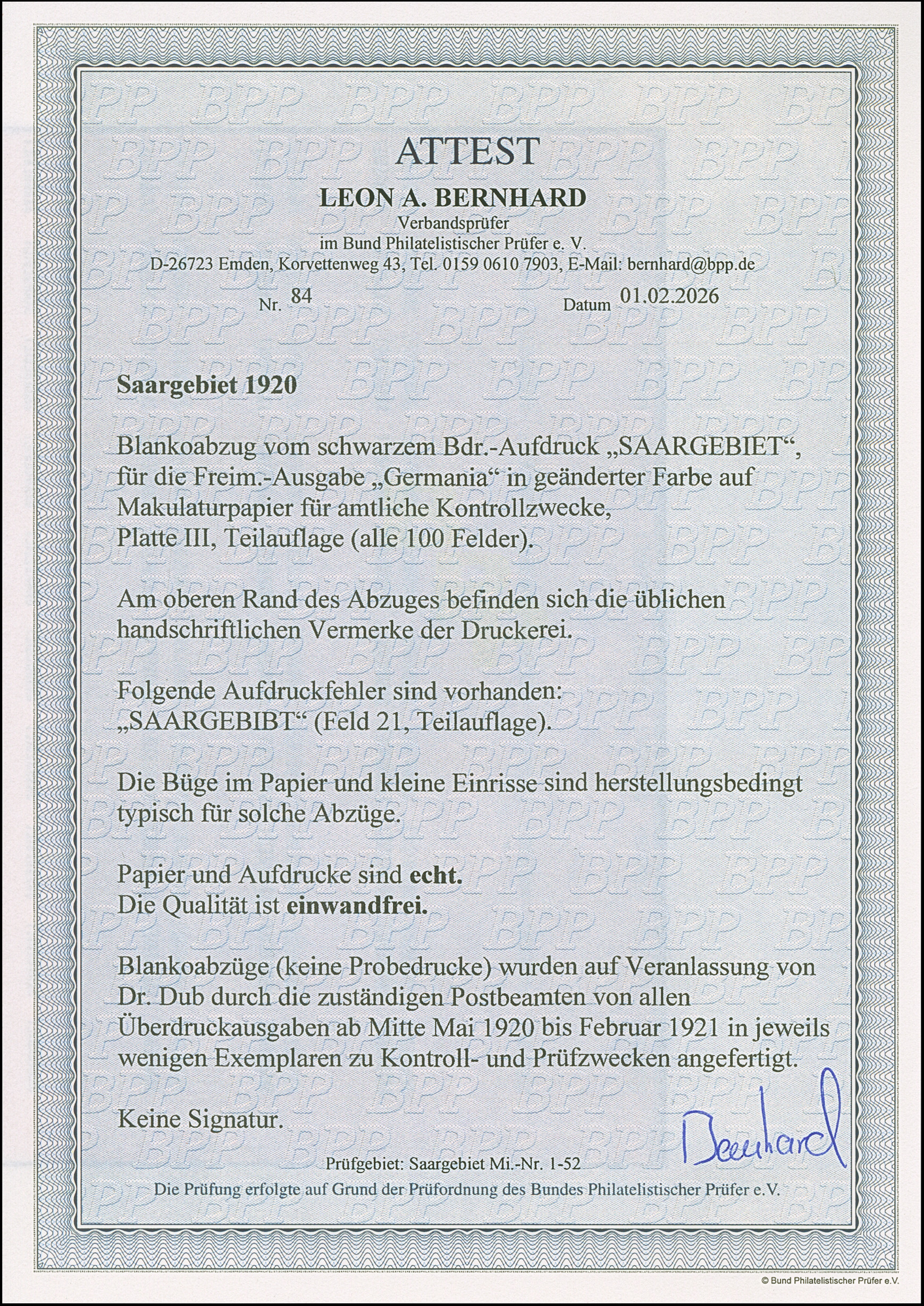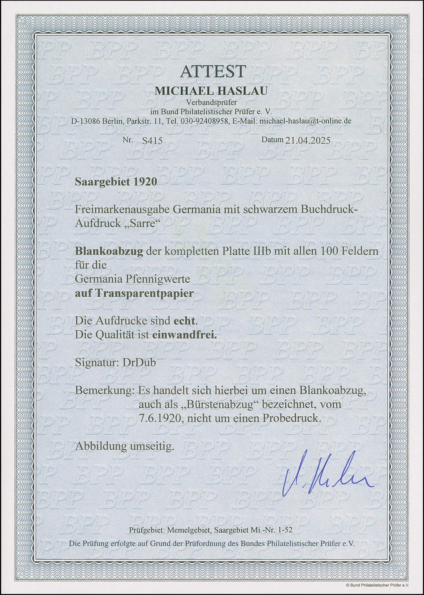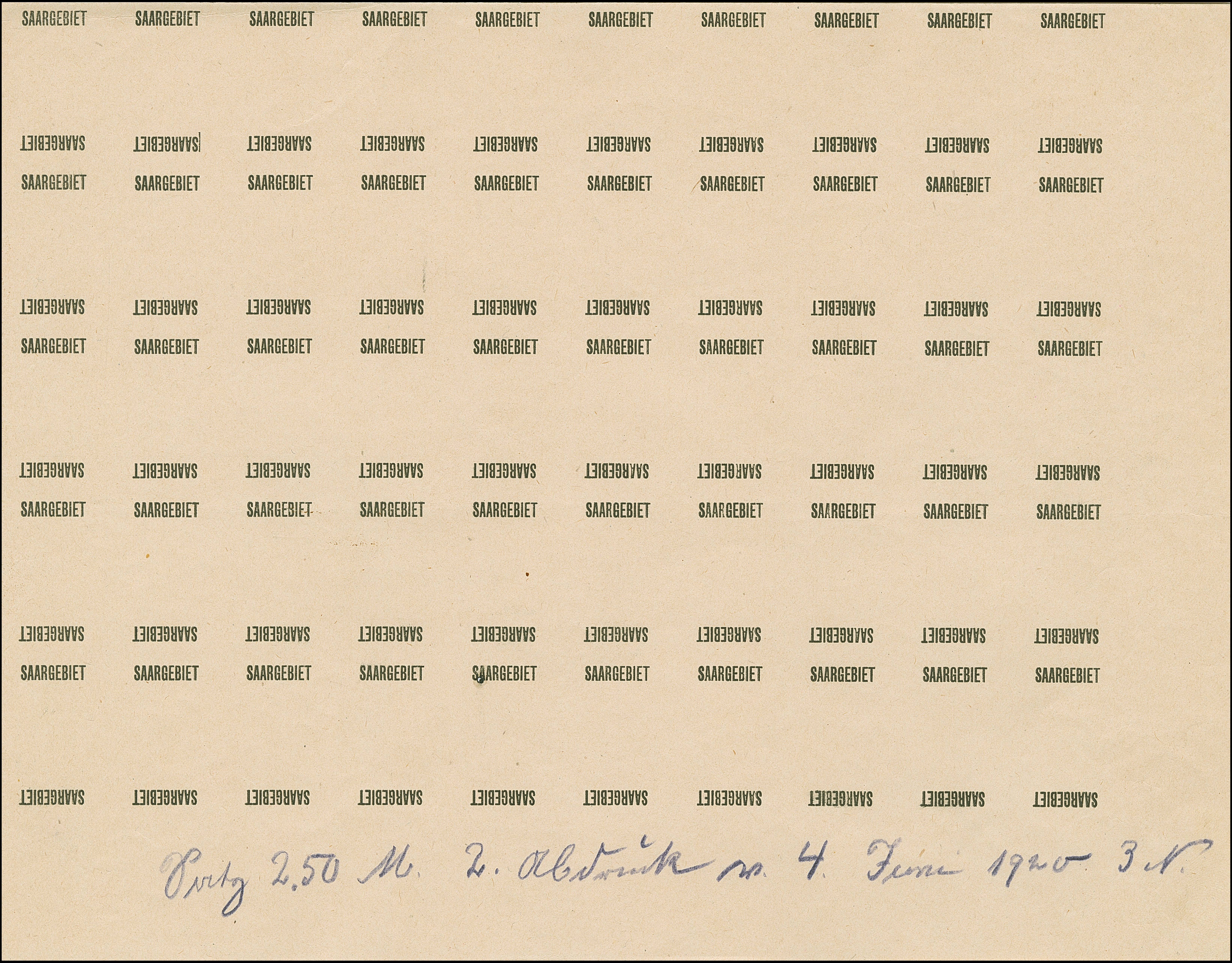 1920, Kontrollabzug der Aufdruckplatte III-b auf dünnem Maschinenpapier, im Unterrand mit handschriftlicher Angabe “Germania, Probeabdruck vom 7/6. 20”, Falzreste und wie üblich leicht bügig, einwandfrei. Sign. Dub sowie Fotoattest Haslau BPP (2025)