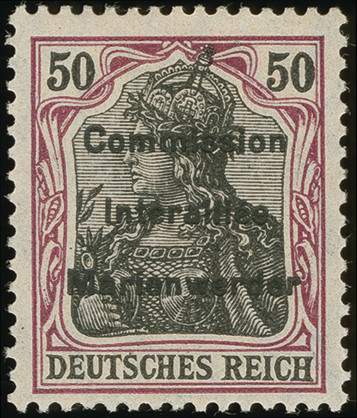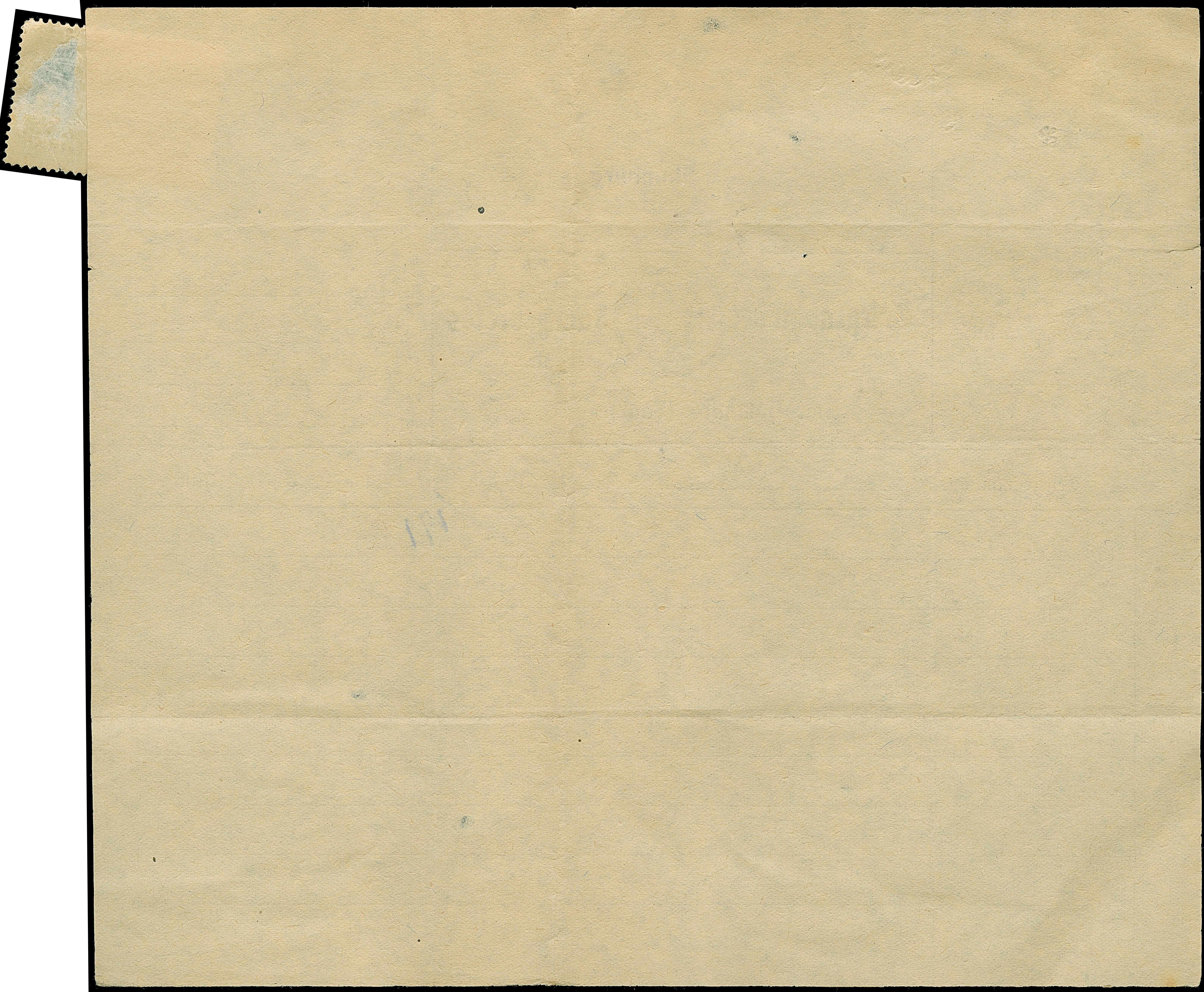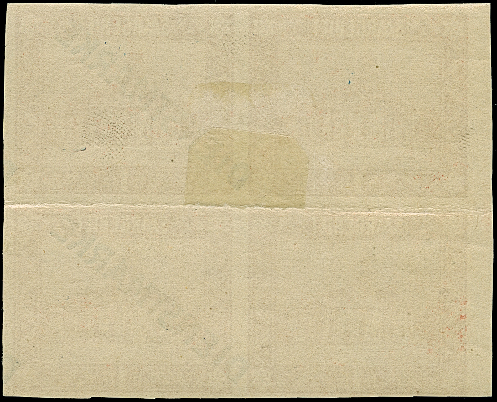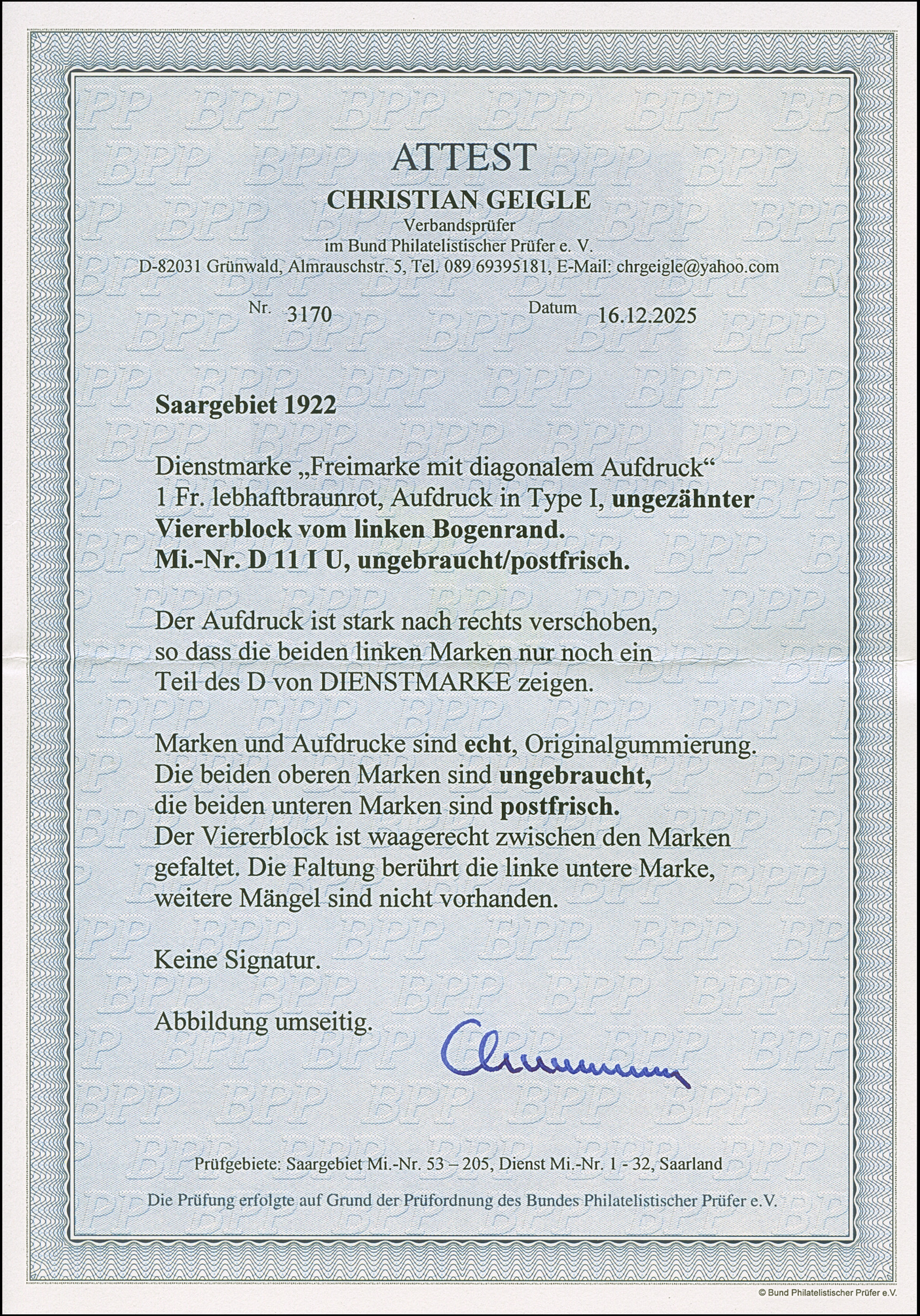 1922, 1 Fr., Aufdruck in Type I, ungezähnter Viererblock vom linken Bogenrand, dabei die linken Marken ohne Aufdruck (kleiner Teil des Aufdrucks der rechten Marken übergehend), ungebraucht, das untere Paar postfrisch. Mittig waagerecht zwischen den Marken gefaltet, dadurch die linke untere Marke leicht berührt. Eine äußerst seltene Einheit in sonst einwandfreier Erhaltung.