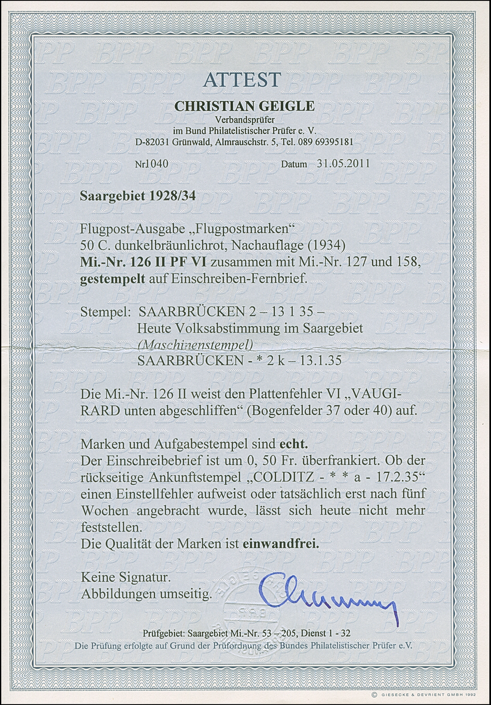1928, Flugpost, Nachauflage 50 C. mit Plattenfehler „VAUGIRARD unten abgeschliffen“ auf um 0,50 Fr. überfrankiertem R-Brief mit Flugpost 60 C. und 1 Fr. von „SAARBRÜCKEN 13.1.35“ nach Golditz mit Ankunftsstempel (Fehldatum), Umschlag leichte Randspuren, Marken tadellos, selten, Fotoattest Geigle BPP (2011) ex Axel Kruse