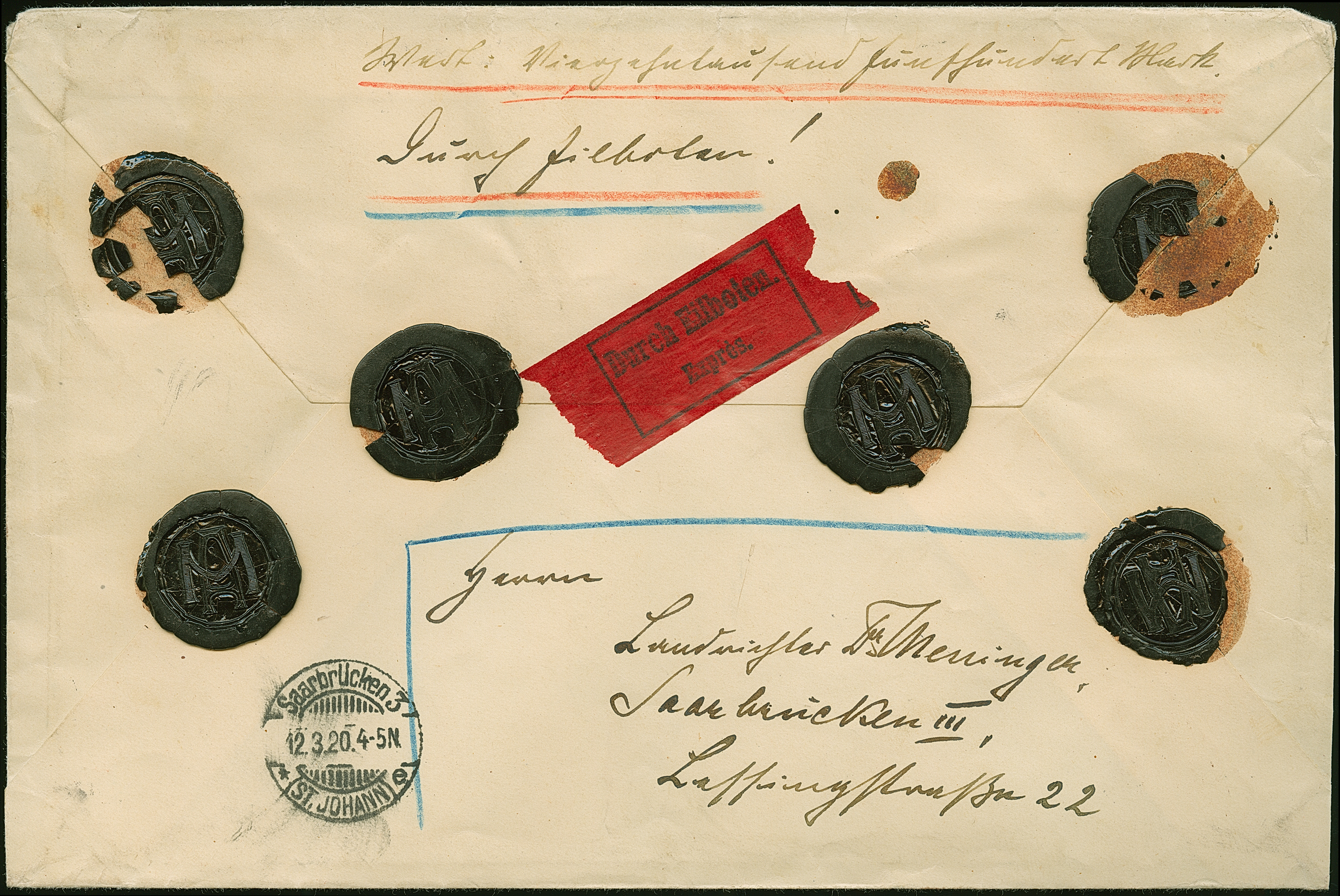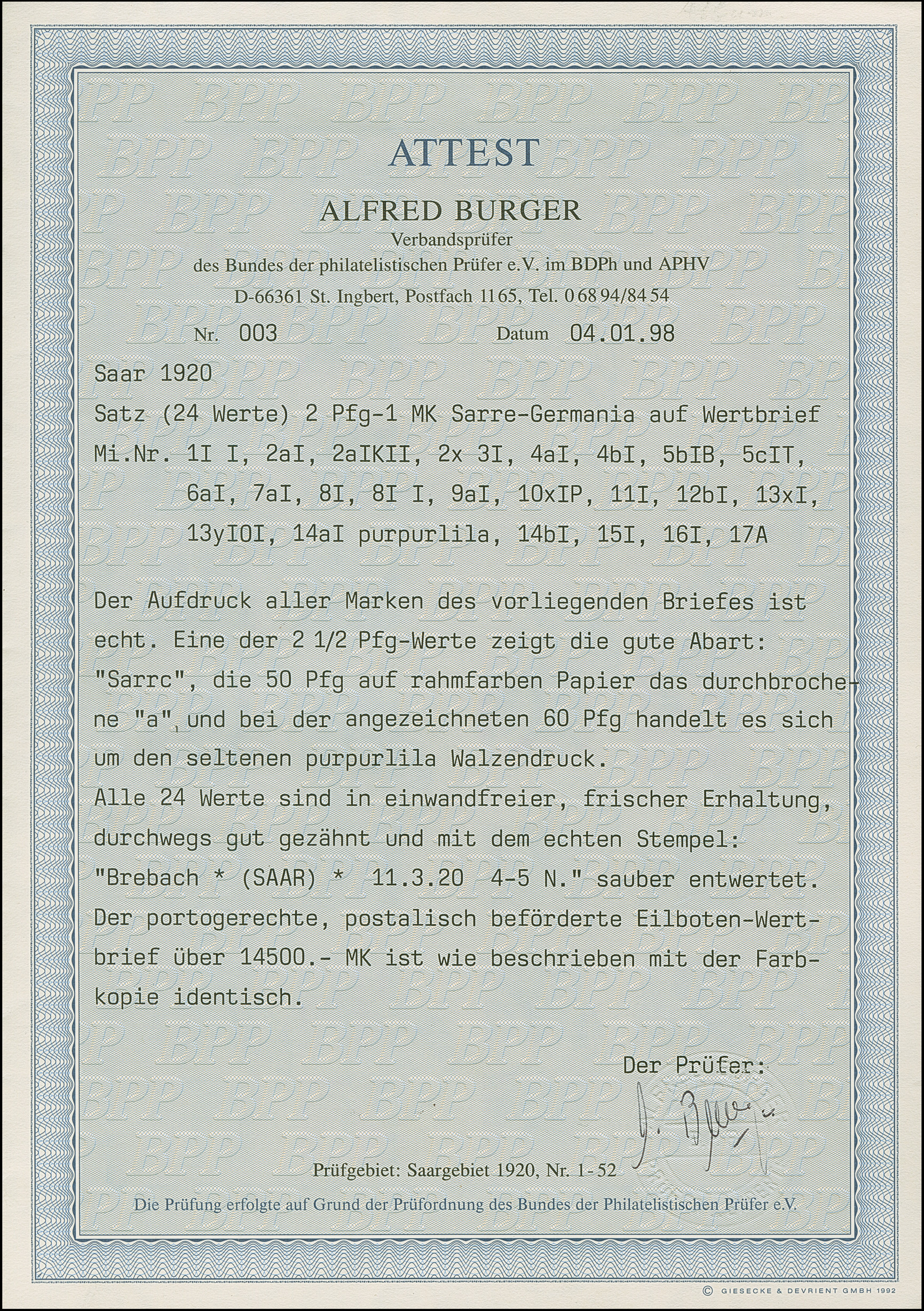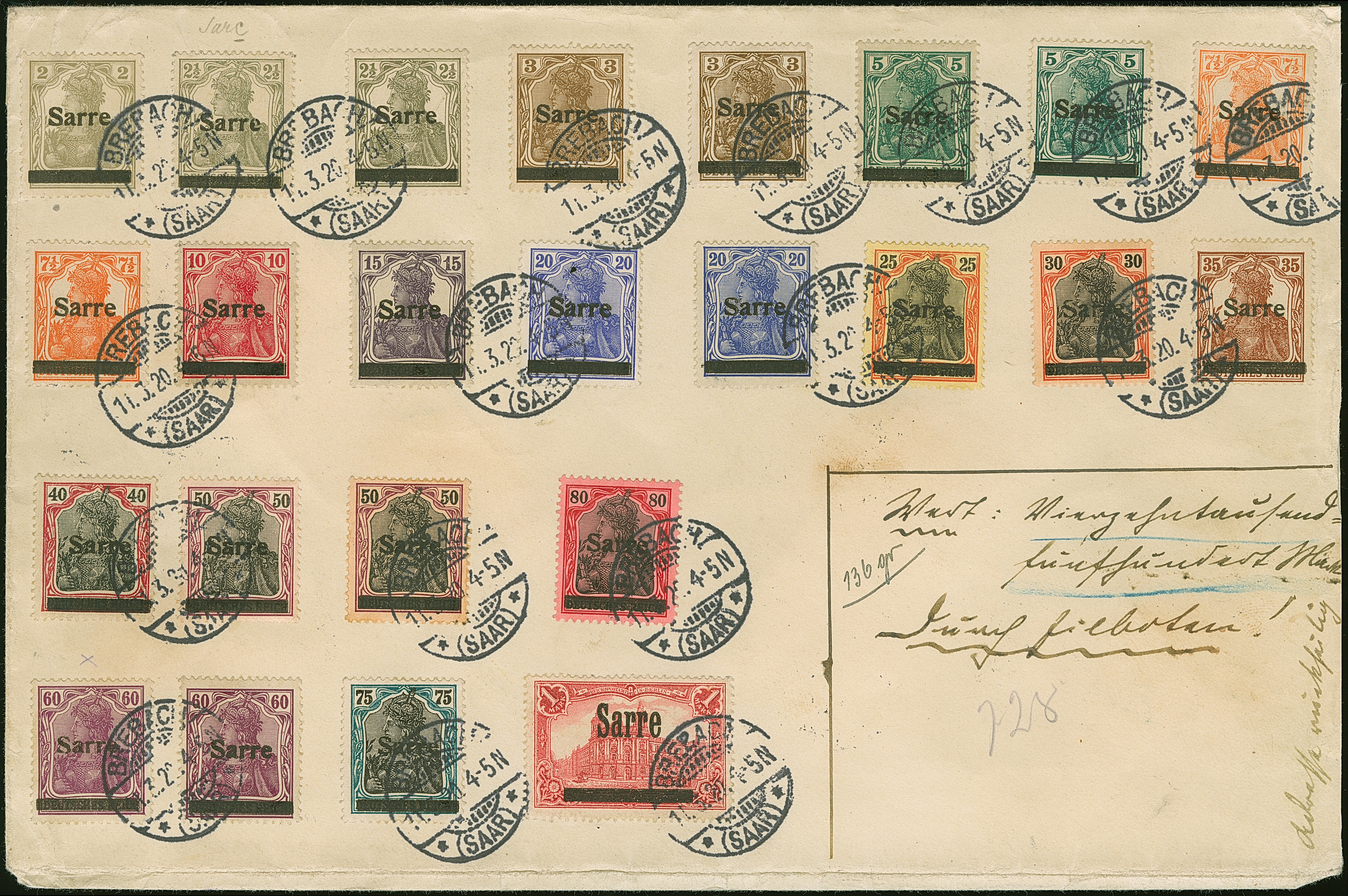 1920, Germania 2 Pfg.-1 M., überkompletter Satz mit 24 Werten inkl. Farben, Aufdruckfehlern und 60 Pfg. purpurlila auf um 8 Pfg. überfrankierten Eilboten-Wertbrief von „BREBACH 11.3.20“ nach Saarbrücken mit Ankunftsstempel, Umschlag im Rand mit Beförderungsspuren und rechts durch Öffnen leicht verkürzt, 2 Pfg. mit Eckbug, die übrigen einwandfrei, Fotoattest Burger BPP (1998) (Mi. für gestempelt ca. 1.850,-) ex Axel Kruse