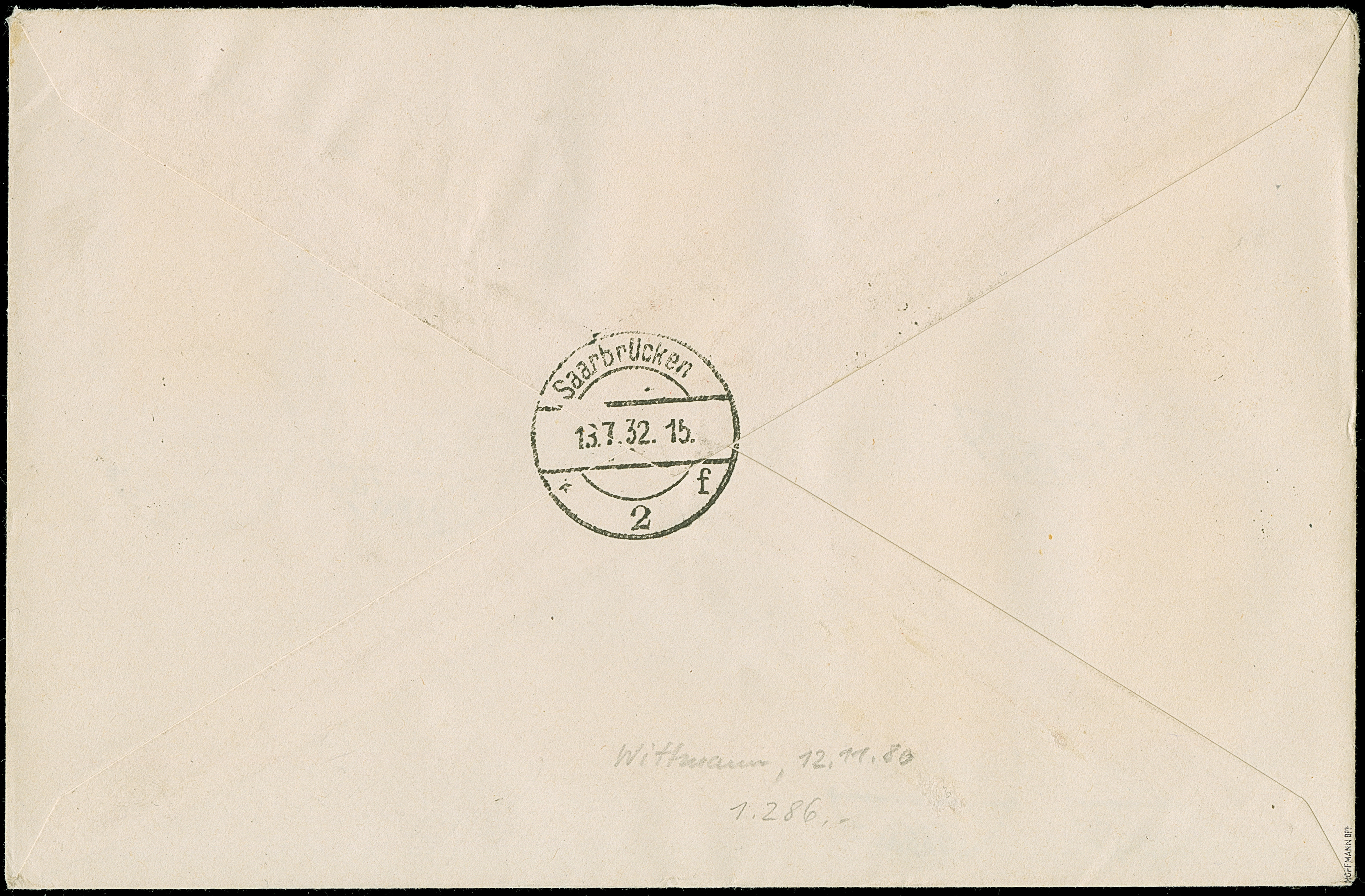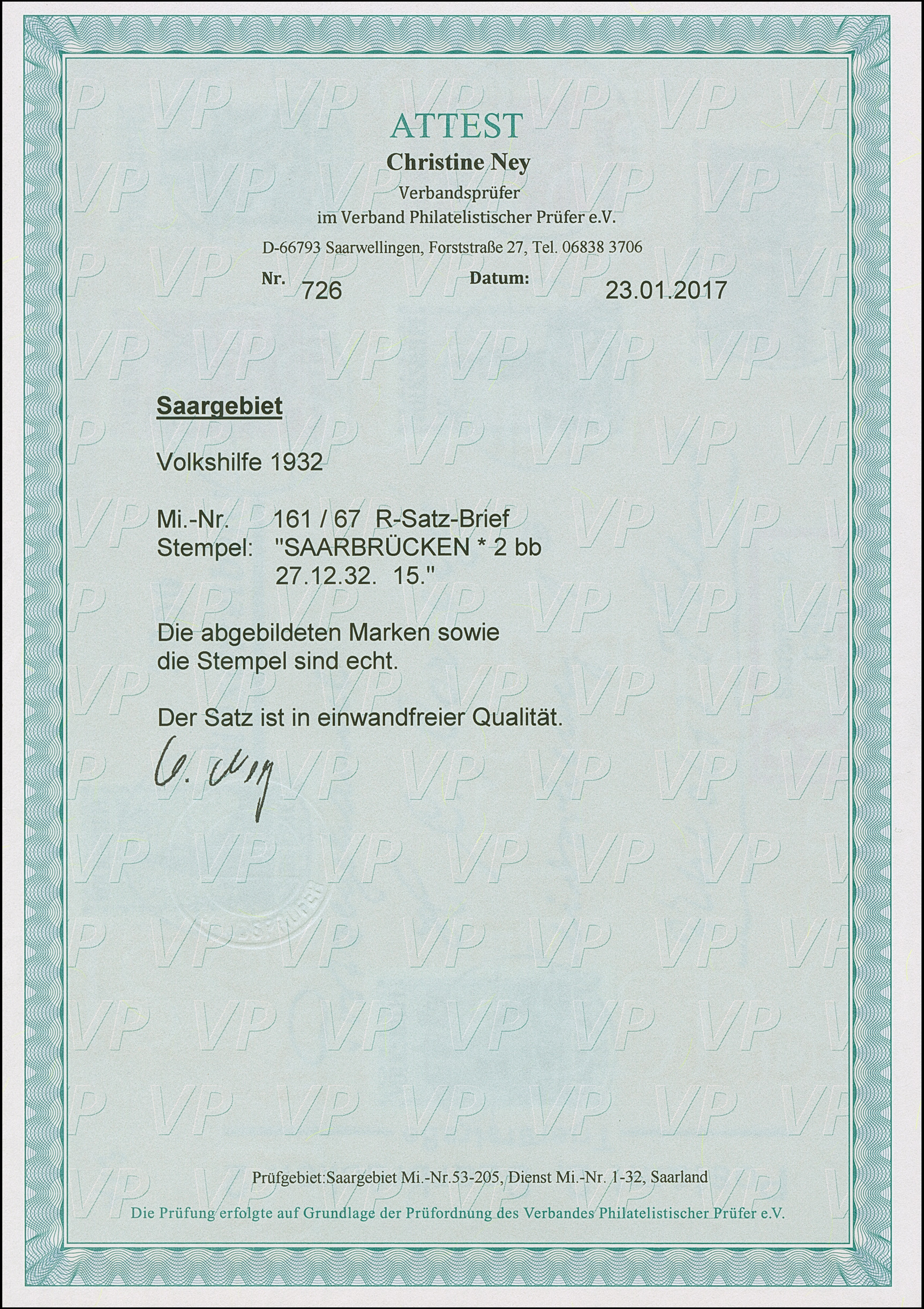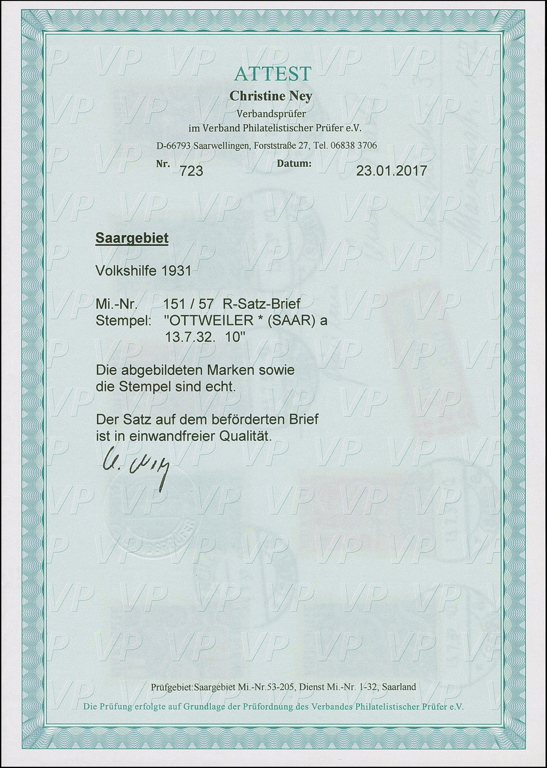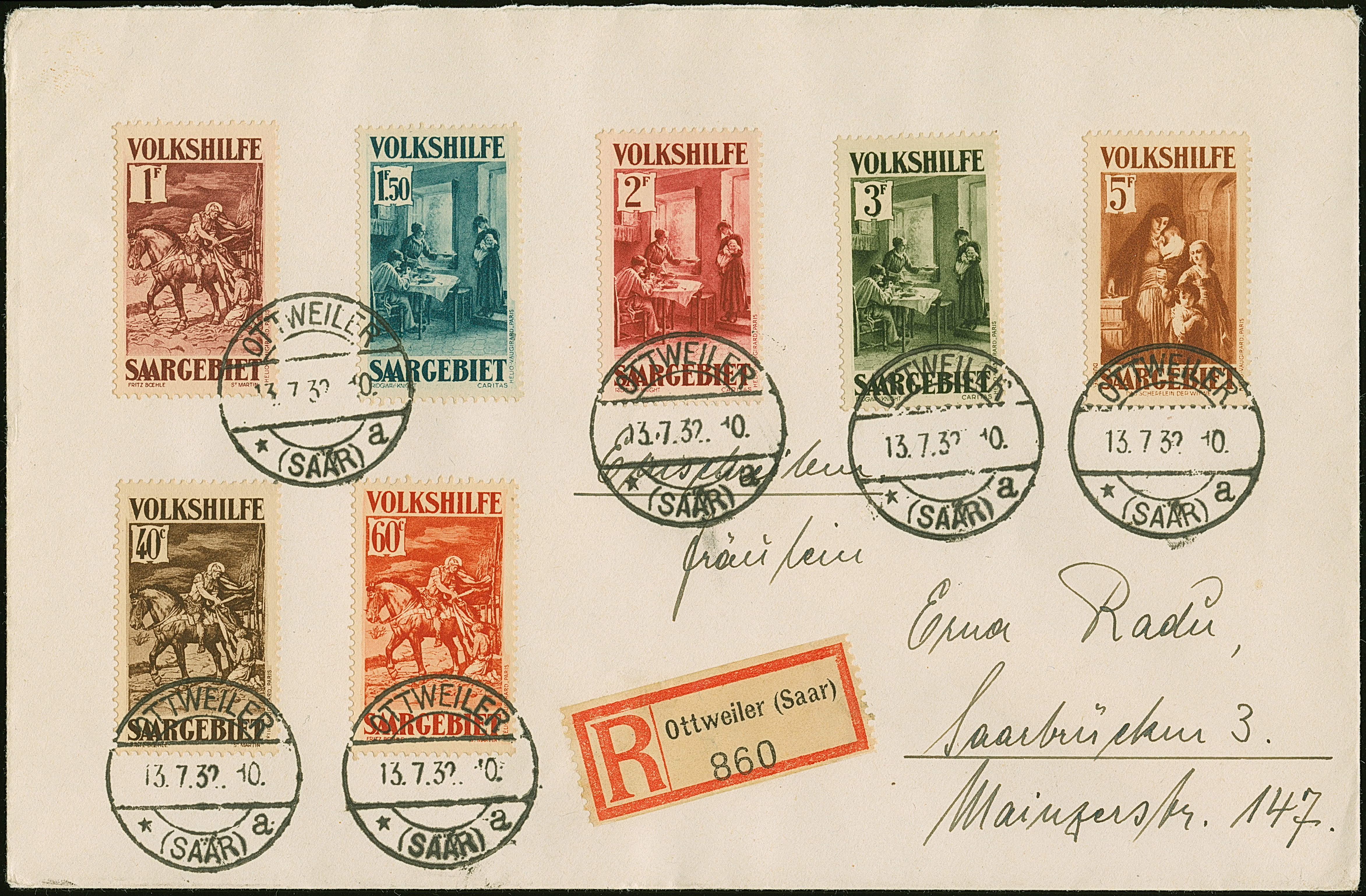 1932, Volkshilfe 40 C.-1 Fr., kpl. je sauber gestempelt “OTTWEILER 13.7.32”, auf R-Brief nach Saarbrücken mit Ankunftsstempel, einwandfrei, sign. Hoffmann BPP sowie Fotoattest Ney (2017)