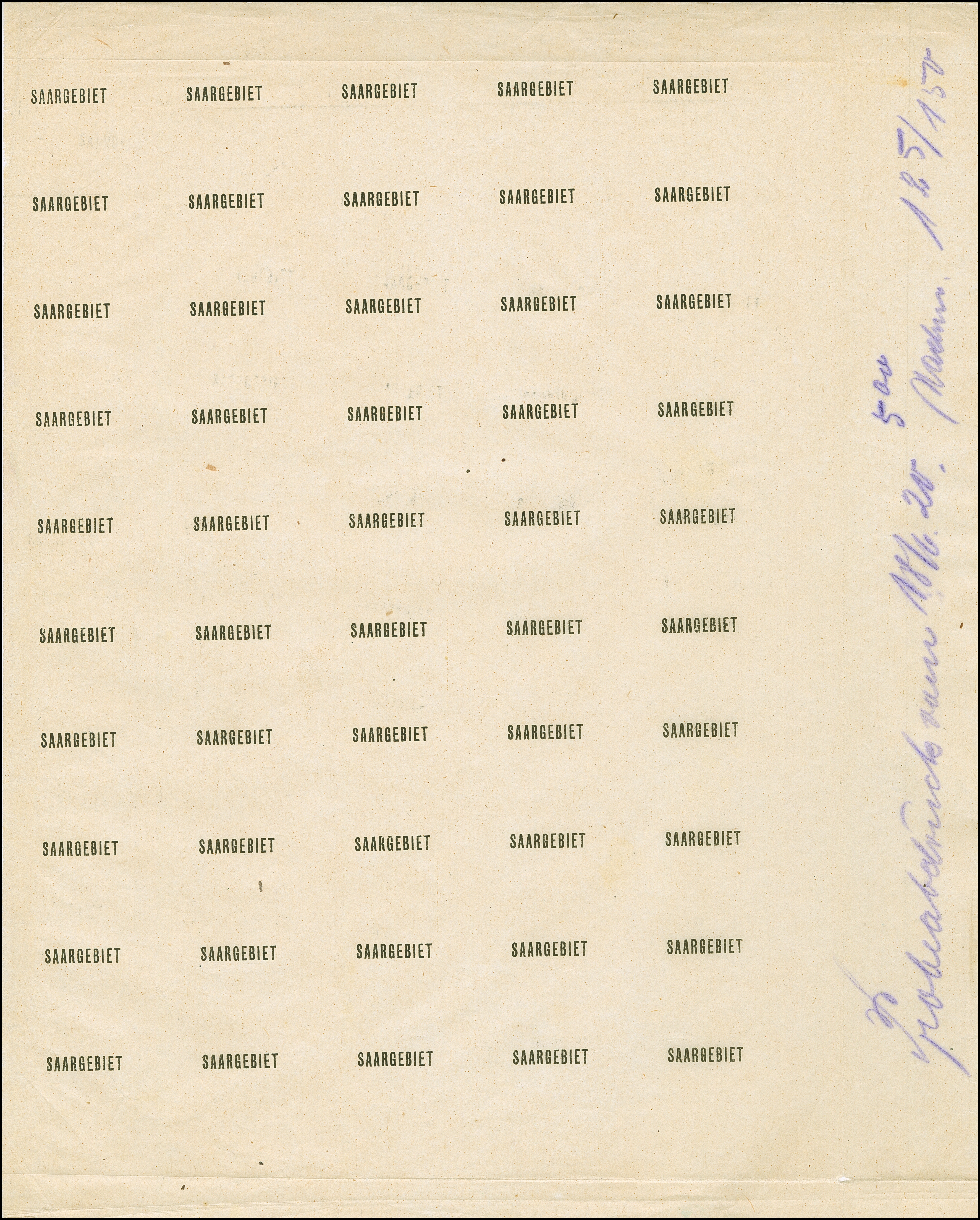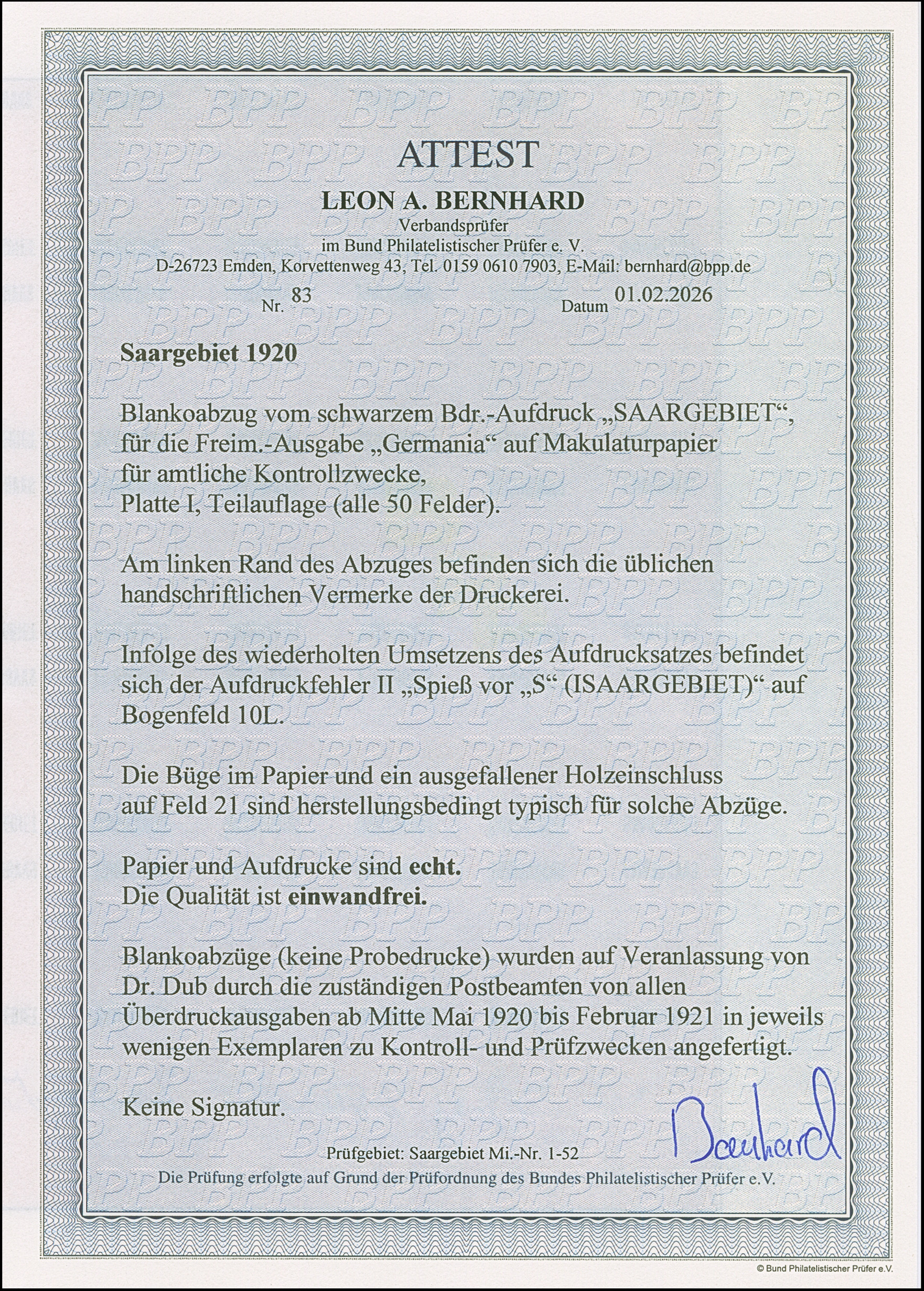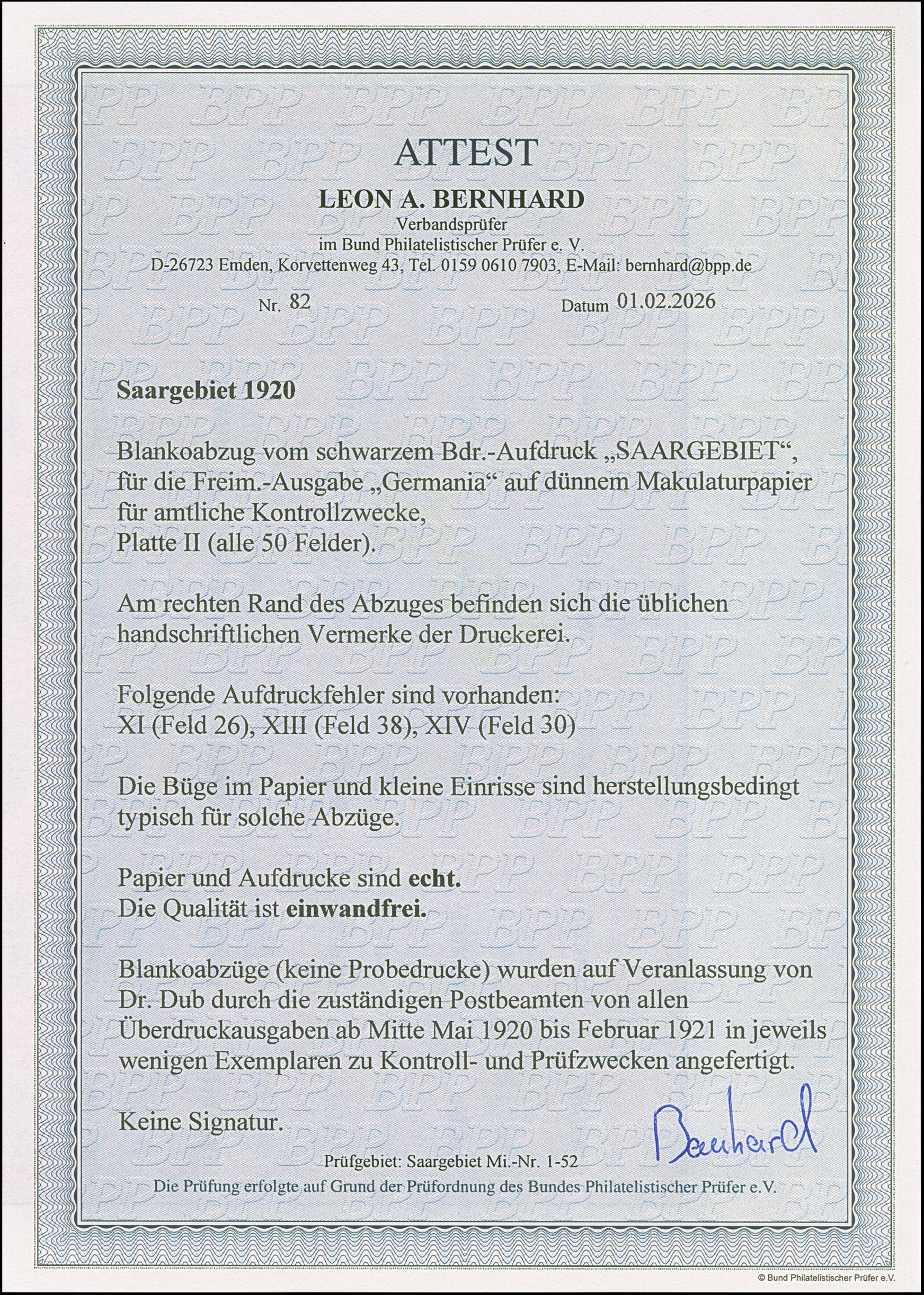 Kontrollabzug der Aufdruckplatte auf dünnem Maschinenpapier, im Bogenrand mit handschriftlicher Angabe “Probeabdruck vom 18/6.20 5 Uhr 125/150”, mit den Plattenfehlern XI-XIV, wie üblich leicht bügig und kleine Randrisschen, einwandfrei, Fotoattest Bernhard BPP (2026)