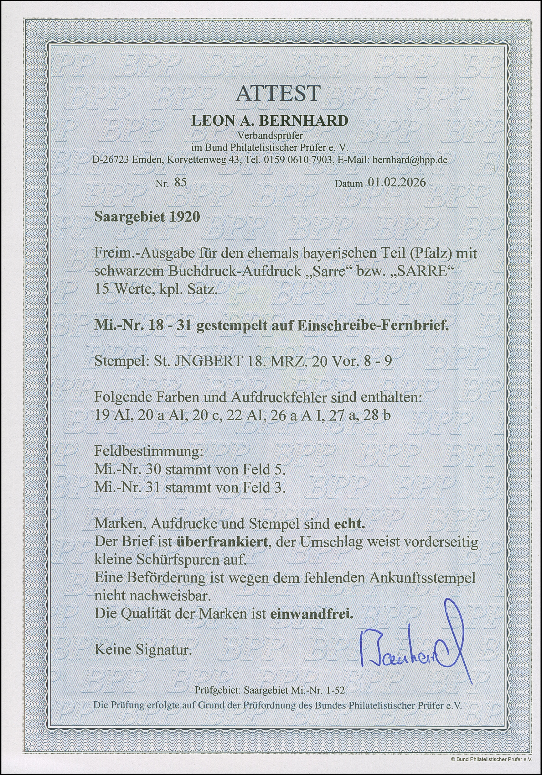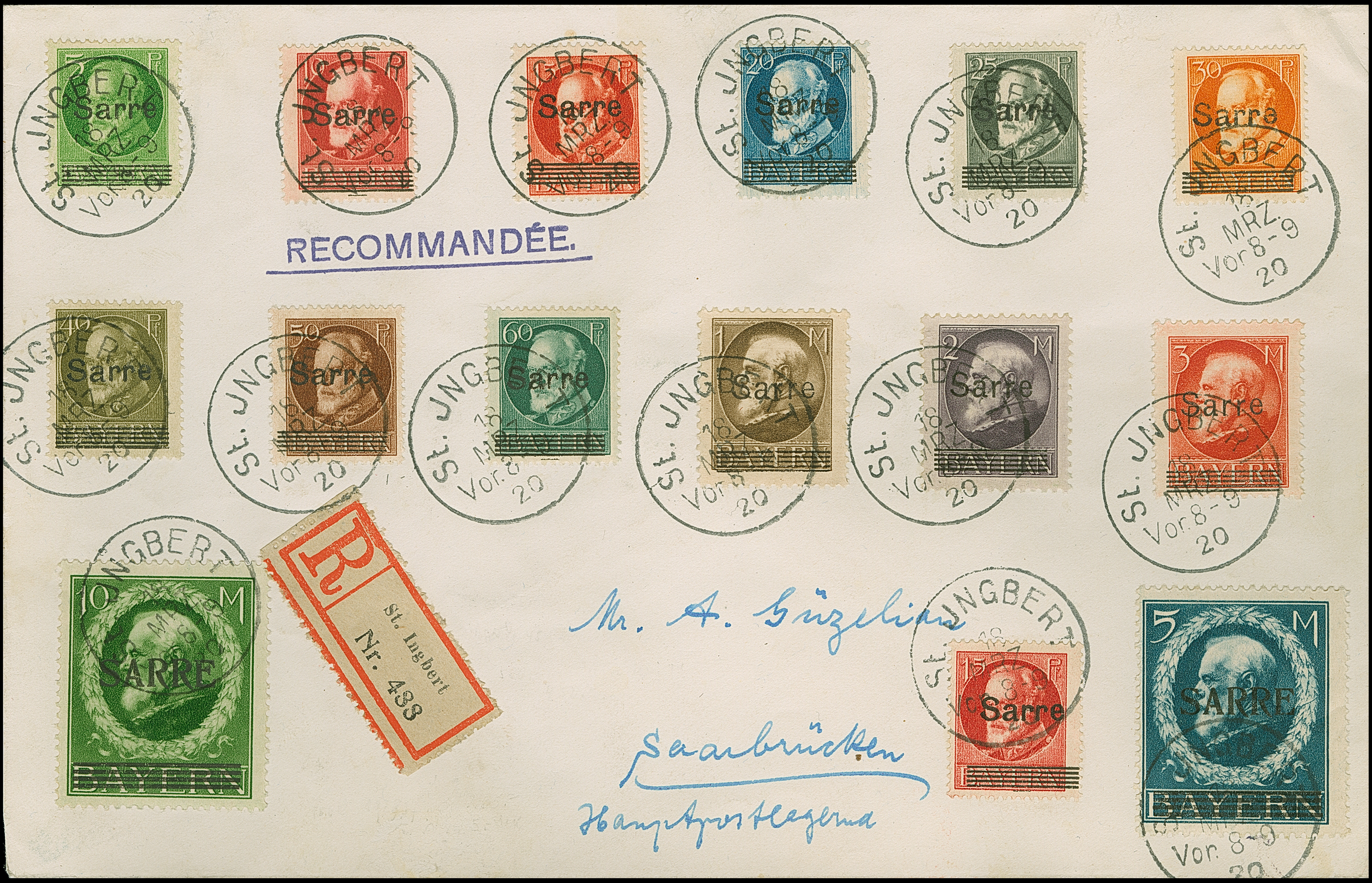 1920, Ludwig 5 Pfg.-5 M. kpl. mit Stempel "St. JNGBERT 18 MRZ 20" auf überfrankiertem Fernbrief nach Saarbrücken, Marken in tadelloser Erhaltung, Umschlag winzigst geschürft, Fotoattest Bernhard BPP (2026)