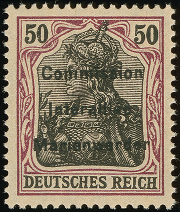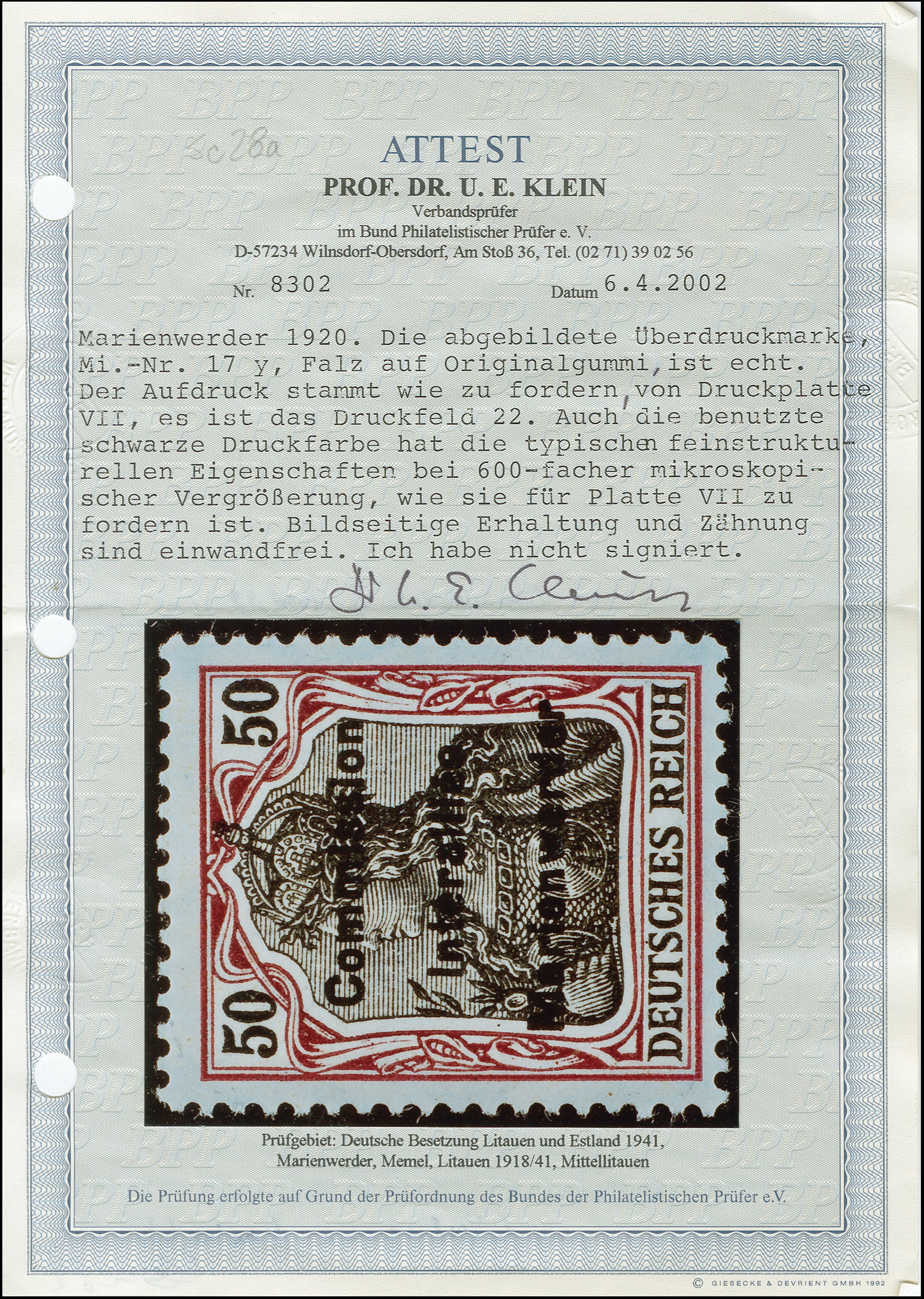 1920, Germania 50 Pfg. auf orangeweißem Papier, Aufdruckplatte VII, Feld 22, sauber ungebraucht, tadellos, eine seltene Marke, u.a. sign. Gallitsch sowie Fotoattest Prof. Klein BPP (2002)