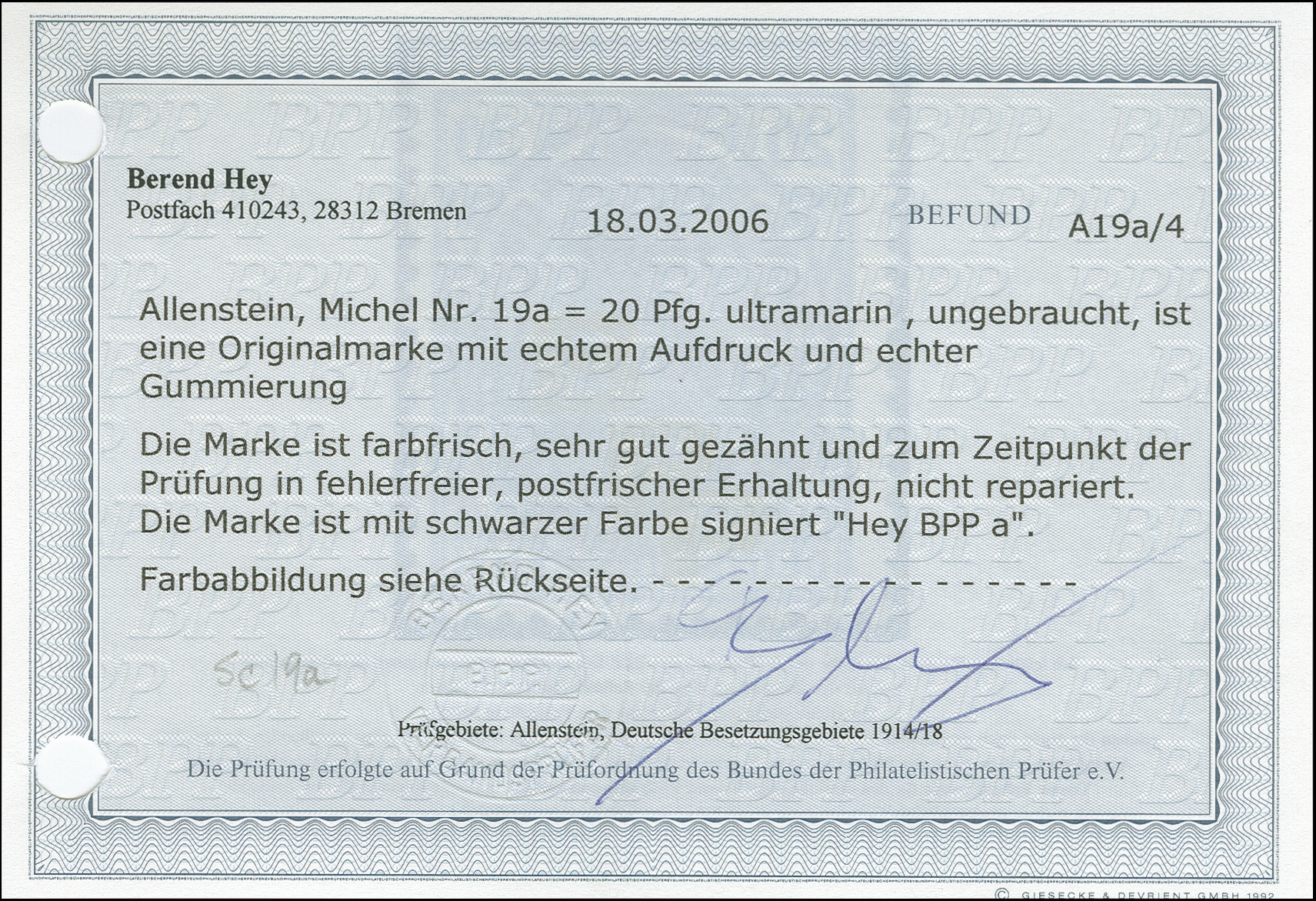 1920, Aufdruckausgabe Germania 15 Pfennig braunrot, aus der rechten unteren Bogenecke mit komplettem, gezähnten Leerfeld in Markengröße, im Unterrand noch Teile des Reihenzählers sichtbar, sauber mit Stempel “ALLENSTEIN 28 5 20” auf Briefstück, tadellos, selten, sign. Hey BPP