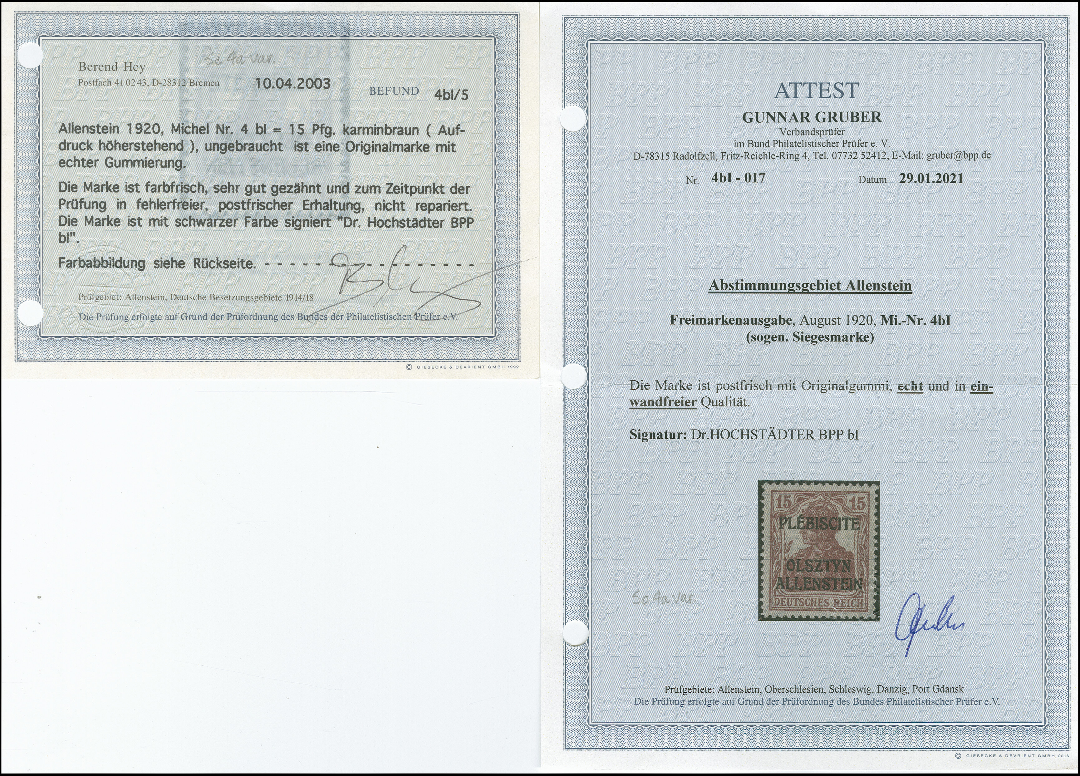 1920, Aufdruckausgabe 15 Pfennig braunrot, sogen. “Siegesmarke”, mit Zufrankatur mit Stempel “ALLENSTEIN 17.8.20” auf gering überfrankiertem Wertbrief nach Berlin-Steglitz, die Siegel entfernt, sonst tadellos, selten, Fotoatteste Althen BPP (1991) sowie Gruber BPP (2020)