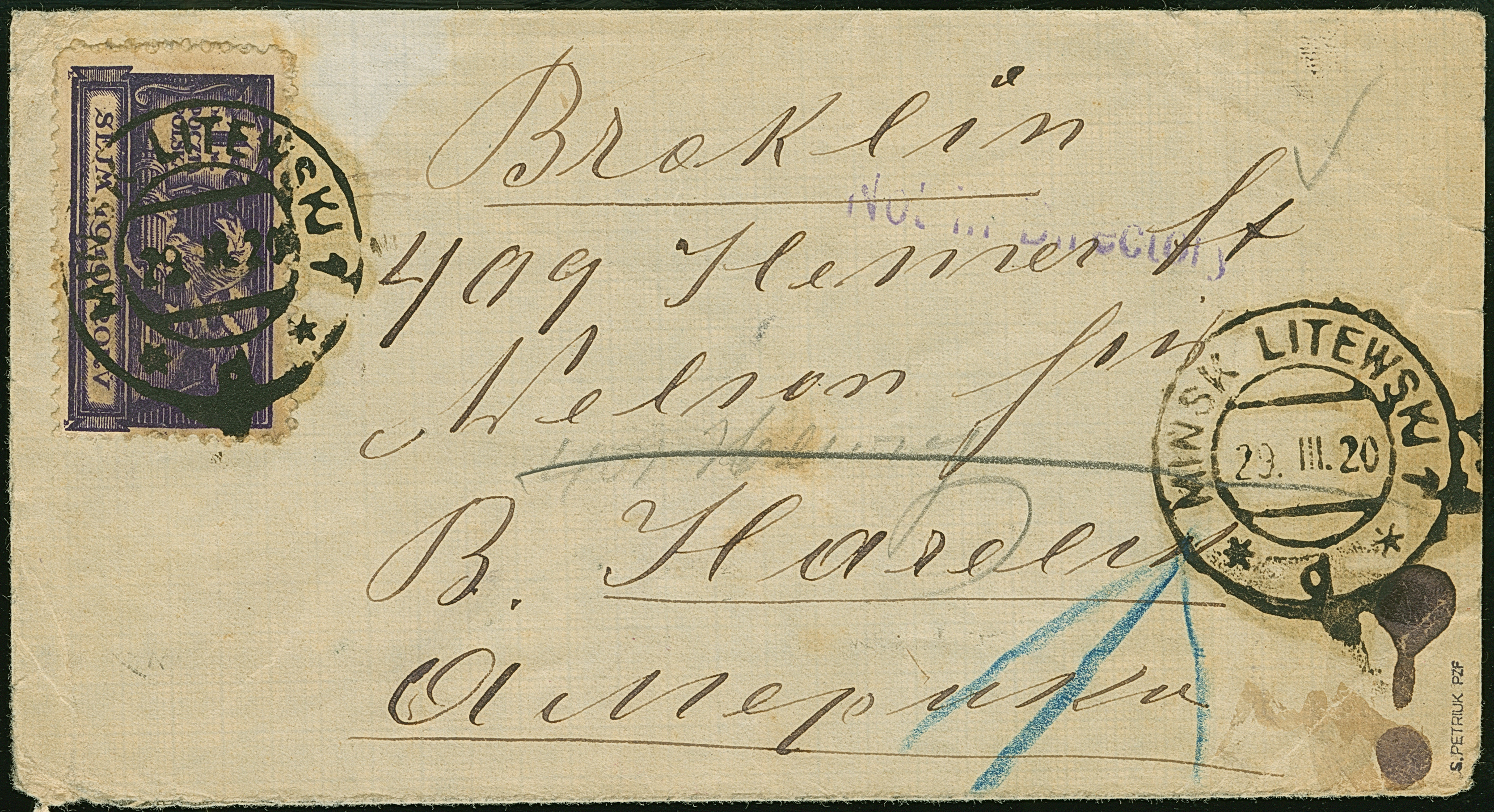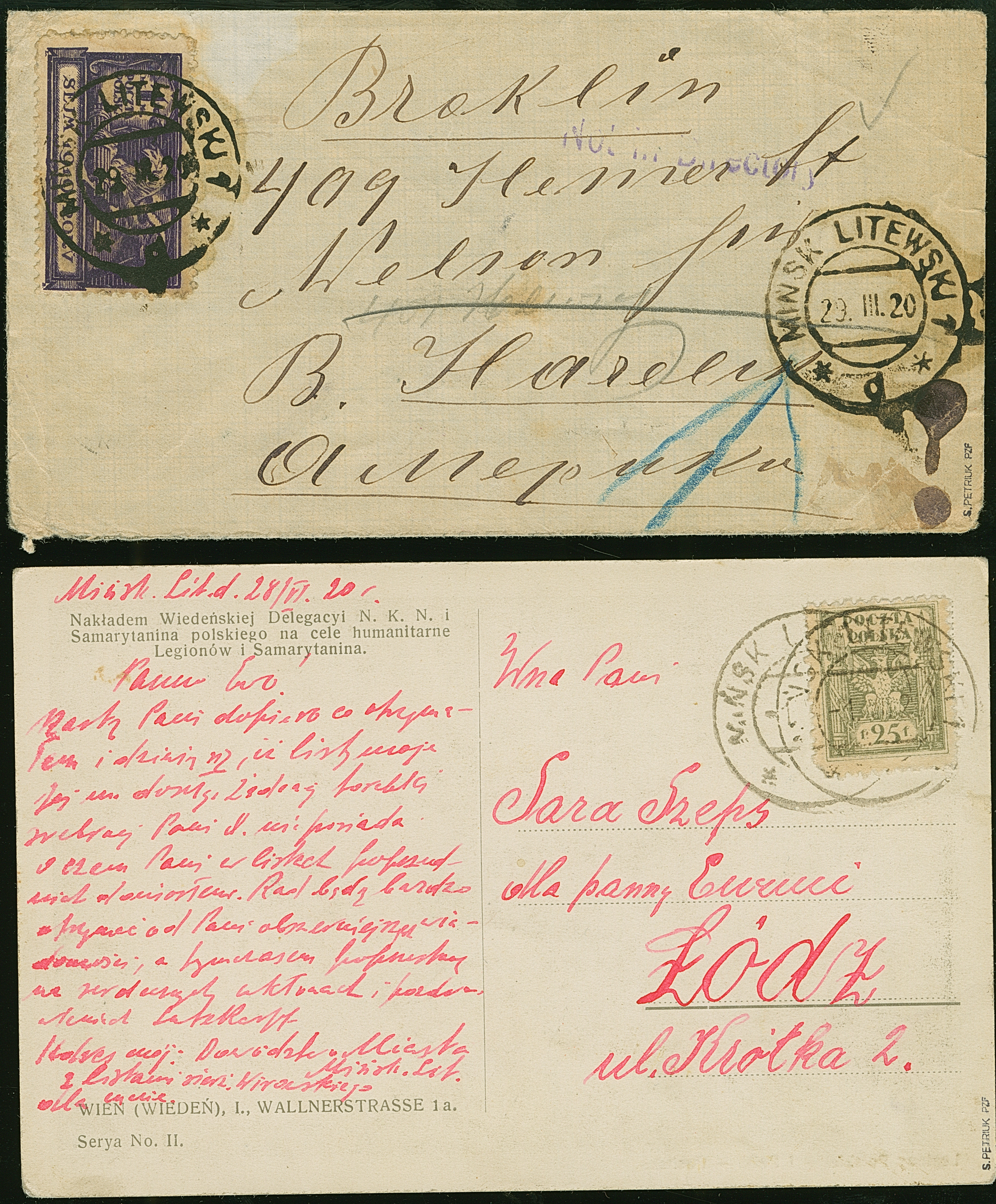 Polish-Soviet War: Sejm 1m. and Coat of arms 25f., tied by cds. “MINSK LITEWSKI” to cover resp. card, addressed to Brooklyn, USA and Lodz, minor transportation wear, otherwise fine. Scarce mail from the brief occupation of MINSK LITEWSKI by Polish troops, signed Petriuk