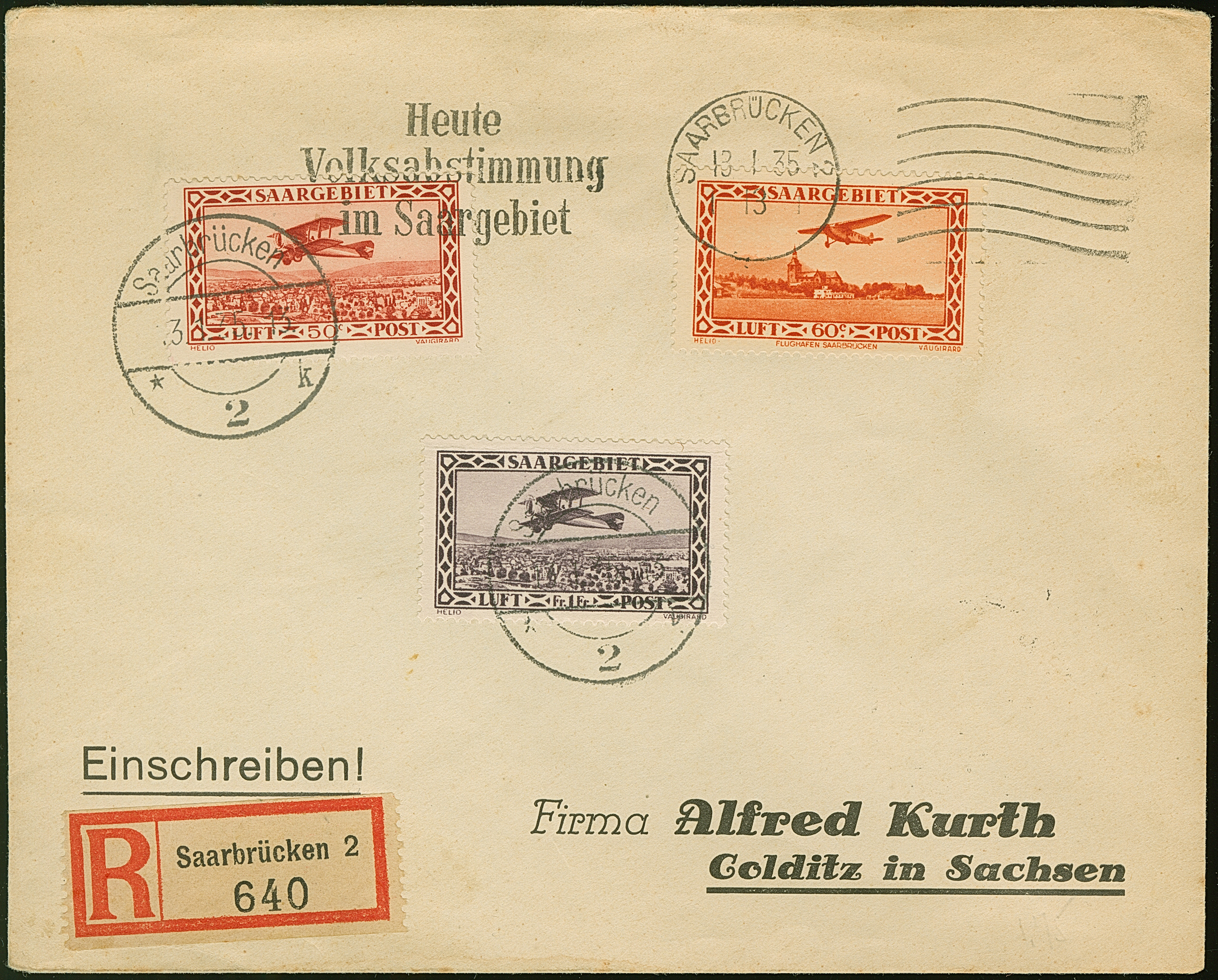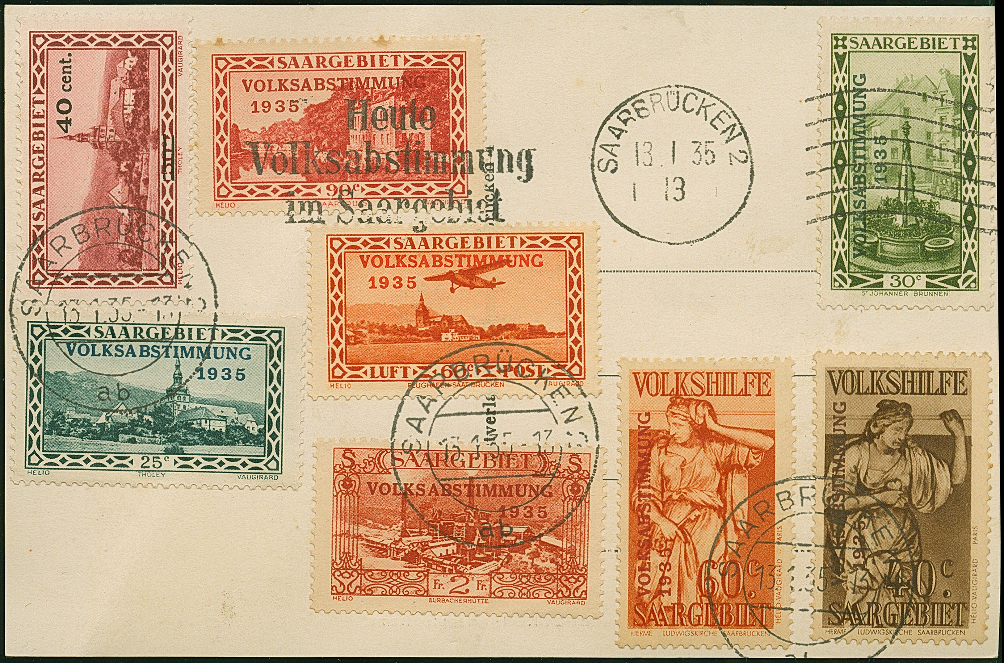 1935, Karte mit Buntfrankatur Volkshilfe und Landschaftsbilder, sauber mit Stempel “SAARBRÜCKEN 2 13.1.35”, mit dazugehörigem Schreiben als Antwort auf Beglückwünschung zur Volksabstimmung des Postamts Klagenfurt, Österreich, an das PA Saarbrücken 2. Sowie der dazugehörigen Postsache. Karte und zwei Marken mit diagonalem Bug, Umschlag mit Fehlern, sonst gute Erhaltung. In der Vollständigkeit sehr interessant.