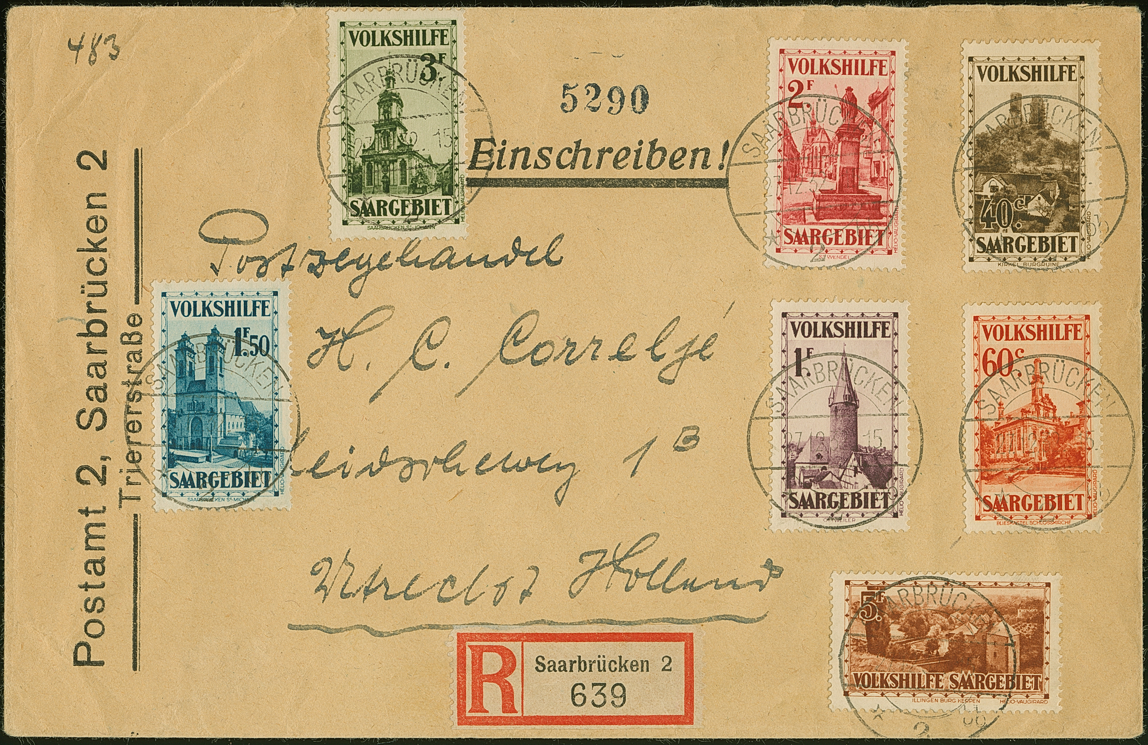 1932, Volkshilfe 40 C.-5 Fr., kpl. je sauber gestempelt “SAARBRÜCKEN 2 27.12.32” auf R-Brief in die Niederlande, 40 C. oben zwei getönte Zahnspitzen, die übrigen einwandfrei, der Umschlag mit Beförderungsspuren, Fotoattest Ney (2017)