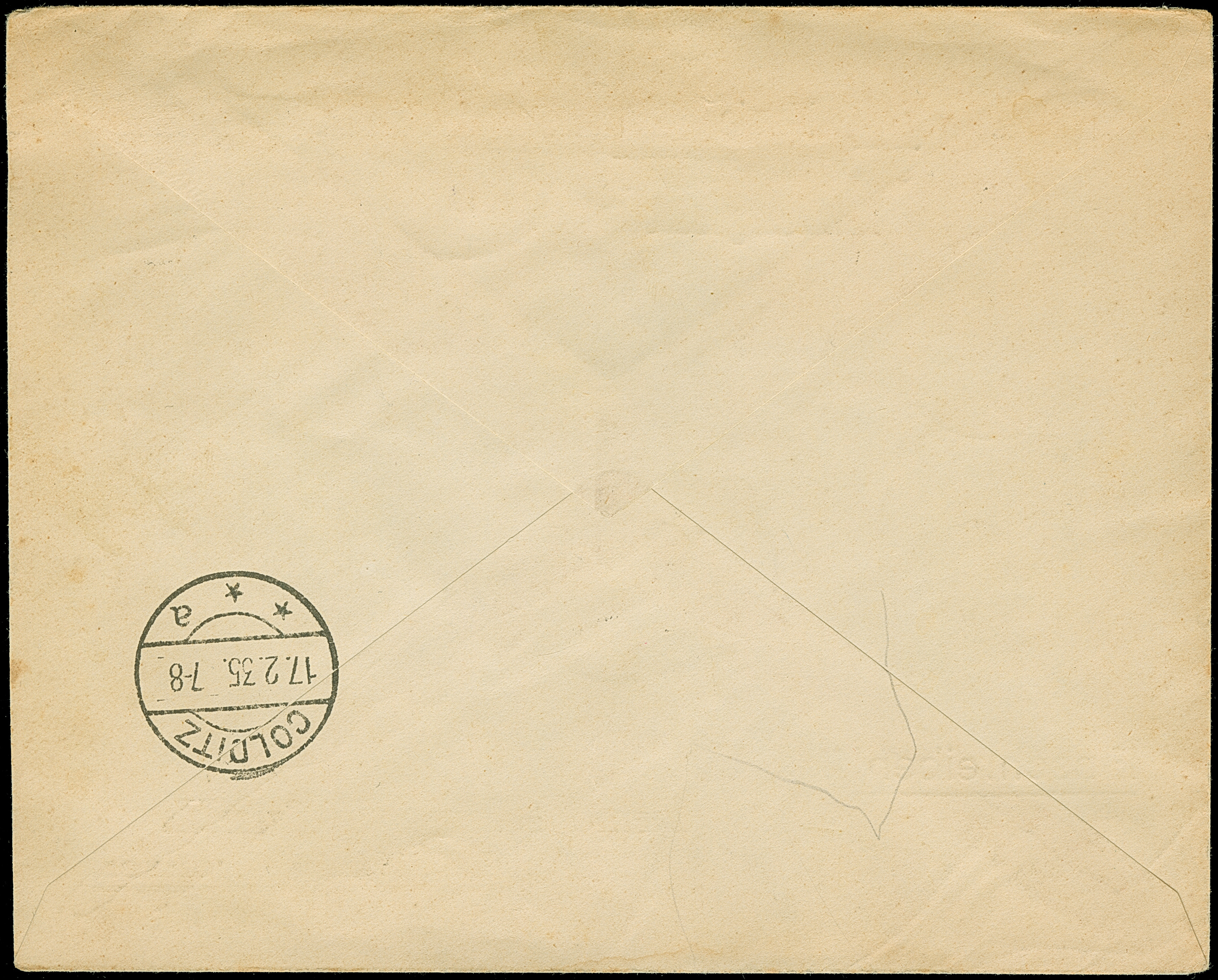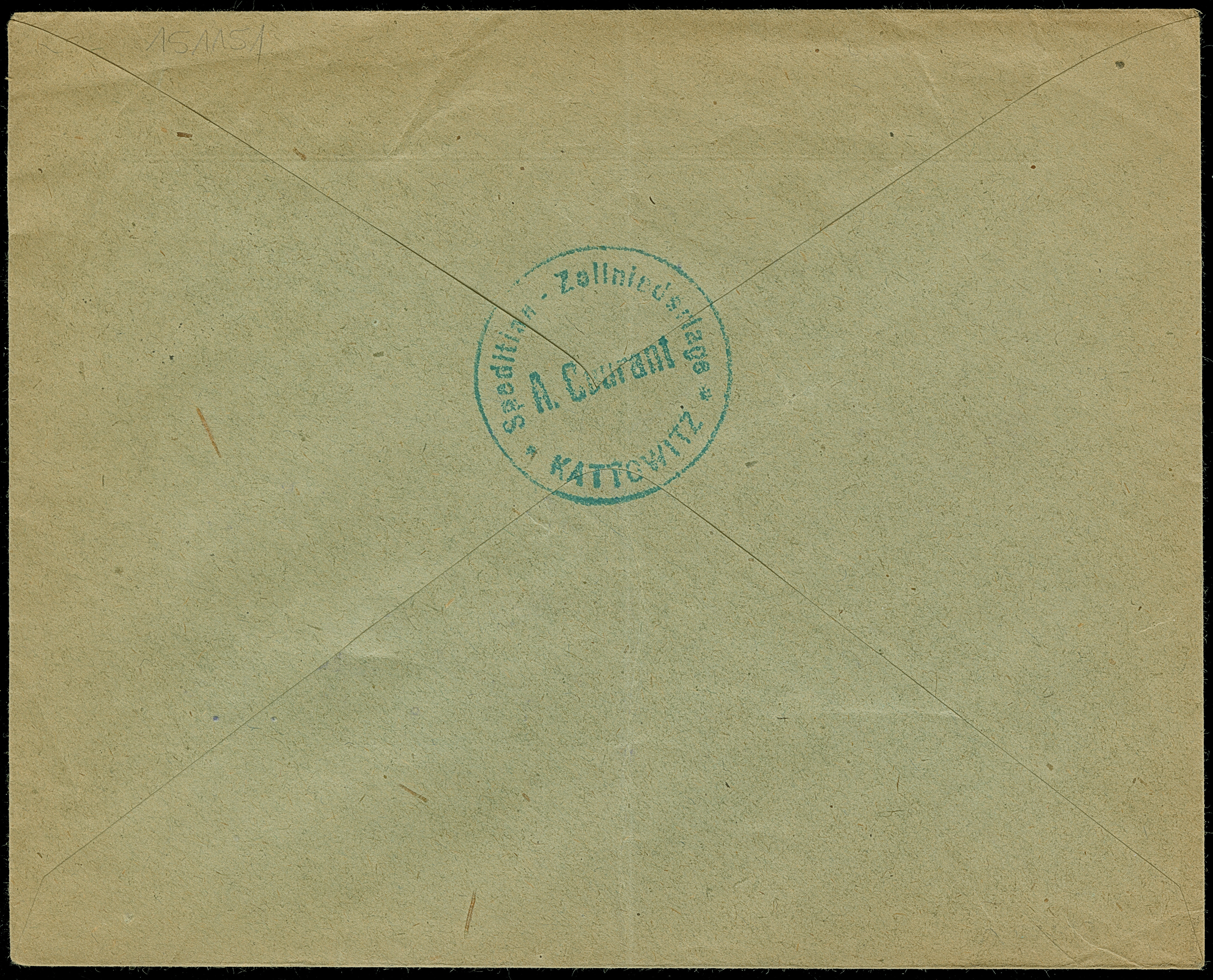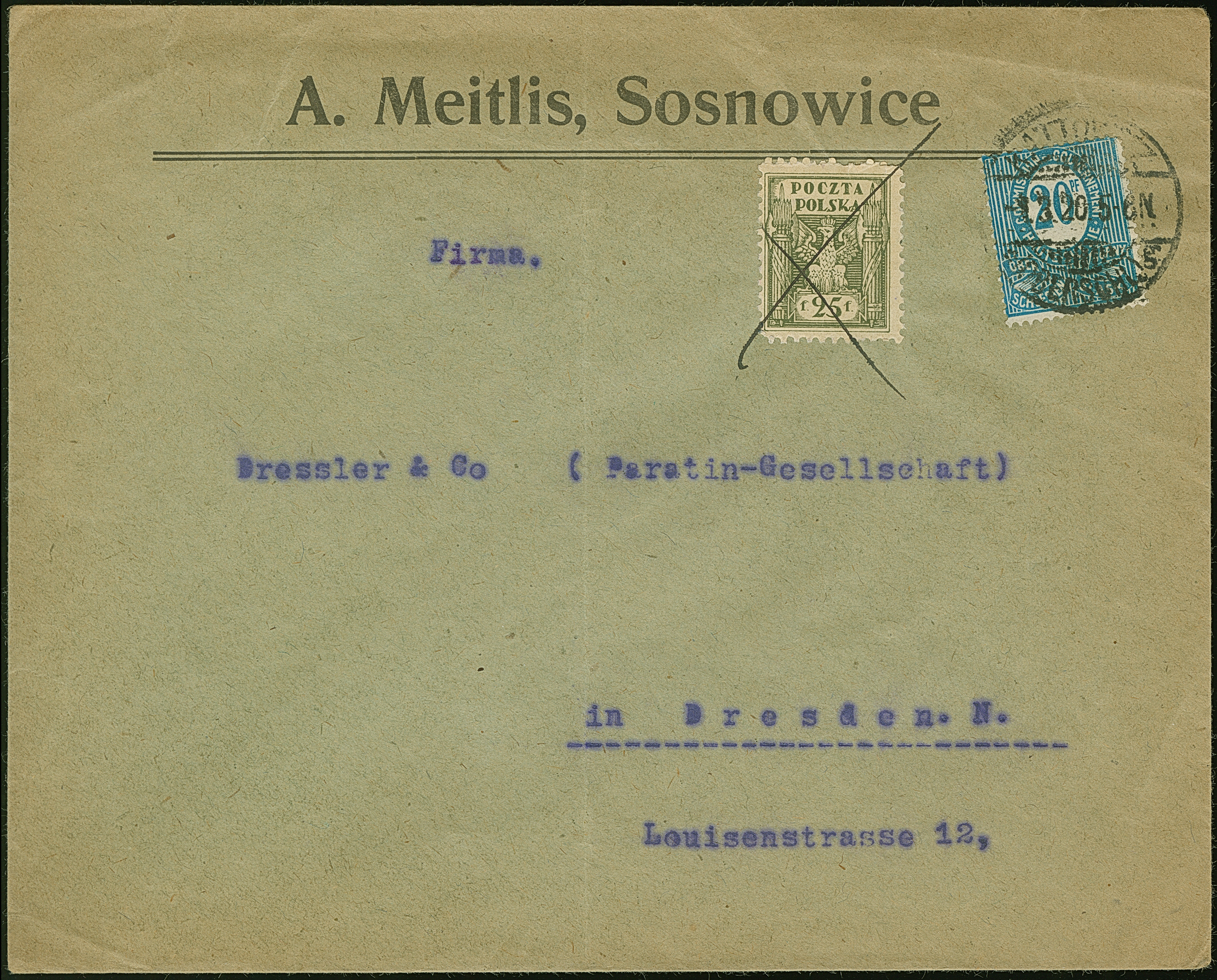 1920, Ziffern 20 Pfg. blau mit Stempel “KATTOWITZ 2.3.20” auf Firmenbrief aus Sosnowice nach Dresden, offen aufgeliefert, polnische Frankatur 25 Fen mit Tintenentwertung, mit privater Speditions-Post nach Kattowitz befördert, rückseitig Siegelstempel der “Spedition A. Courant” in Kattowitz, einziger Weg einer Postbeförderung von Sosnowice nach Dresden, selten, nur wenige Briefe bekannt, einmal senkrecht gefaltet, sonst in guter Erhaltung