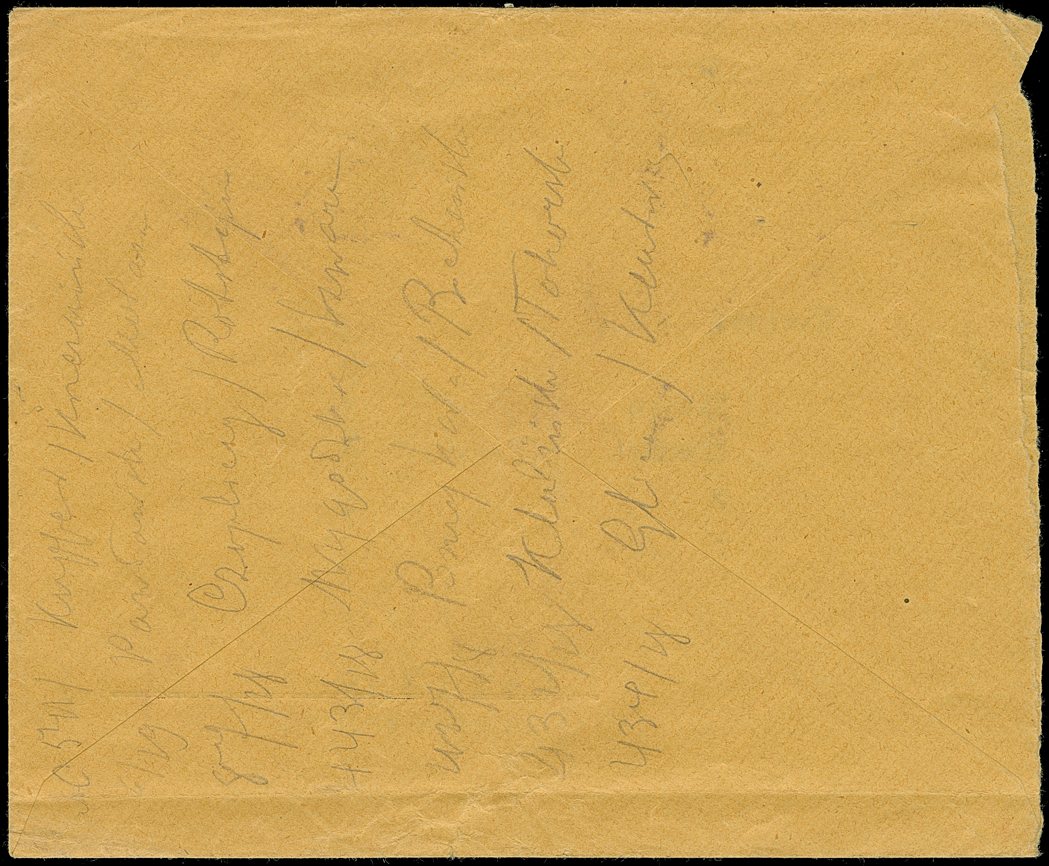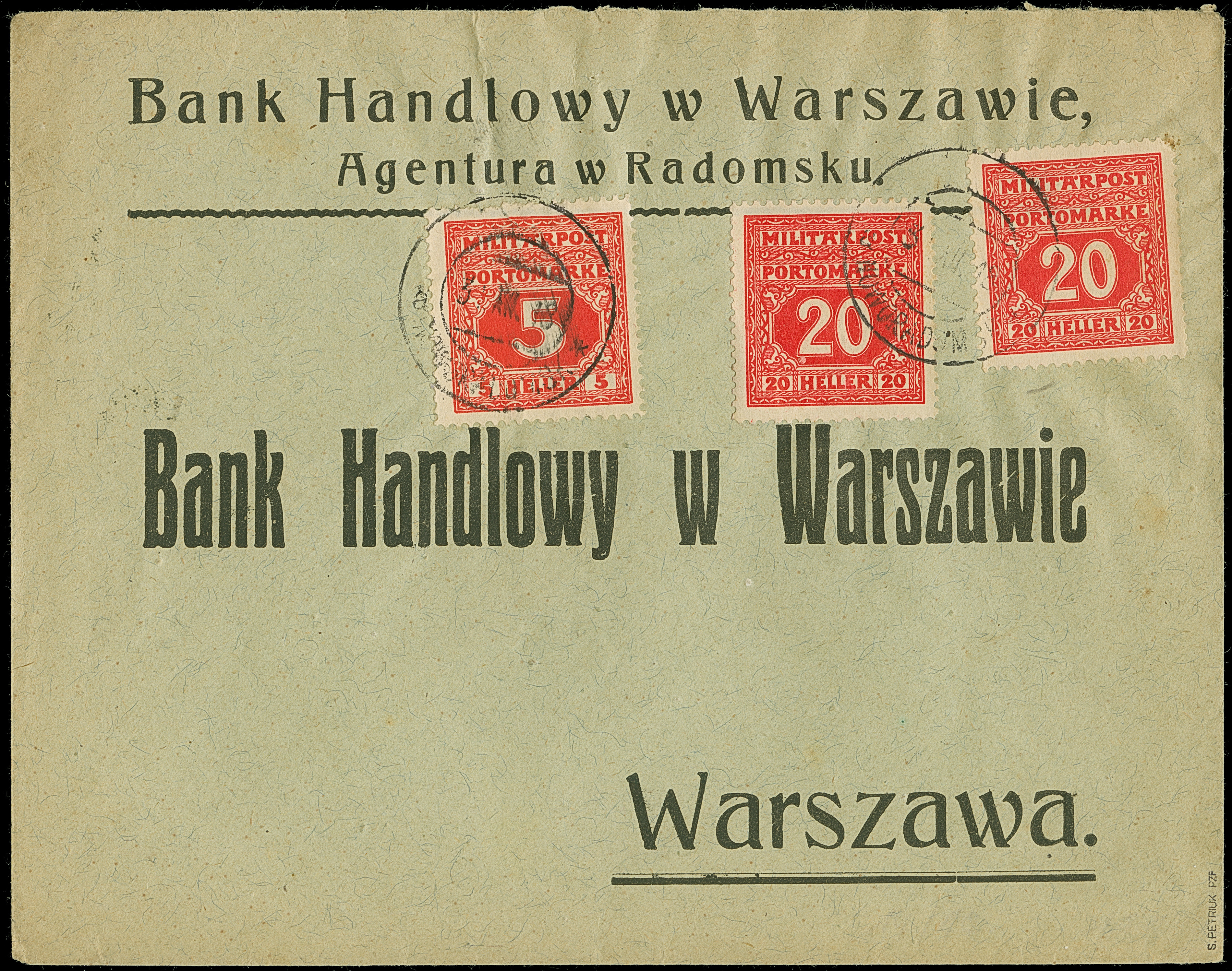 1918, Austrian Military Postage due stamps 5h. and two 20h., tied by cds. “NOWORADOMSK 31.12.18” to cover to Warsaw with arrival mark “WARSCHAU 1-1-.19", fine. For the Lublin region (southern Poland), which also included Noworadomsk, a temporary increase in postage rates to 45 H was in effect for a short period from December 16, 1918, to January 7/8, 1919. There are few examples of postage stamps with Austrian stamps reused in Poland, signed Franz and Petriuk