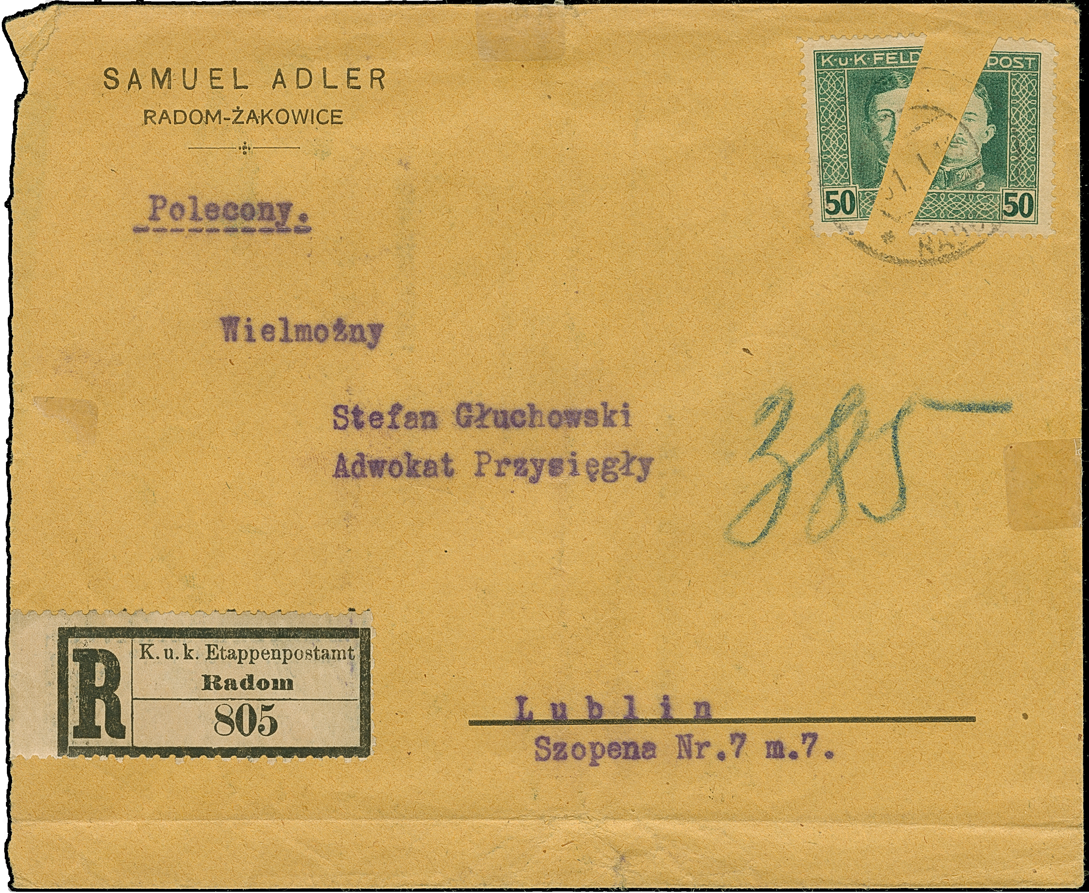 1919, Austrian field post Karl I. 50 h., two bisected stamps, tied by cds. “RADOM 31.1.19” to registered cover to Lublin, some transportation wear, otherwise fine