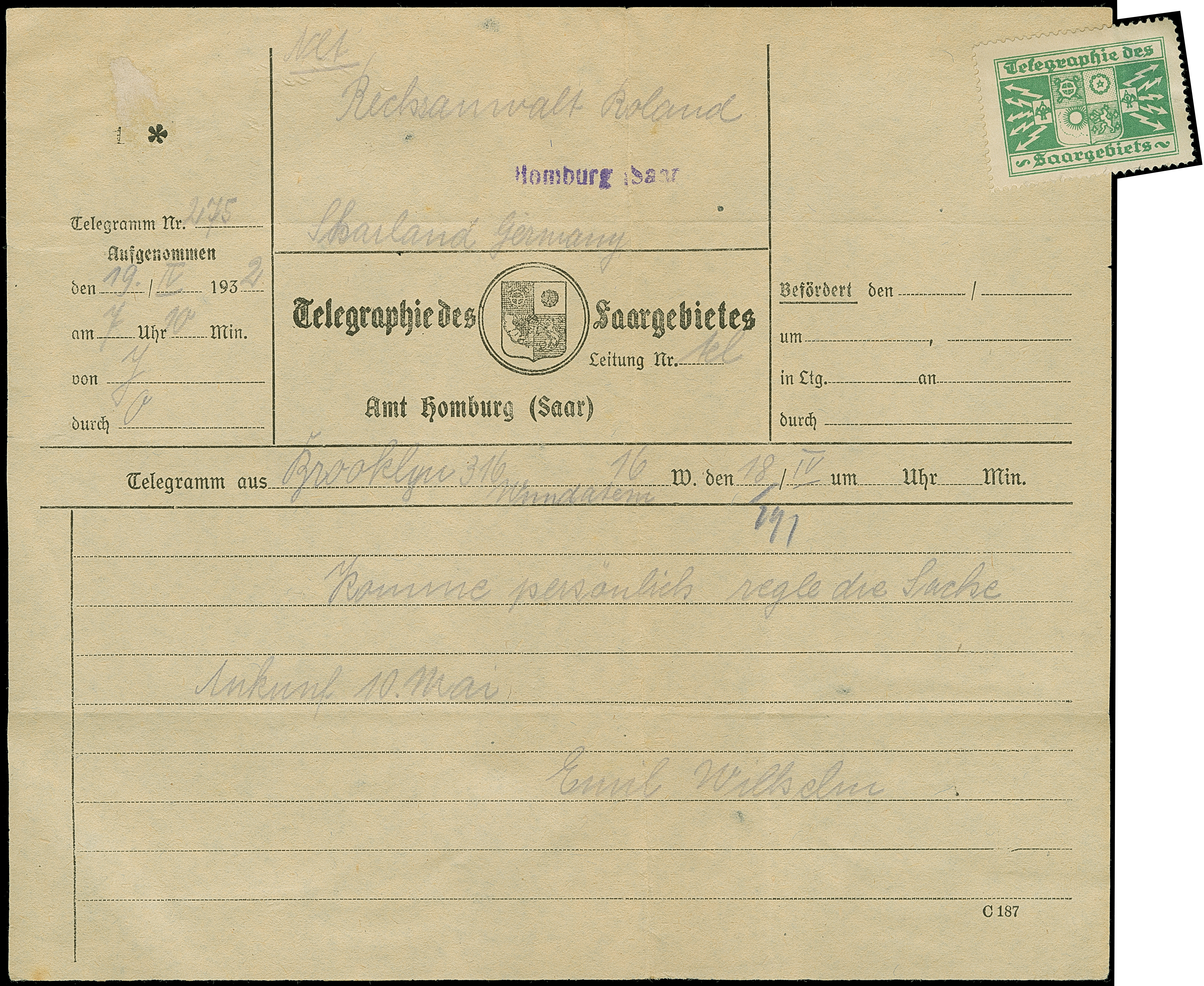 Besonderheiten: 1932, Vordruck "Telegraphie Saargebiet Am Homburg (Saar) für ein Telegramm aus Brooklyn mit kompletter grüner Verschluss-Marke, übliche Faltspuren