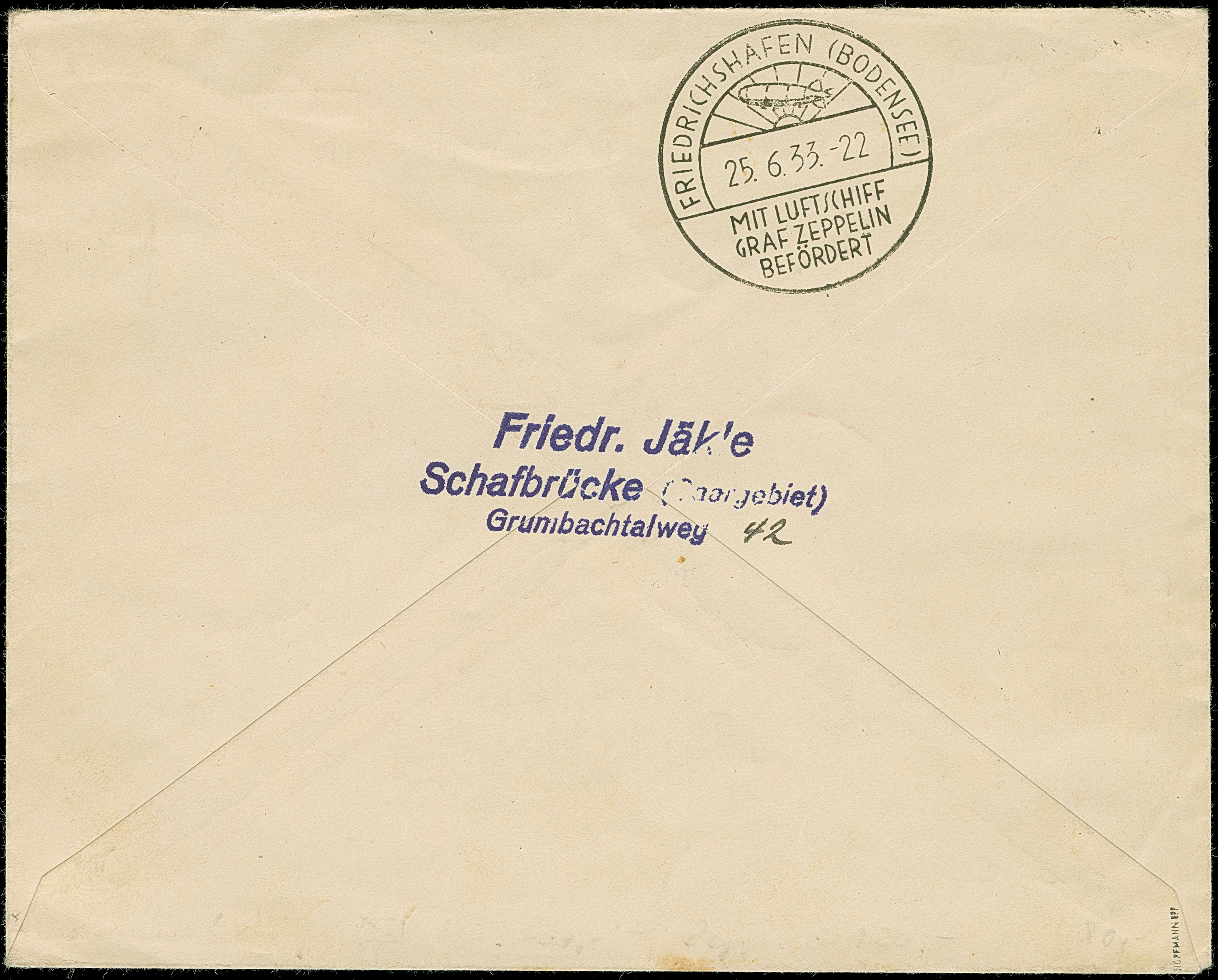 1933, Explosionsunglück Neunkirchen 60 C. – 5 Fr. kpl. mit Zufrankatur auf Zeppelinbrief zur Saargebietsfahrt (Sieger 218 C) von „SAARBRÜCKEN 2 25.6.33“ mit beiden Bestätigungsstempeln via Friedrichshafen nach Basel, einwandfrei, sign. Hoffmann BPP sowie Fotoattest Geigle BPP (2011)