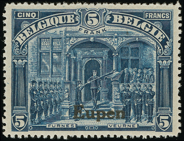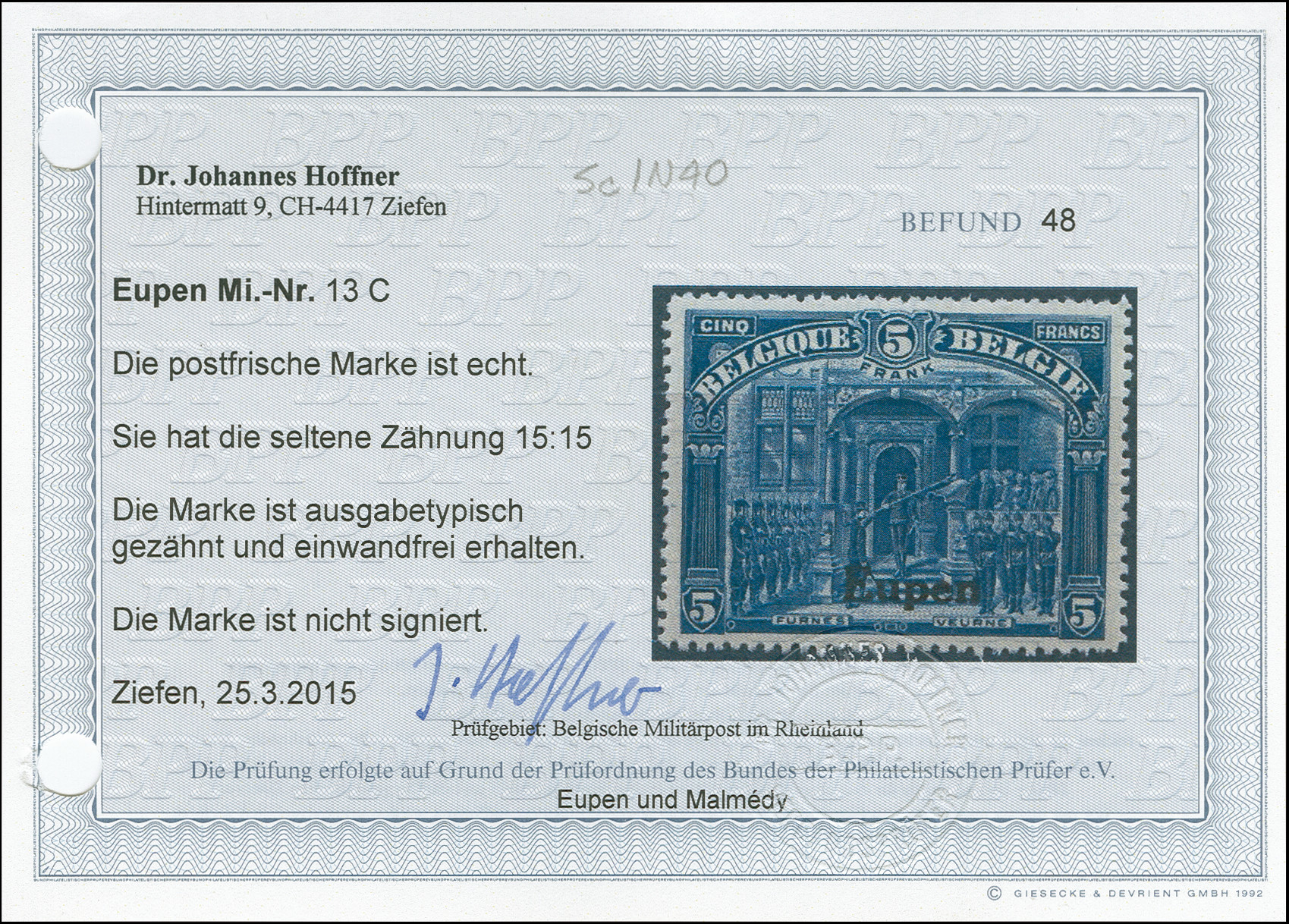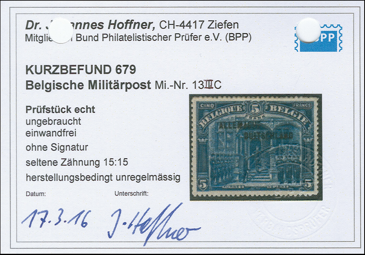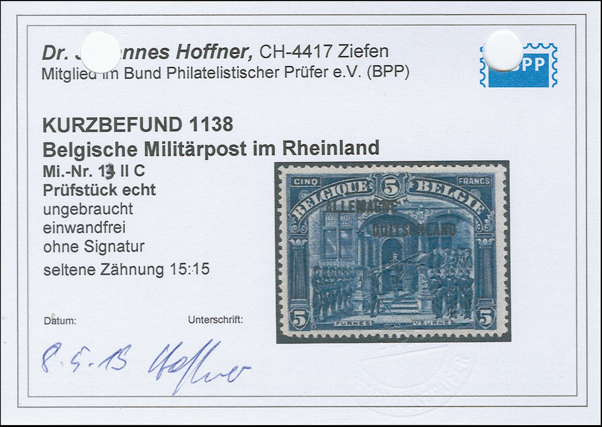 1920, 5 Franc blau, Aufdrucktype III, gezähnt 14 ¾:15, sauber ungebraucht, tadellos in ausgabetypischer Zähnung, Kurzbefund Hoffner BPP (2016)