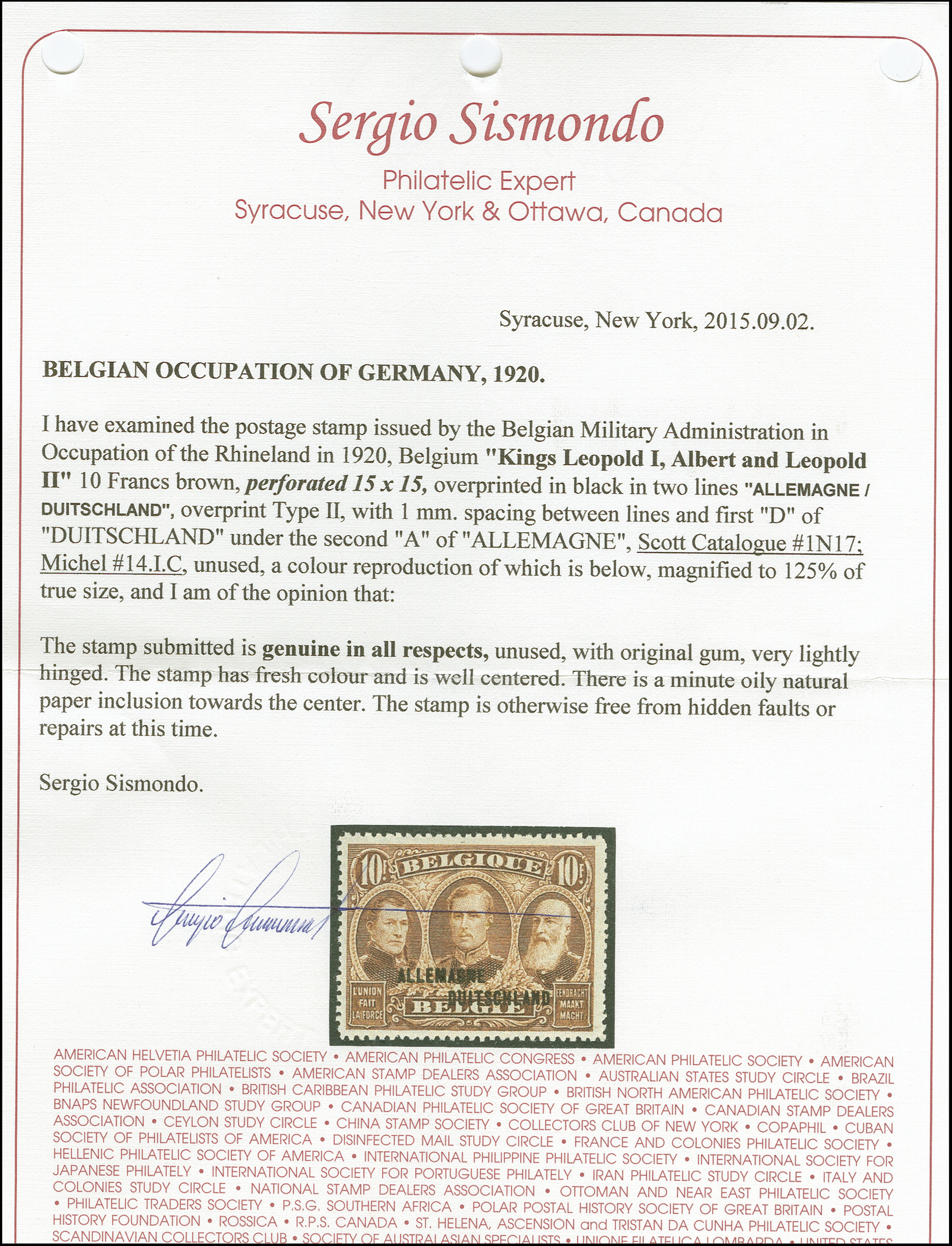 1920, 10 Franc braun, Aufdrucktype III, gezähnt 14 ¾:15, sauber ungebraucht, tadellos, Fotoattest Sismondo (2015)