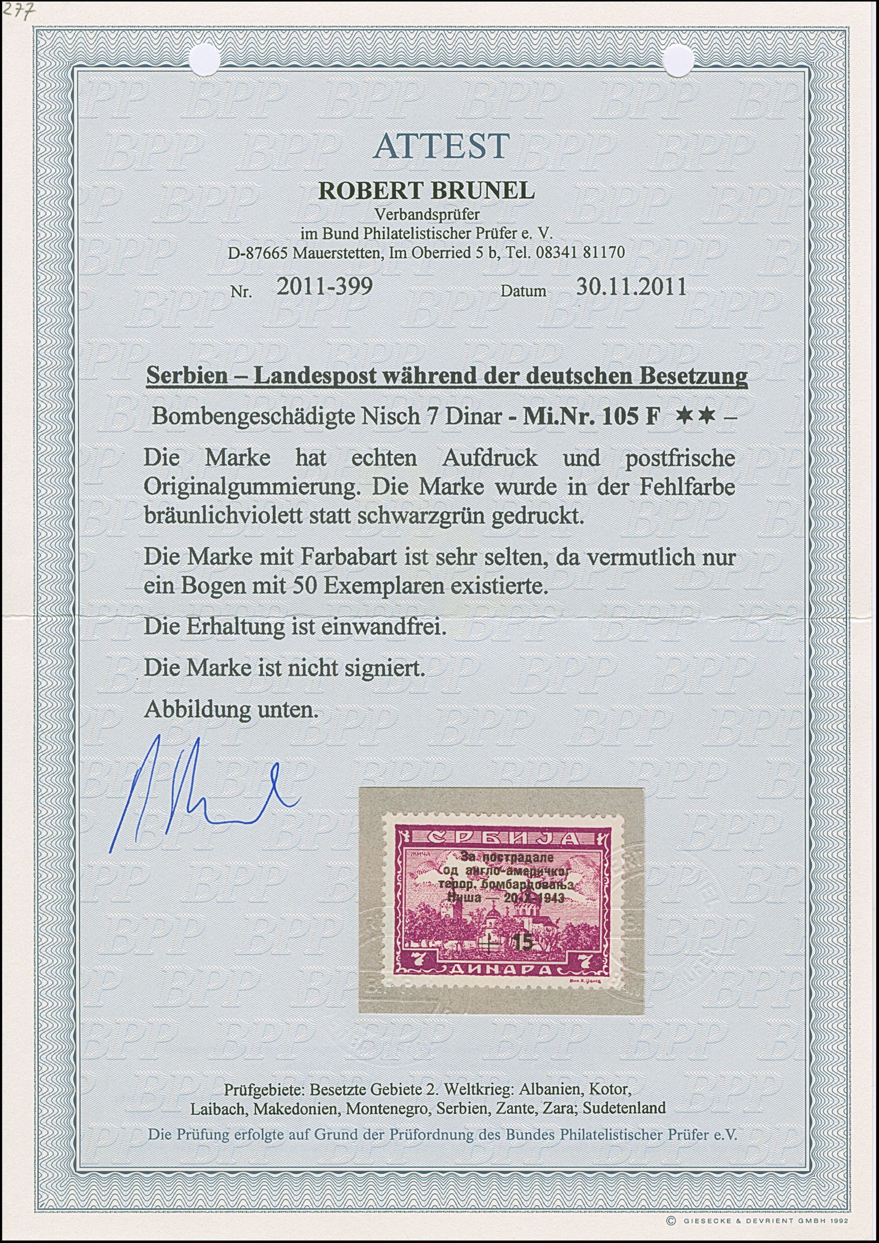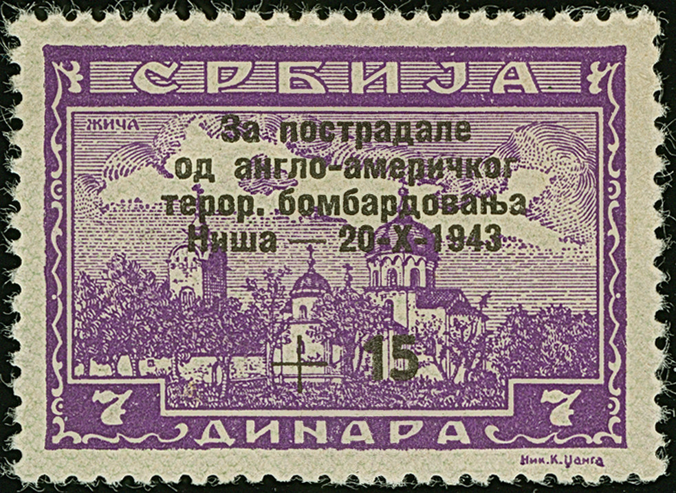 1943, Bombengeschädigte in Nis  7+15 Dinar, Fehlfarbe dunkelpurpurviolett, postfrisch, gering geknittert, sonst tadellos, eine seltene Marke mit einer Auflage von nur 50 Stück, Fotoattest Brunel BPP (2011)
