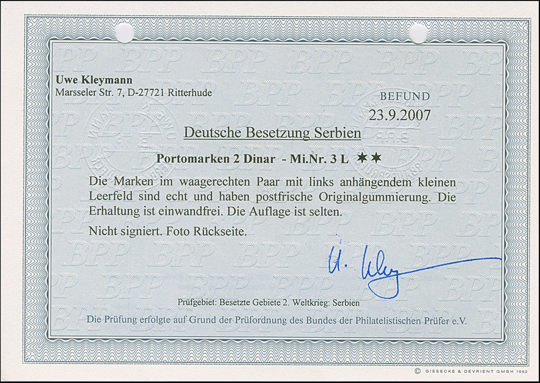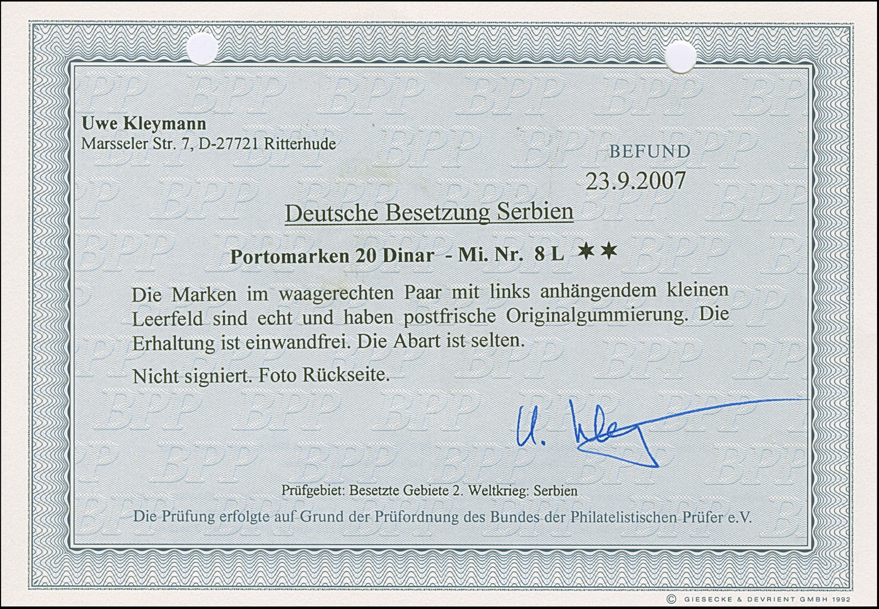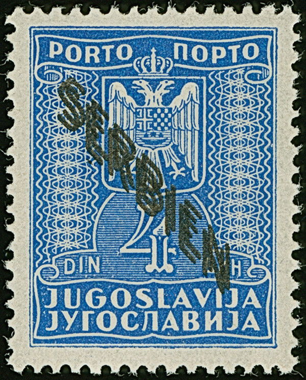 1942, Serbischer Doppeladler 5 Dinar schwarzgelblichgrün, aus der linken unteren Bogenecke mit vollständig gezähnten Leerfeld in Markengröße, postfrisch, tadellos, sehr selten, Auflage nur 10 Stück, unsigniert mit Fotoattest Krischke (2003)