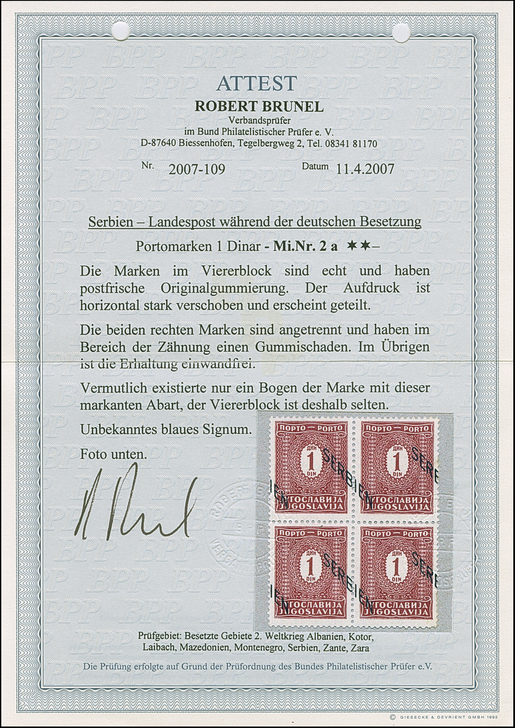 1941, 4 Dinar dunkelgrauultramarin, mit doppeltem Aufdruck, postfrisch, tadellos. Eine seltene Abart mit einer Auflage von nur 100 Stück, unsigniert mit Fotoattest Dr. Zydek BPP (1989)
