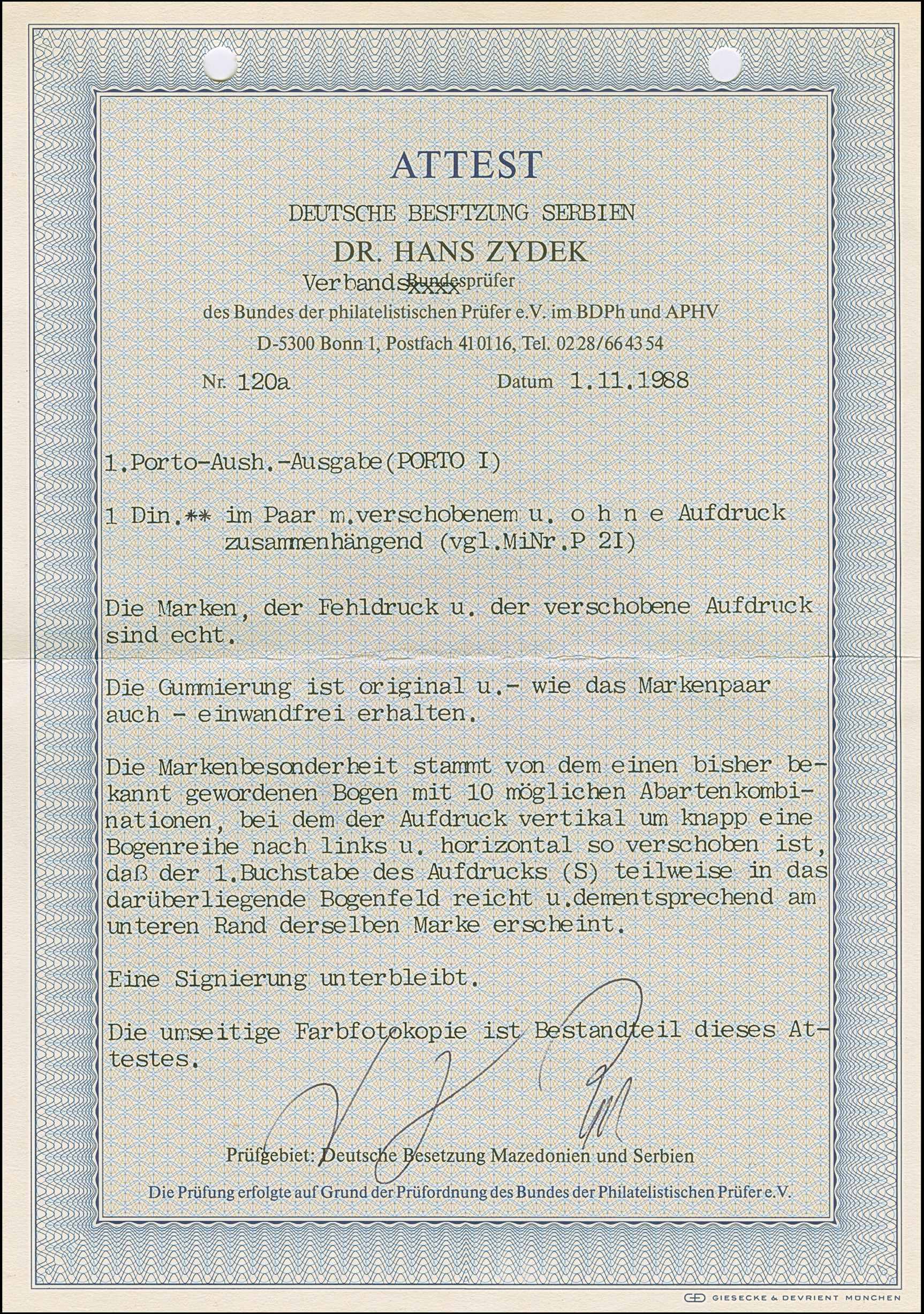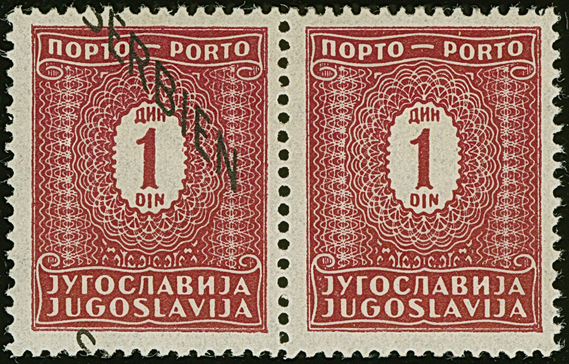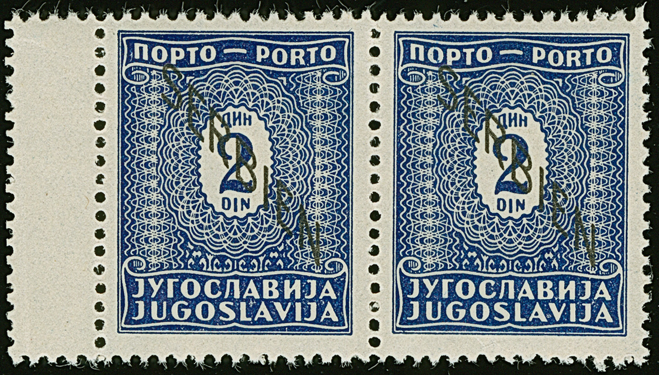 1941, 1 Dinar schwärzlichrötlichkarmin, waagerechtes Paar mit mit stark verschobenem Aufdruck, dadurch die rechte Marke ohne Aufdruck, postfrisch, tadellos. Eine sehr seltene Abart, Auflage lediglich 10 Stück, sign. sowie Fotoattest Dr. Zydek BPP (1988)