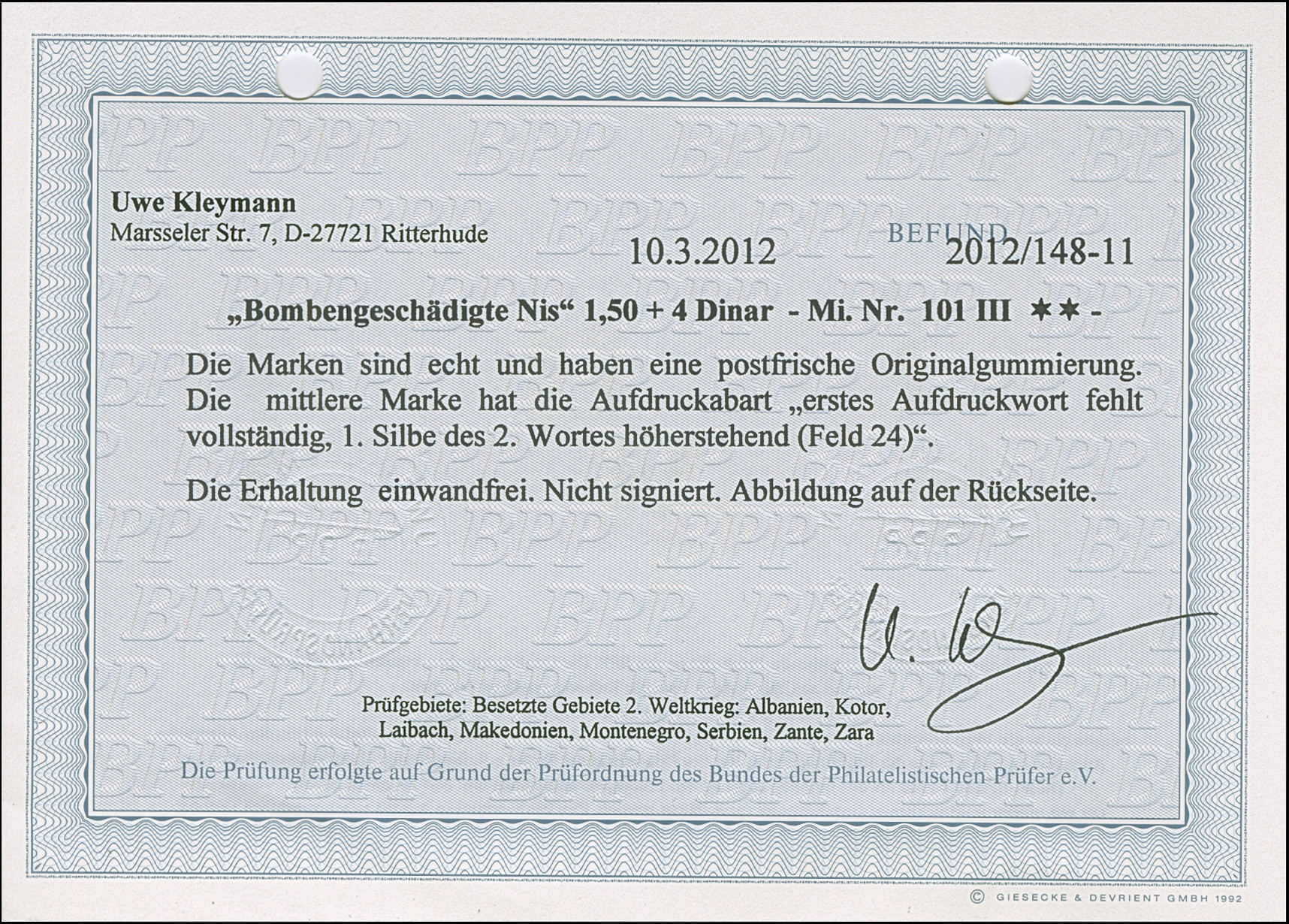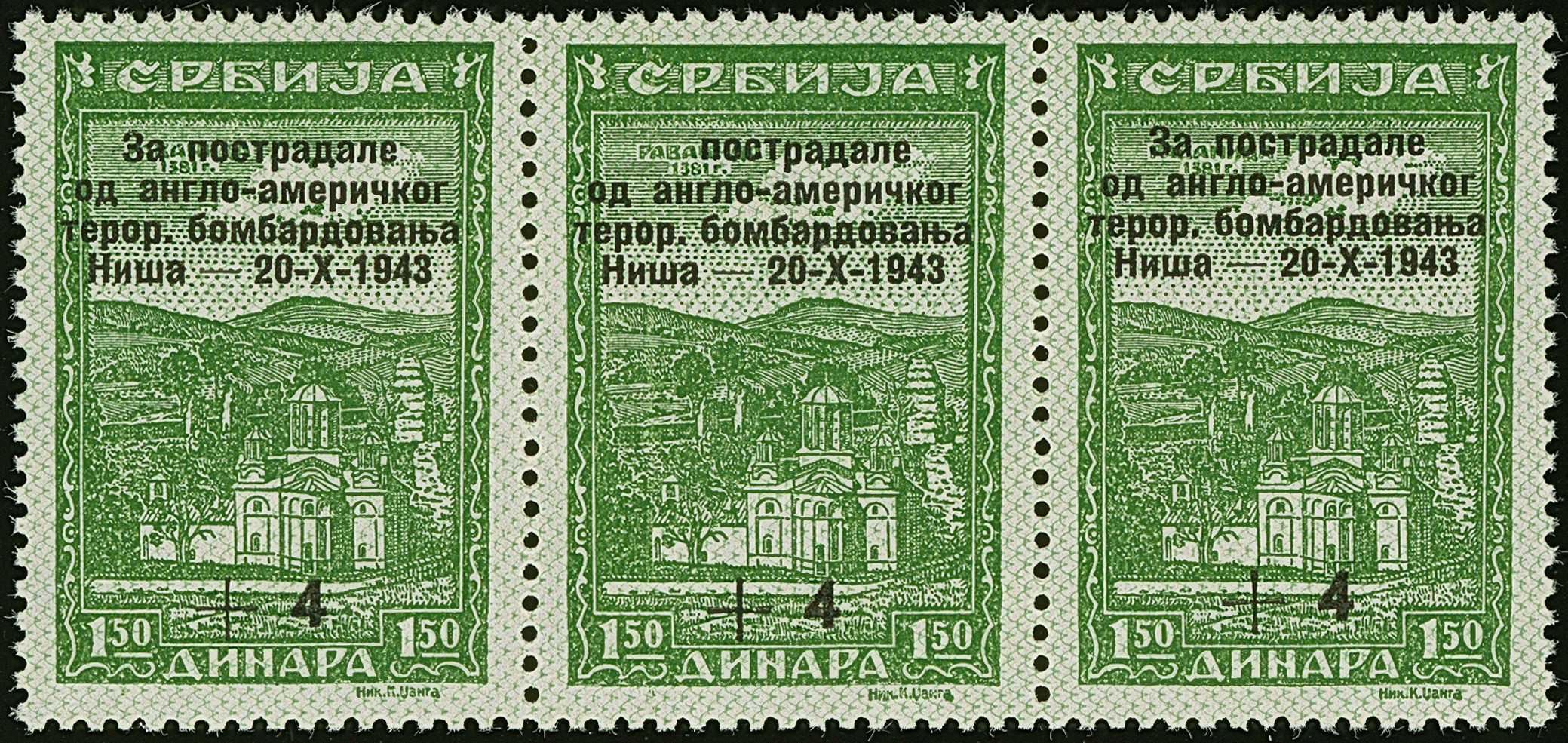 1941, Bombengeschädigte in Nis 1,50+4 Dinar grün, waagerechter Dreierstreifen, die mittlere Marke  mit Aufdruckabart “erstes Aufdruckwort fehlt vollständig, 1. Silbe des 2. Wortes höherstehend”, postfrisch, tadellos, unsigniert mit Befund Kleymann BPP (2012)