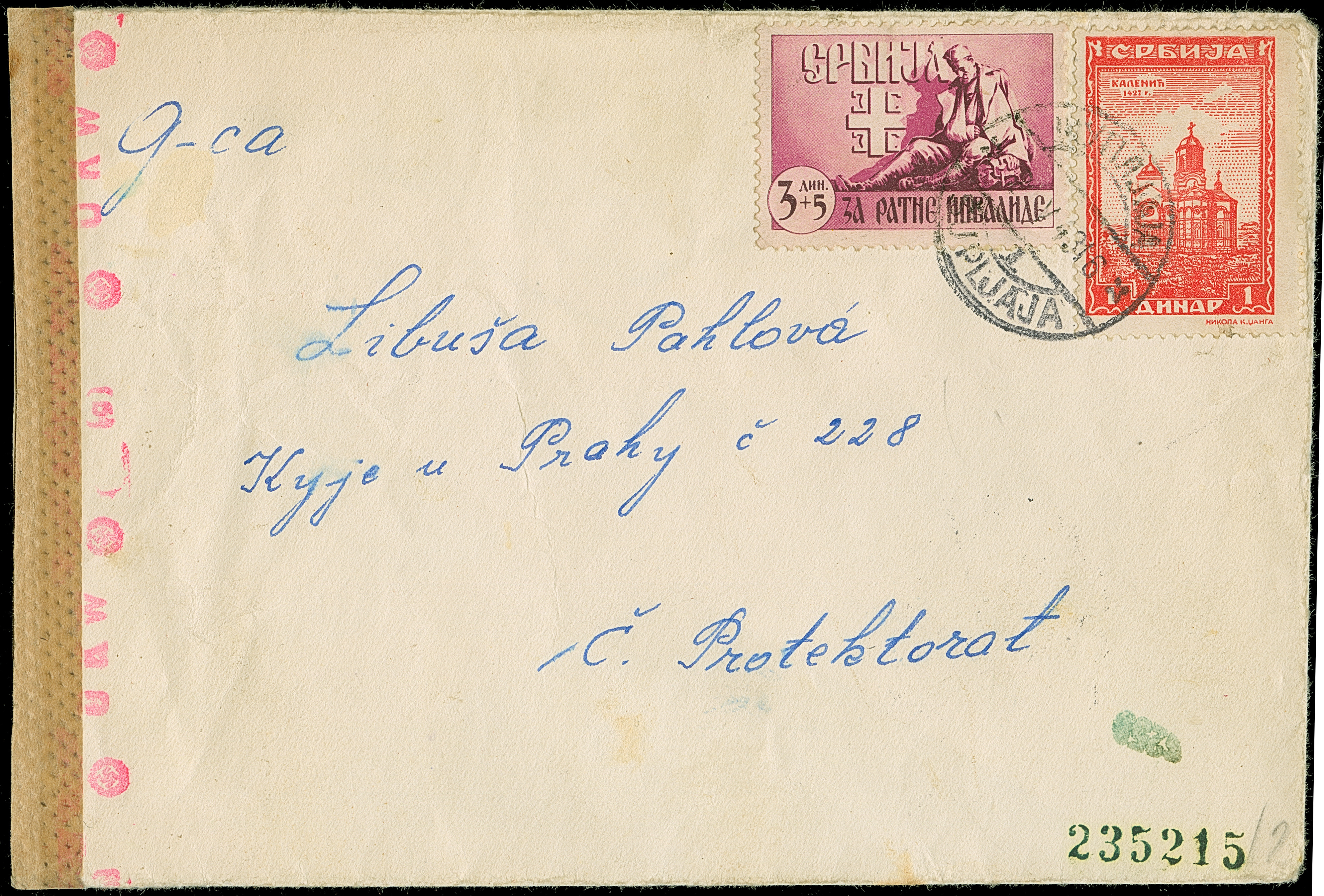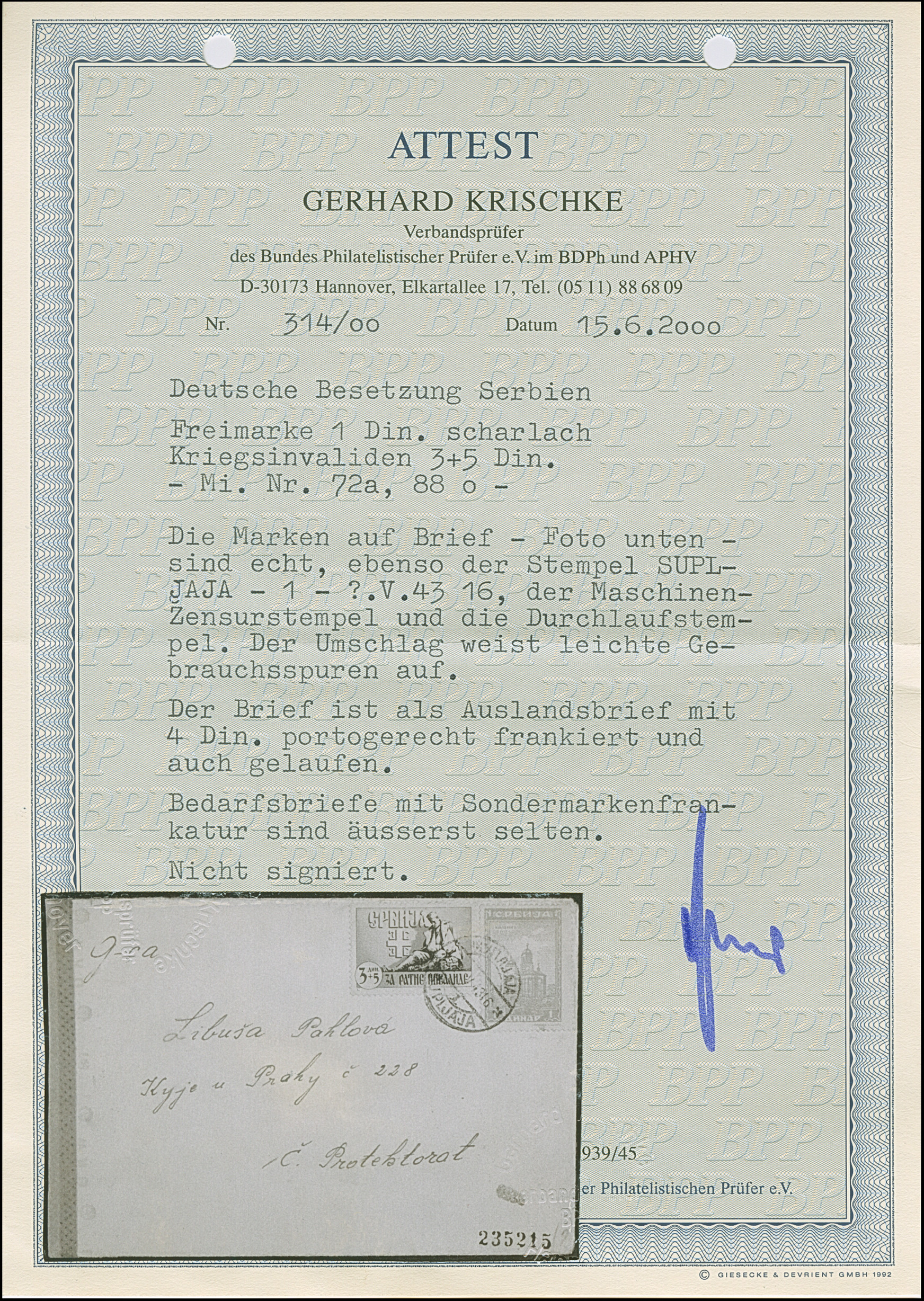 1943, Kriegsinvaliden 3+5 Dinar mit Klöster 1 Dinar, mit Stempel “SUPLJAJA .V.43” auf portogerechtem Auslandsbrief nach Prag im Protektorat Böhmen und Mähren, links mit OKW-Zensur, leichte Bedafsspuren, ein sehr seltener, mit Sondermarken frankierter Brief, Fotoattest Krischke BPP (2000)