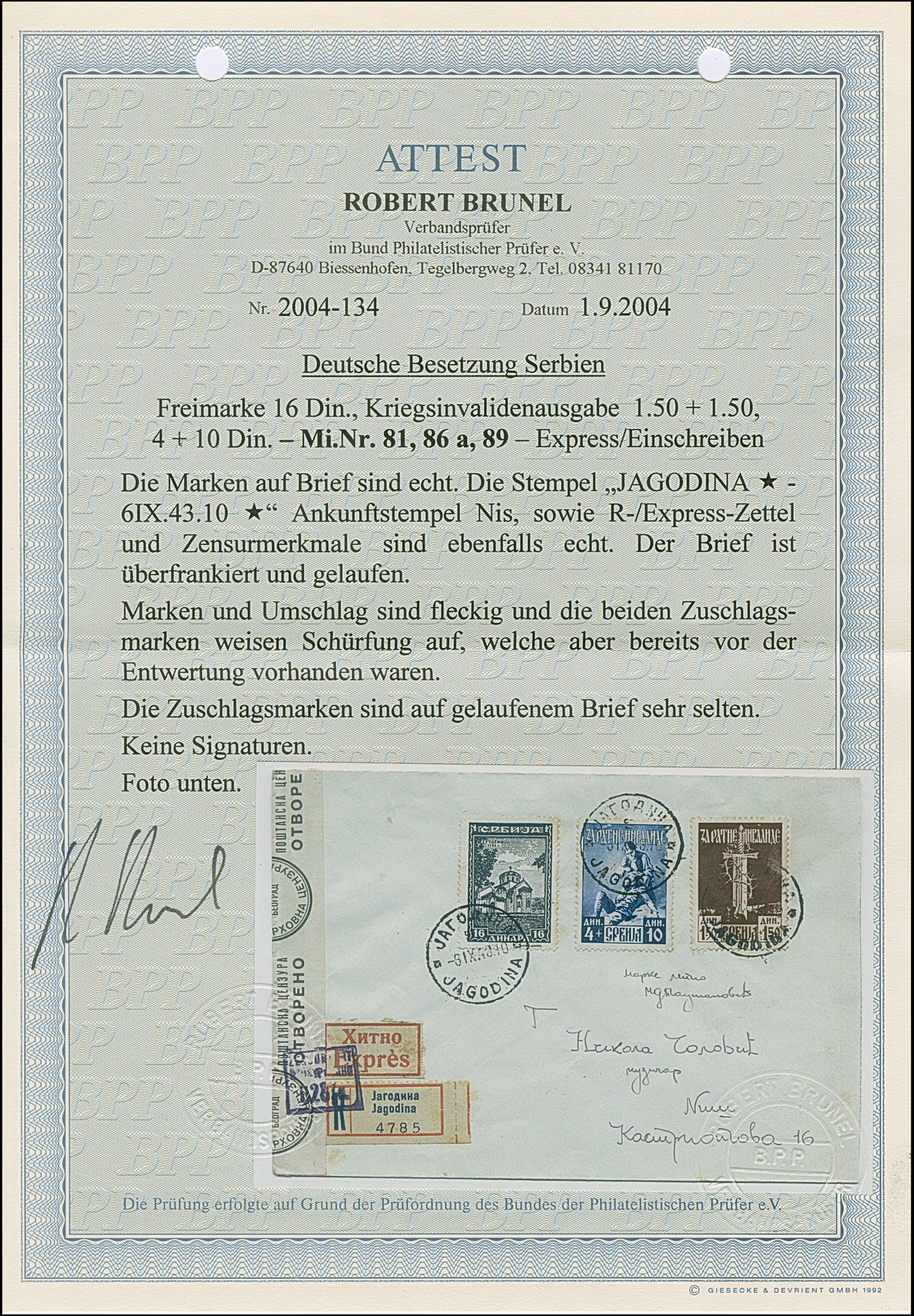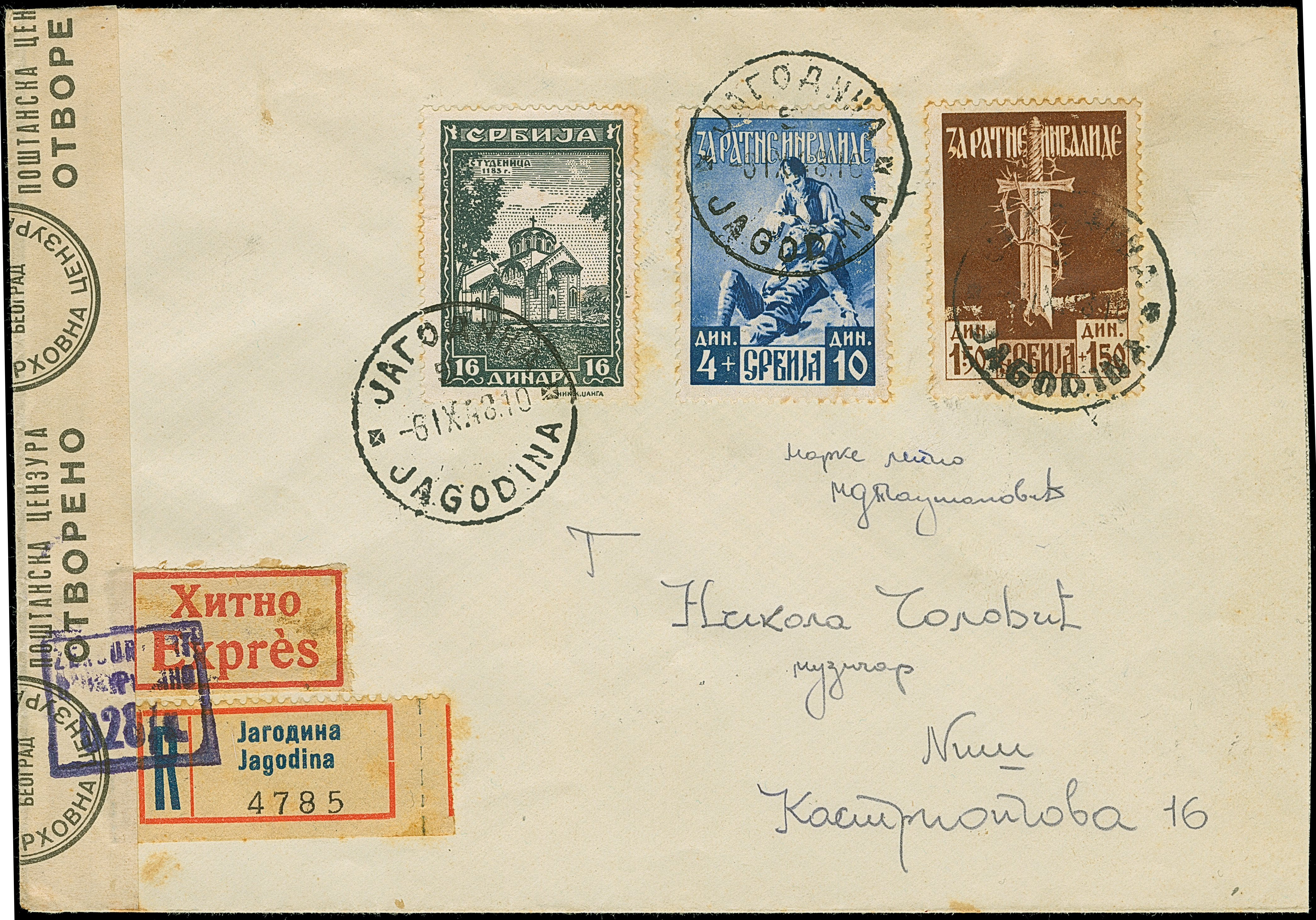 1943, Kriegsinvaliden 1,50+1,50 sowie 4+10 Dinar, mit Zufrankatur Klöster 16 Dinar, mit Stempel “JAGODINA 6.IX.43” auf Eil-R-Brief mit Zensurstreifen nach Nis mit Ankunftsstempel, etwas fleckig, ein seltener Brief, Fotoattest Brunel BPP (2004)