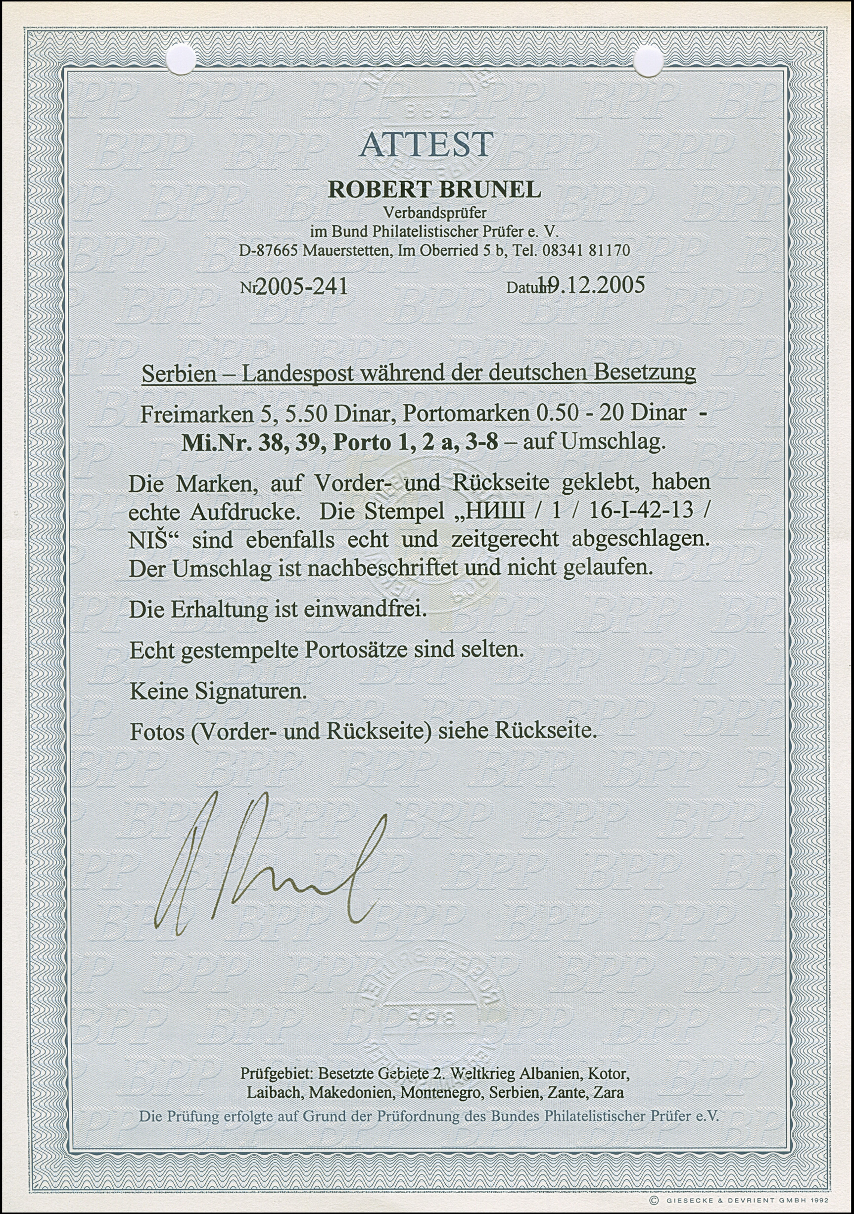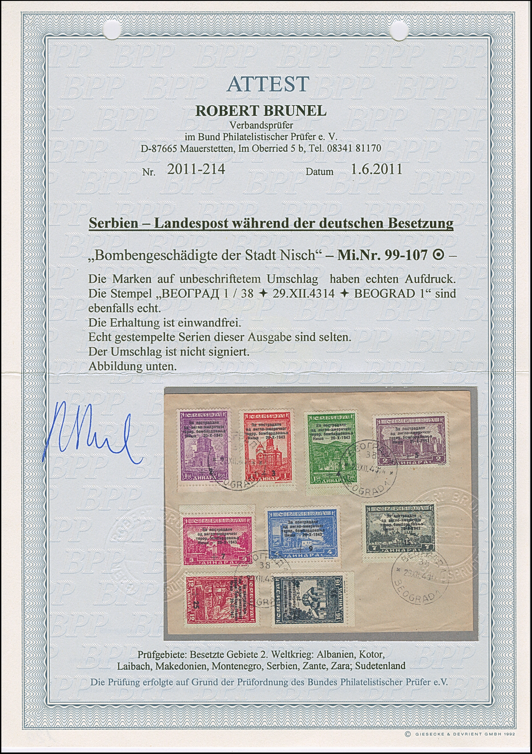 1941, 0,50-20 Dinar sowie Freimarken König Peter II. 5 und 5,50 Dinar, vorder- und rückseitig, sauber mit Stempel “NIS 16.I.42” auf beschriftetem Umschlag, tadellos, gestempelte Sätze sind sehr selten, Fotoattest Brunel BPP (2005)