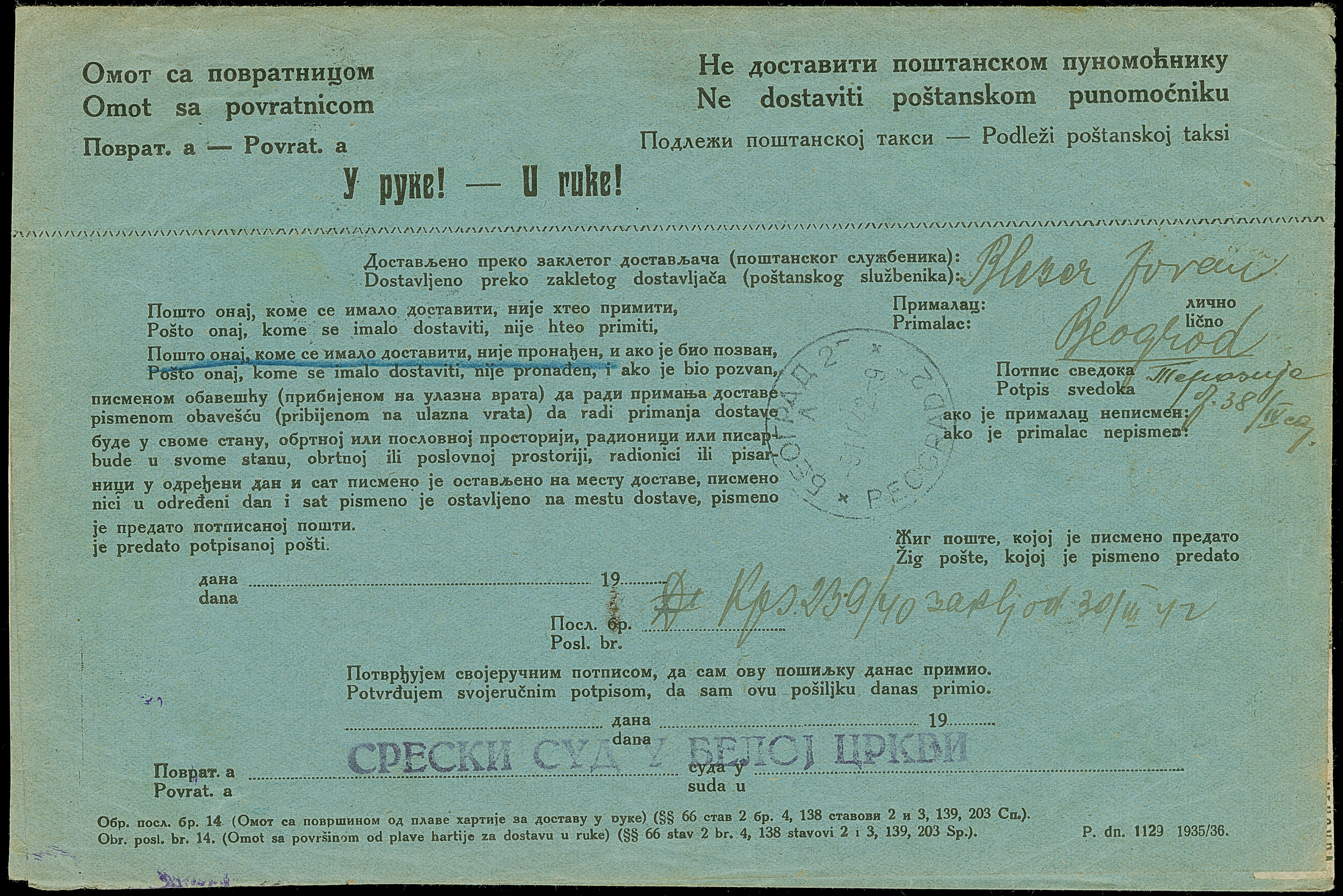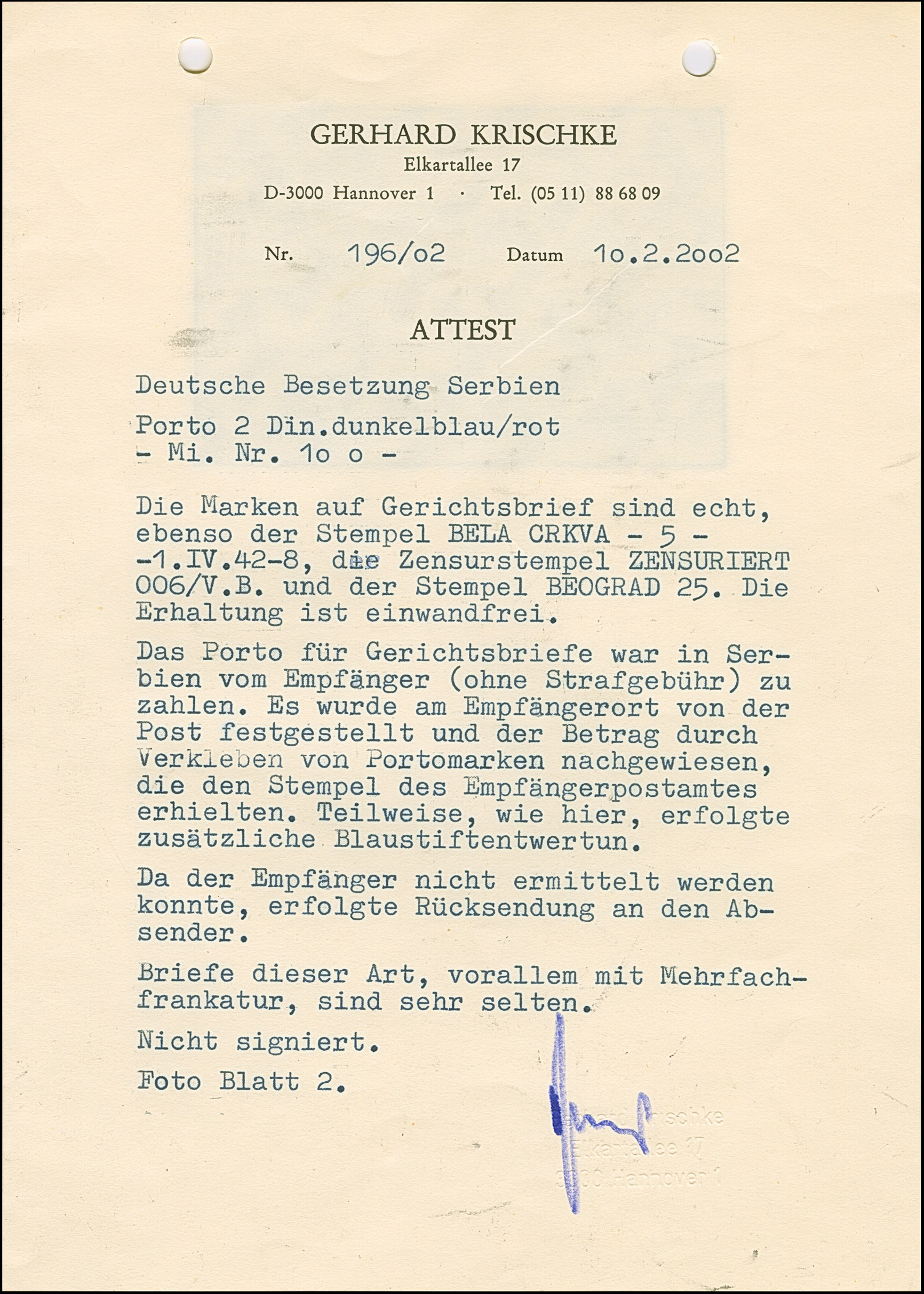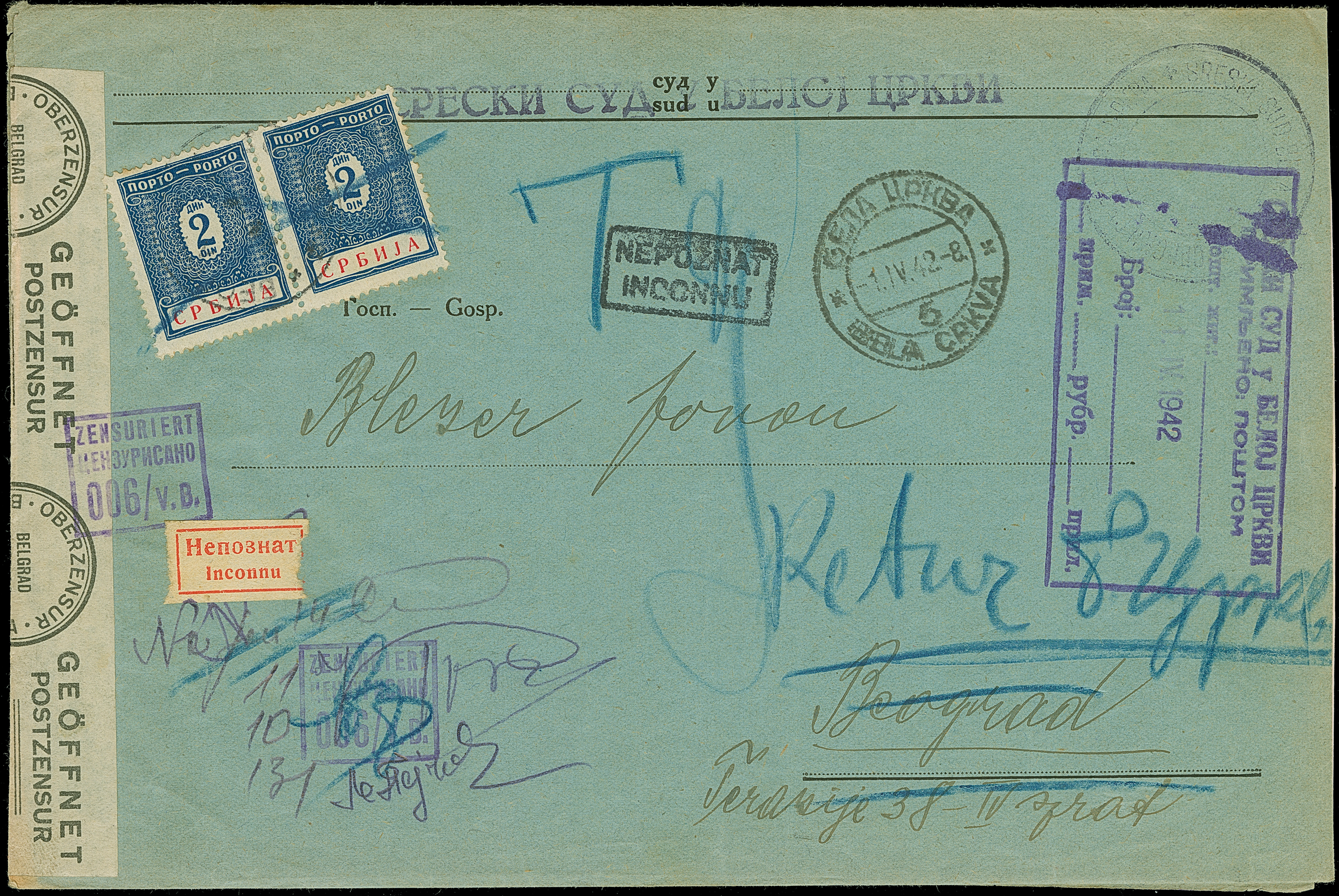 1942, Ziffern 2 Dinar, waagerechtes Paar, sauber mit Stempel und Blaustiftentwertung auf unfrei aufgegebenem Gerichtsbrief aus “BELA CRKVA 1-IV.42” mit Zensurbanderole nach Belgrad, dort nicht zustellbar mit Hinweisstempel und Aufkleber und anschließend retour gesandt. Da das Porto vom Empfänger nicht eingezogen werden konnte, sind die Marken mit Blaustift annulliert worden. Ein sehr interessanter und außergewöhnlicher Brief, besonders als Mehrfachfrankatur, Fotoattest Krischke BPP (2002)